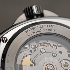 Il fondello è tenuto in sede da 4 viti e sulla cornice circolare con finitura satinata sono incise varie informazioni. Qui troviamo anche il dato sull’impermeabilità fino a 100m di profondità, una specifica che insieme alla corona a vite rende questo Multifort TV perfetto per un uso spensierato a 360°.
