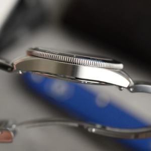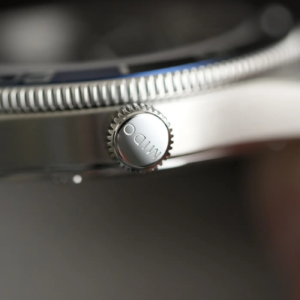 La cassa ha forme classiche e tradizionali e colpisce per il livello molto alto delle finiture. Le satinature sulla parte superiore delle anse e sui fianchi sono molto curate, anche se osservate con la lente macro, e i biselli lucidi brillano quando vengono colpiti dalla luce. Dalla vista laterale si può apprezzare uno spessore ridottissimo per un diver impermeabile fino a 200m di profondità. Naturalmente la corona, lucida e con logo inciso, è a vite e non presenta alcun impuntamento né in apertura né in serraggio.