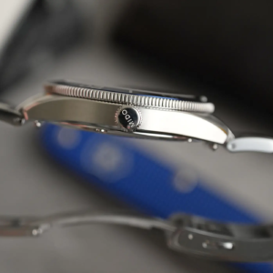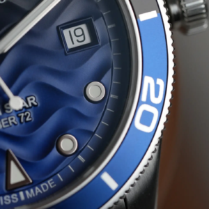 La ghiera rimane ancorata al passato con un inserto in alluminio e, in tutta sincerità, nonostante quadrante modernissimo, sull’Ocean Star 39 non si sente la mancanza della ceramica. Solitamente sui diver le ghiere utilizzano colorazioni a contrasto per i primi 15 o 20 minuti, quindi è insolito vederle divise in due parti simmetriche tra loro. Questo però è sicuramente il modo migliore per seguire l’andamento dei colori del quadrante. L’azionamento è molto piacevole, con un profilo laterale antiscivolo efficace e un meccanismo a 120 scatti precisi e senza giochi.