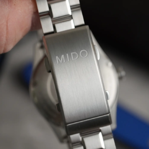 Il bracciale in acciaio si integra perfettamente al design dell’orologio. Le maglie hanno dei profili lucidi ai lati degli elementi centrali, sono tenute insieme da perni a pressione di tipo classico e sono molto mobili le une sulle altre. La chiusura è quella utilizzata da Mido anche su altre referenze, con bracci interni ricavati dal pieno e un’estesione integrata che funziona anche da microregolazione, che aiuta a far fronte alle fisiologiche variazioni della circonferenza del polso nell’arco della giornata. Per mettere a misura il bracciale con maggior precisione ci sono anche delle mezze maglie e ci sono anse a sgancio rapido. Ad essere pignoli, rispetto ad altri bracciali di Mido, questo forse è un po’ più rumoroso.