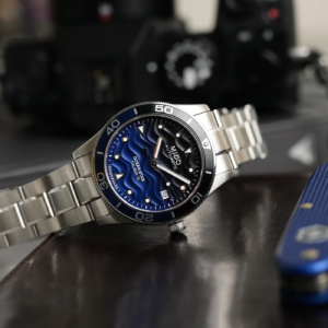Il Mido Ocean Star 39 è disponibile al momento in 4 configurazioni differenti. Sul mercato ci sono parecchi orologi con delle lavorazioni sul quadrante che in modi diversi fanno pensare alle onde del mare. Il risultato ottenuto in questo caso è molto originale e la trama in rilievo, unita alla colorazione quasi metallizzata, risalta tantissimo a seconda delle angolazioni, con il blu e il nero che sfumano uno sull’altro in corrispondenza della metà esatta. Insomma, un quadrante davvero bello e ben riuscito, che però non rischia di essere eccessivamente appariscente. Le scritte sono poche e sono realizzate in rilievo per stampaggio. La data a ore 3 non ha una cornice vera e propria, ma la finestra è comunque ben rifinita con una smussatura che scende in corrispondenza del disco. Gli indici sono applicati e hanno cornici lucide ottimamente realizzate, con quelli a ore 6, 9 e 12 di forma triangolare per facilitare l’orientamento dell’orologio anche in un rapido colpo d’occhio.