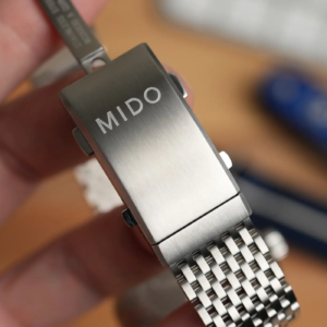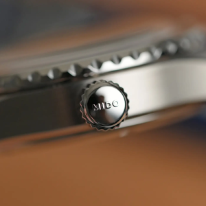 La cassa totalmente lucida si è sempre abbinata bene al design un po’ vintage dei Tribute e dei Decompression Timer, ma non posso fare a meno di sottolineare quanto questo nuovo schema di finiture faccia risaltare al meglio le forme, oltre a tradursi in una qualità percepita ancora superiore. Le anse e i fianchi sono infatti satinati con grande cura e sono separati da dei biselli lucidi. Dalla vista laterale si può apprezzare la lieve curvatura della carrure, tipica di questo design di Mido. Sul fianco destro mancano le spallette a protezione della corona. Questa comunque non sporge troppo, ha il logo in rilievo e naturalmente è a vite, con una filettatura molto precisa si in apertura che in serraggio.