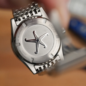 Sul fondello in acciaio c’è la stella marina, il marchio di fabbrica della linea Ocean Star di Mido, gradevole e ben realizzata. Sull’anello esterno, tra le varie informazioni incise, è presente anche il dato sull’impermeabilità fino a 200m.
