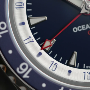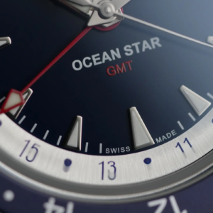 Il quadrante è blu scuro con finitura lucida. Il logo applicato è quello moderno e forse, in questo caso, non ci sarebbe stato male quello in stile vintage che solitamente viene utilizzato su altre referenze più ispirate ai design del passato. Spiccano gli indici che hanno un design inedito all’interno della linea Ocean Star e si ispirano ai denti di squalo. Sono davvero piacevoli e anche il livello delle finiture sulle cornici lucide è molto buono. La data a ore 3 è allineata agli indici e in questo modo dovrebbe anche dare poco fastidio a chi non sopporta questa complicazione sul quadrante. All’esterno della porzione centrale blu c’è un anello argentato con finitura spazzolata sul quale sono riportati i riferimenti dei fusi orari per la funzione GMT.
