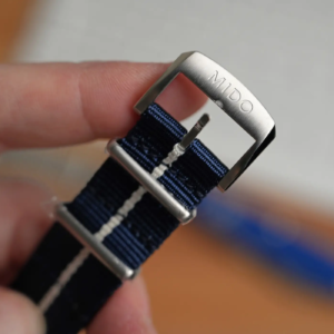 Il cinturino è un NATO in nylon blu con striscia bianca al centro. È molto bello e dà anche l’impressione di essere piuttosto resistente, con tanto di inserto di rinforzo in pelle in corrispondenza dei fori per l’ardiglione e la fibbia in acciaio è personalizzata. Qui fortunatamente sono integrate delle springbar a sgancio rapido. Segnalo che la misura delle anse è da 21mm.