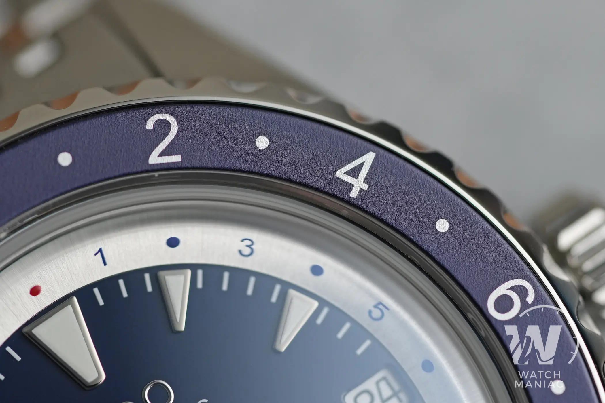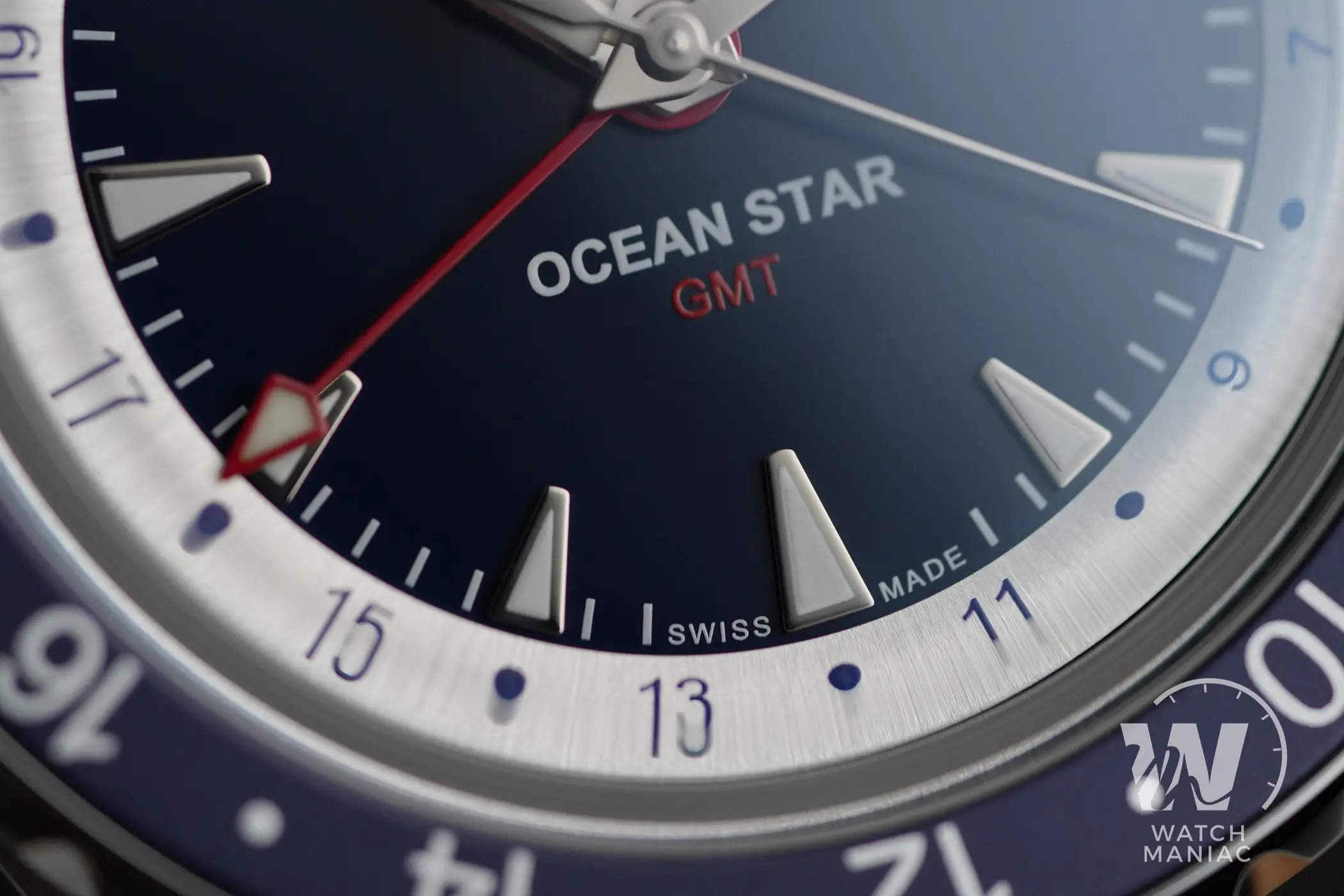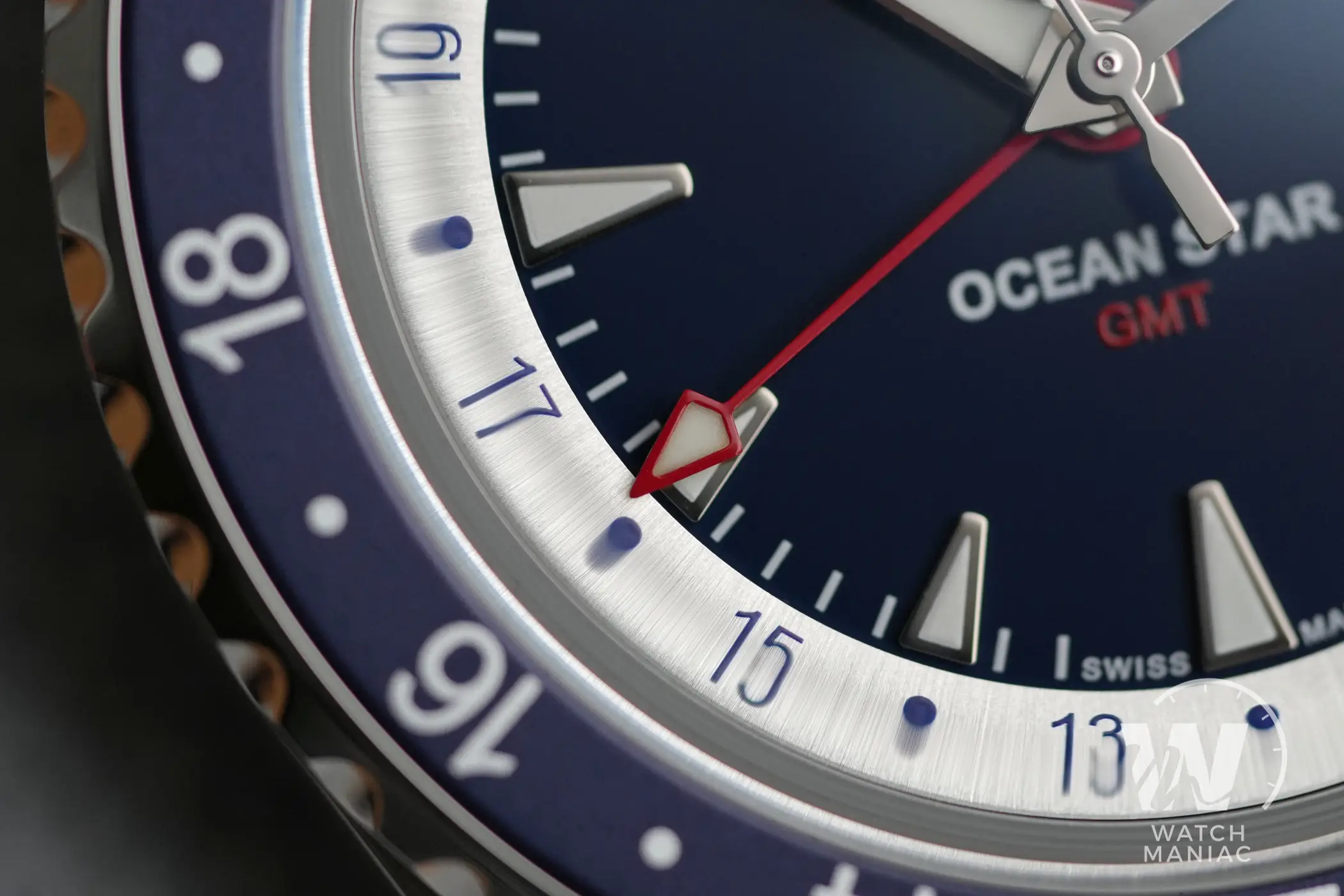 Il quadrante è blu scuro con finitura lucida. Il logo applicato è quello moderno e forse, in questo caso, non ci sarebbe stato male quello in stile vintage che solitamente viene utilizzato su altre referenze più ispirate ai design del passato. Spiccano gli indici che hanno un design inedito all’interno della linea Ocean Star e si ispirano ai denti di squalo. Sono davvero piacevoli e anche il livello delle finiture sulle cornici lucide è molto buono. La data a ore 3 è allineata agli indici e in questo modo dovrebbe anche dare poco fastidio a chi non sopporta questa complicazione sul quadrante. All’esterno della porzione centrale blu c’è un anello argentato con finitura spazzolata sul quale sono riportati i riferimenti dei fusi orari per la funzione GMT.