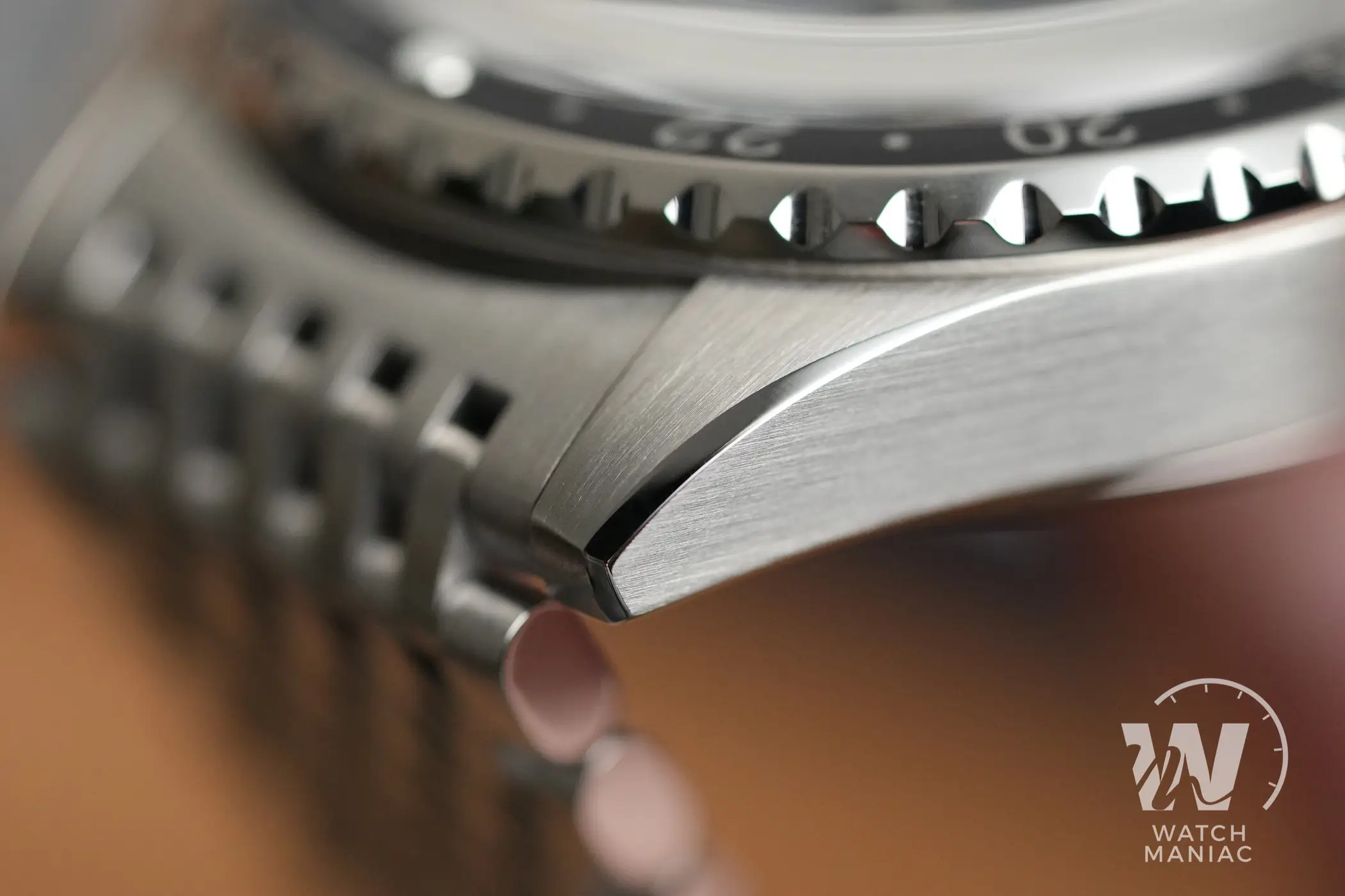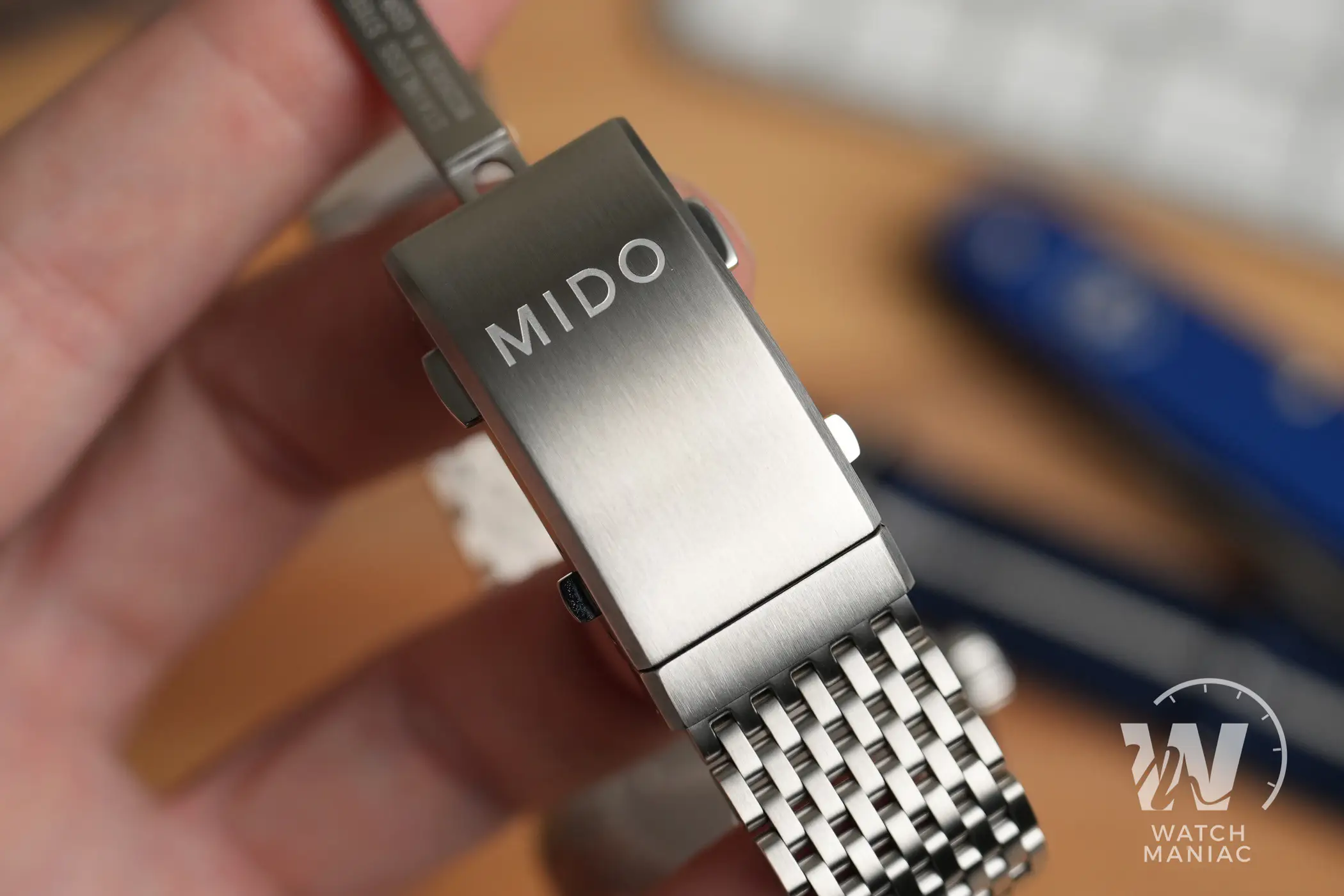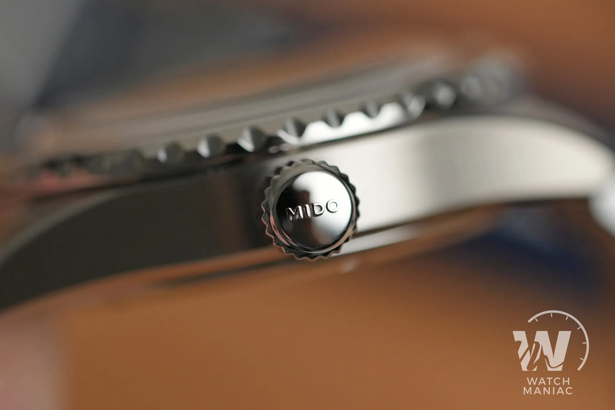 La cassa totalmente lucida si è sempre abbinata bene al design un po’ vintage dei Tribute e dei Decompression Timer, ma non posso fare a meno di sottolineare quanto questo nuovo schema di finiture faccia risaltare al meglio le forme, oltre a tradursi in una qualità percepita ancora superiore. Le anse e i fianchi sono infatti satinati con grande cura e sono separati da dei biselli lucidi. Dalla vista laterale si può apprezzare la lieve curvatura della carrure, tipica di questo design di Mido. Sul fianco destro mancano le spallette a protezione della corona. Questa comunque non sporge troppo, ha il logo in rilievo e naturalmente è a vite, con una filettatura molto precisa si in apertura che in serraggio.