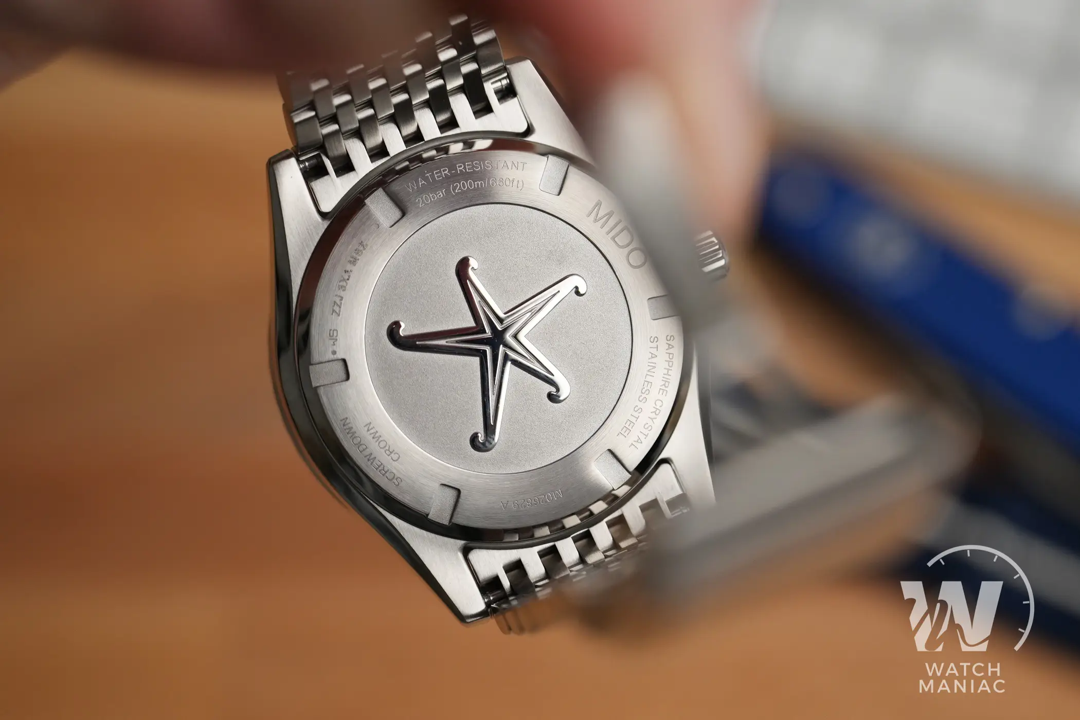 Sul fondello in acciaio c’è la stella marina, il marchio di fabbrica della linea Ocean Star di Mido, gradevole e ben realizzata. Sull’anello esterno, tra le varie informazioni incise, è presente anche il dato sull’impermeabilità fino a 200m.