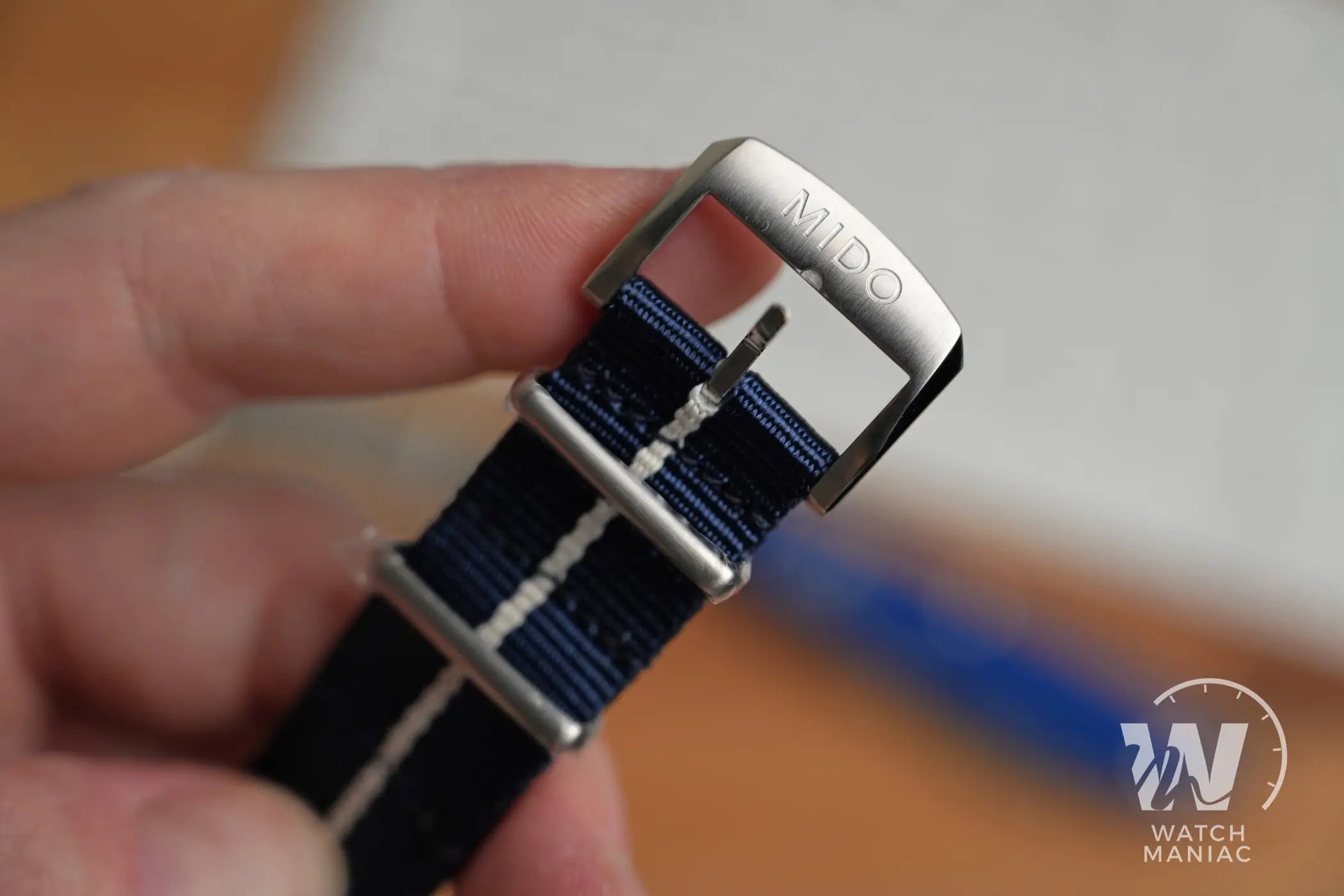 Il cinturino è un NATO in nylon blu con striscia bianca al centro. È molto bello e dà anche l’impressione di essere piuttosto resistente, con tanto di inserto di rinforzo in pelle in corrispondenza dei fori per l’ardiglione e la fibbia in acciaio è personalizzata. Qui fortunatamente sono integrate delle springbar a sgancio rapido. Segnalo che la misura delle anse è da 21mm.