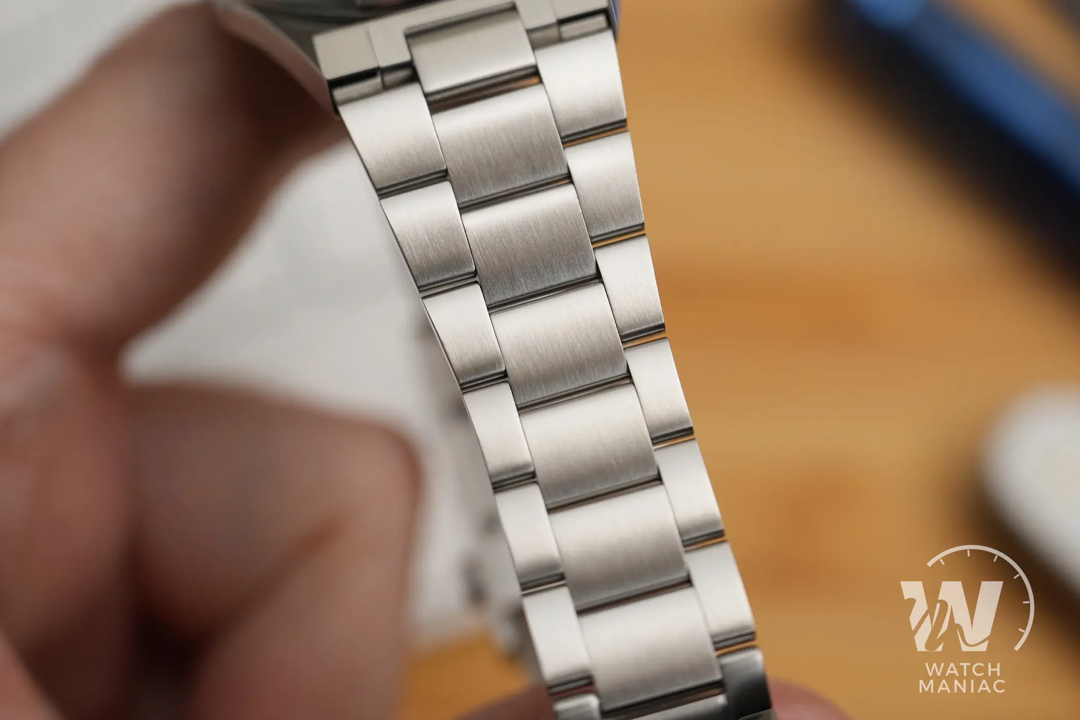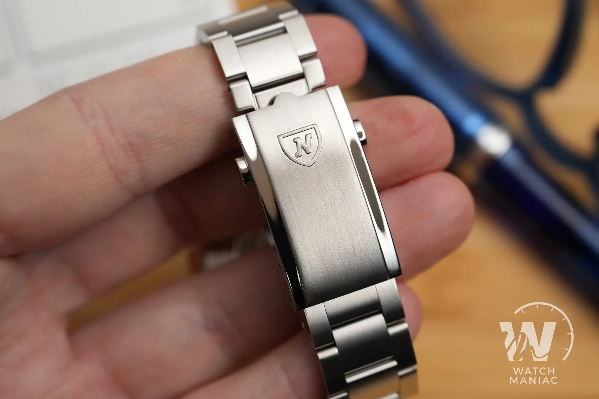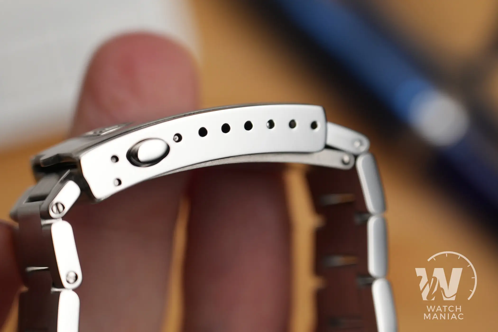 Il bracciale ha un design semplice che ricorda un po’ l’Oyster, anche se le prime maglie sono molto diverse con elementi laterali più larghi per raccordarsi meglio alla cassa. Rispetto ai bracciali di altri orologi gentiani in questa fascia di prezzo, pur mantenendo un buon livello di solidità, è tra i più leggeri. Le maglie sono tenute insieme da perni a vite e sono molto flessibili le une sulle altre. Nivada ha poi migliorato enormemente la chiusura rispetto a quella utilizzata precedentemente sugli altri modelli. Qui i bracci interni sono ricavati dal pieno e, soprattutto, la scatoletta ha i pulsanti laterali di sgancio. La soluzione è meno elegante rispetto alla doppia deployante, presente sulla maggior parte degli orologi di questa tipologia, ma è certamente molto più pratica grazie ai fori per la microregolazione (che sono addirittura 7).