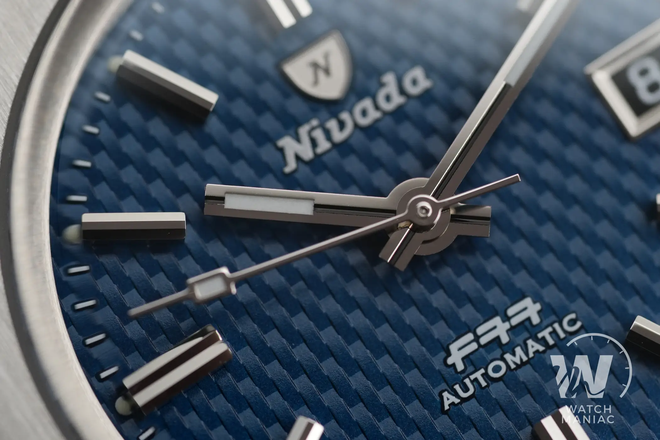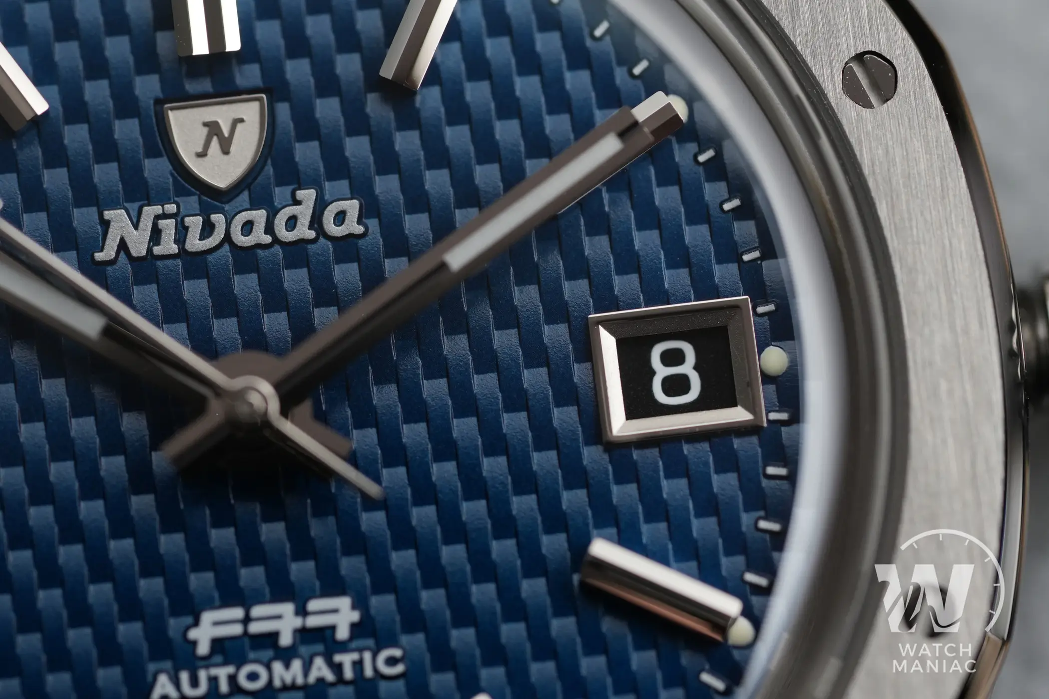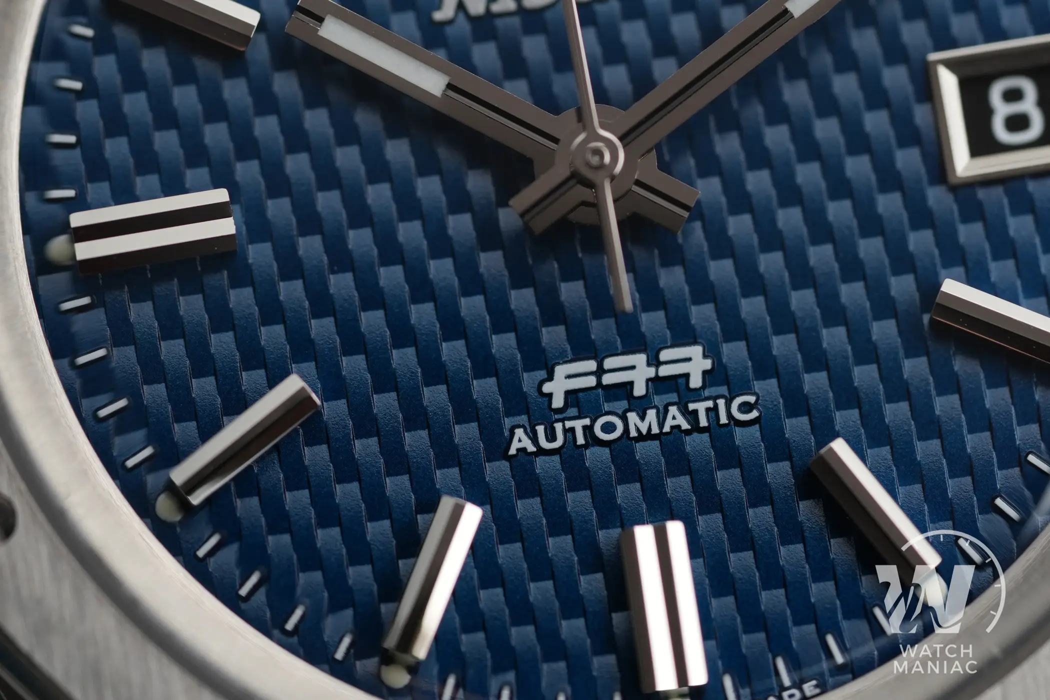 Nel 1977 Nivada aveva deciso di omaggiare in modo abbastanza evidente il Royal Oak a livello della lunetta, che anche sulla riedizione del F77 si distingue subito sia per la sua forma ottagonale che per le 8 viti. A parte questo dettaglio, che comunque ha delle proporzioni diverse visto che qui la lunetta è molto meno massiccia, la cassa ha linee completamente differenti e molto originali. In particolare nella zona delle anse, con delle evidenti faccette oblique di forma triangolare ai lati e un andamento spiovente per raccordarsi al bracciale. Le finiture sono molto curate, con stacchi netti tra le bellissime satinature e i dettagli lucidi sia sulla lunetta che sulla cassa. La carrure è lucida sui fianchi, un dettaglio in linea con i modelli vintage, ma con finitura satinata avrebbe fatto risaltare ancora di più le faccette sulle anse.