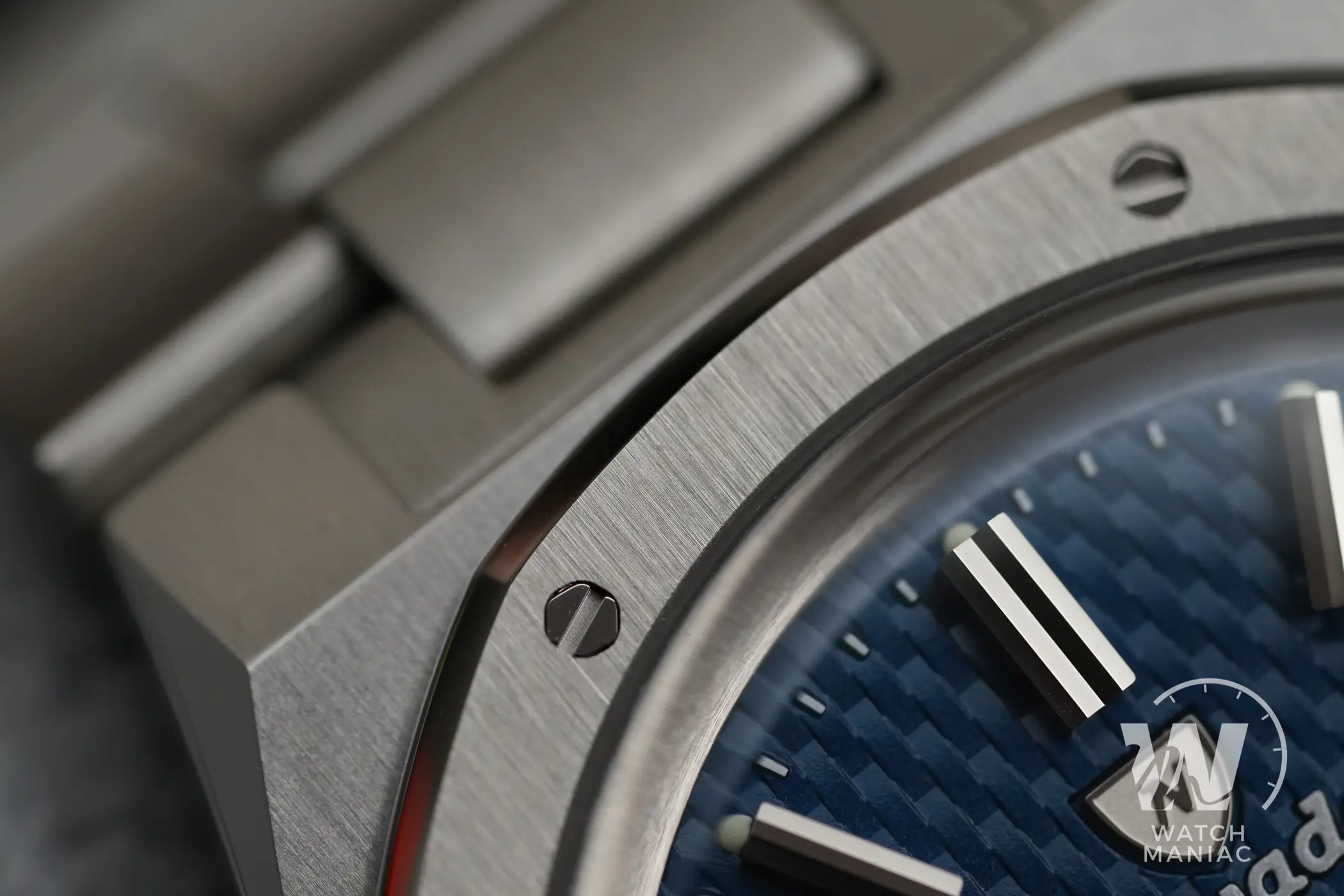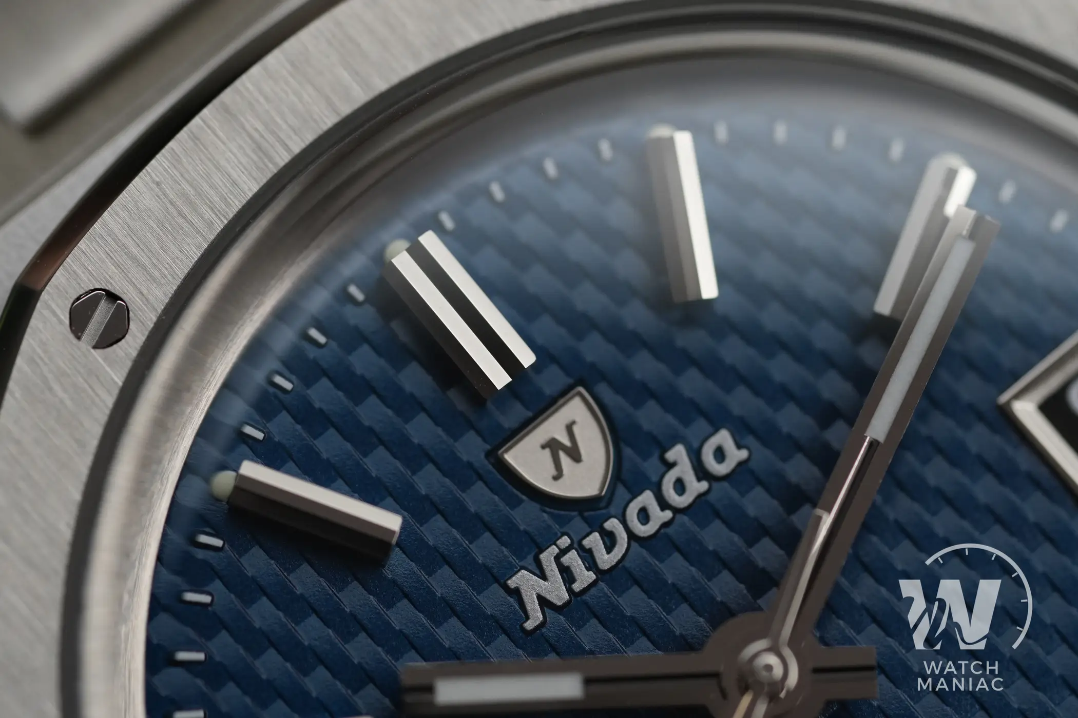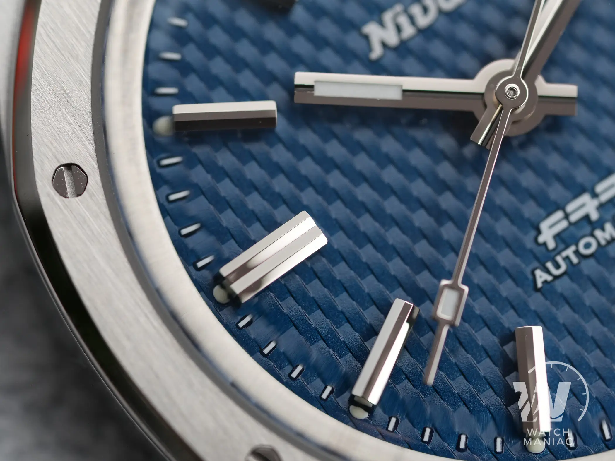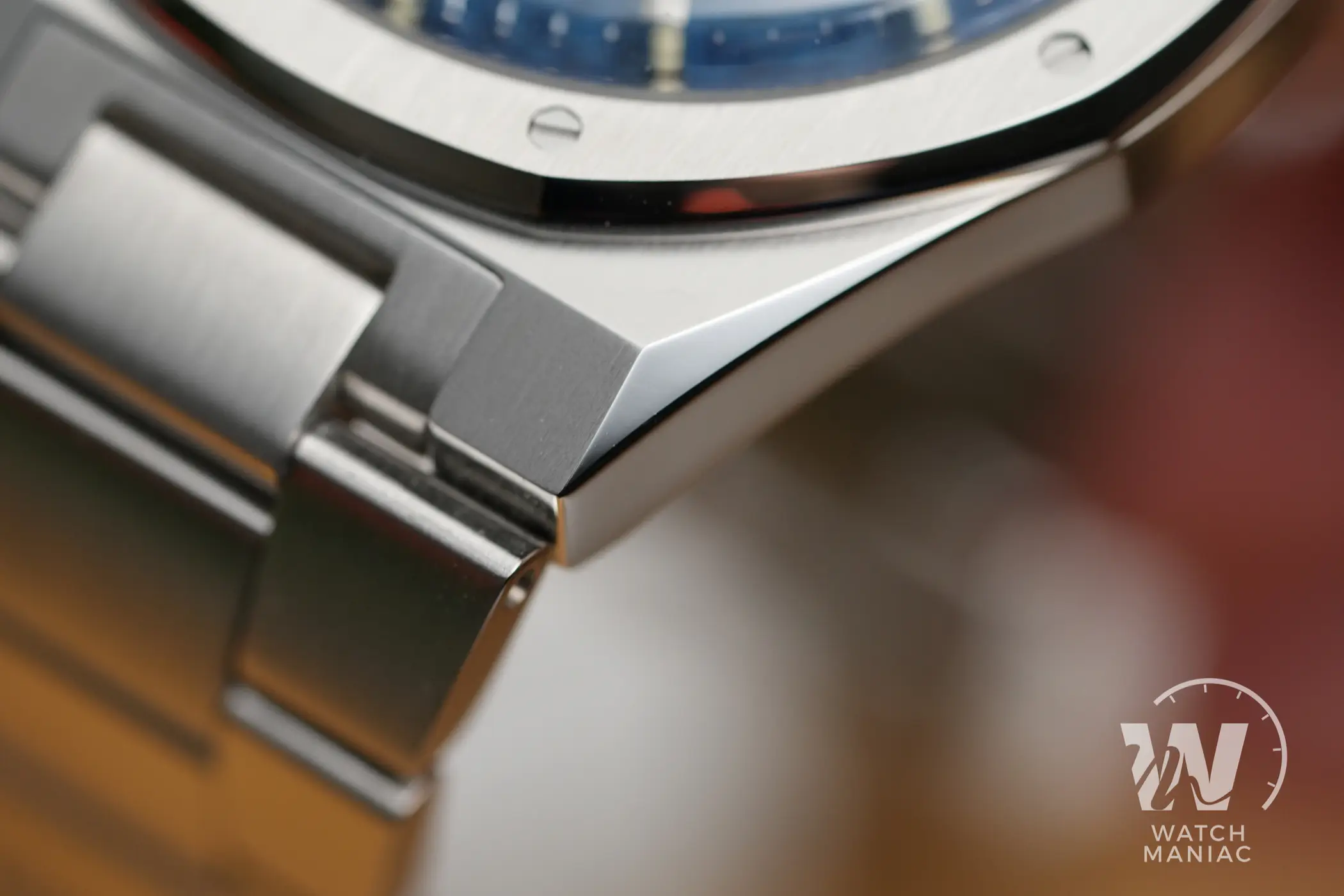 Nel 1977 Nivada aveva deciso di omaggiare in modo abbastanza evidente il Royal Oak a livello della lunetta, che anche sulla riedizione del F77 si distingue subito sia per la sua forma ottagonale che per le 8 viti. A parte questo dettaglio, che comunque ha delle proporzioni diverse visto che qui la lunetta è molto meno massiccia, la cassa ha linee completamente differenti e molto originali. In particolare nella zona delle anse, con delle evidenti faccette oblique di forma triangolare ai lati e un andamento spiovente per raccordarsi al bracciale. Le finiture sono molto curate, con stacchi netti tra le bellissime satinature e i dettagli lucidi sia sulla lunetta che sulla cassa. La carrure è lucida sui fianchi, un dettaglio in linea con i modelli vintage, ma con finitura satinata avrebbe fatto risaltare ancora di più le faccette sulle anse.