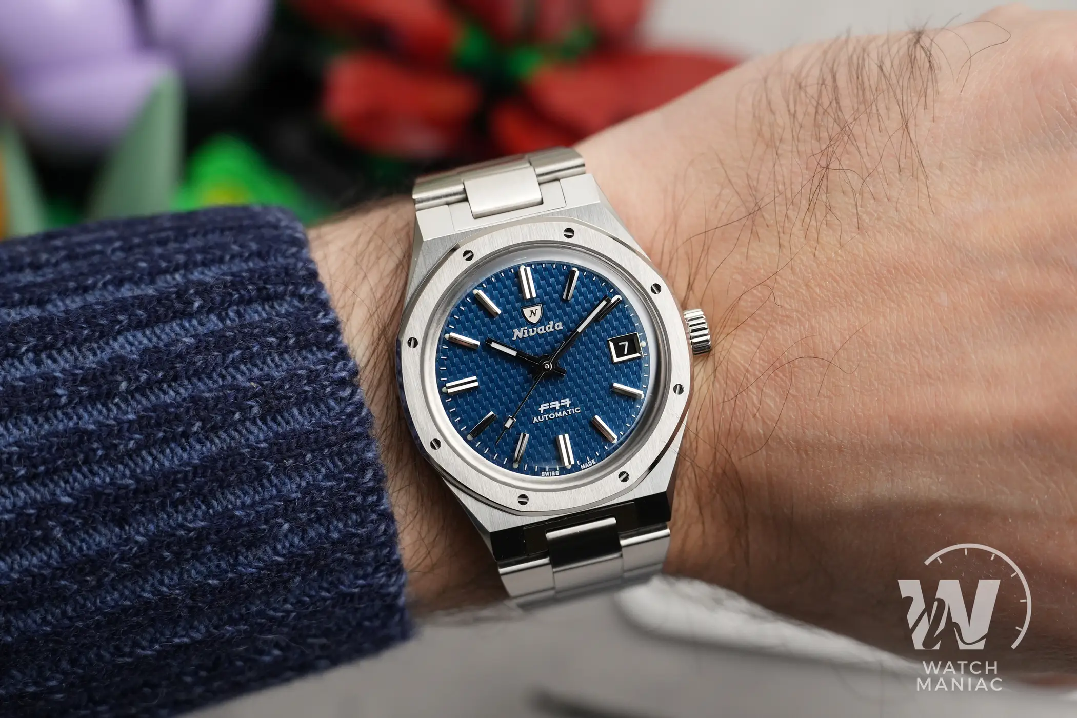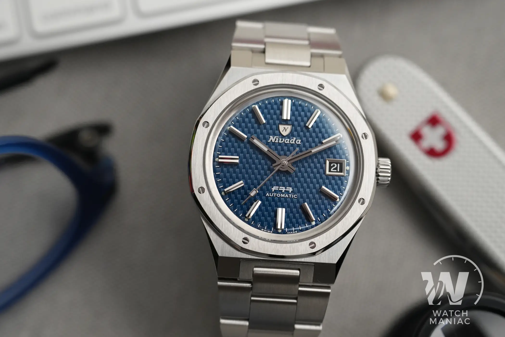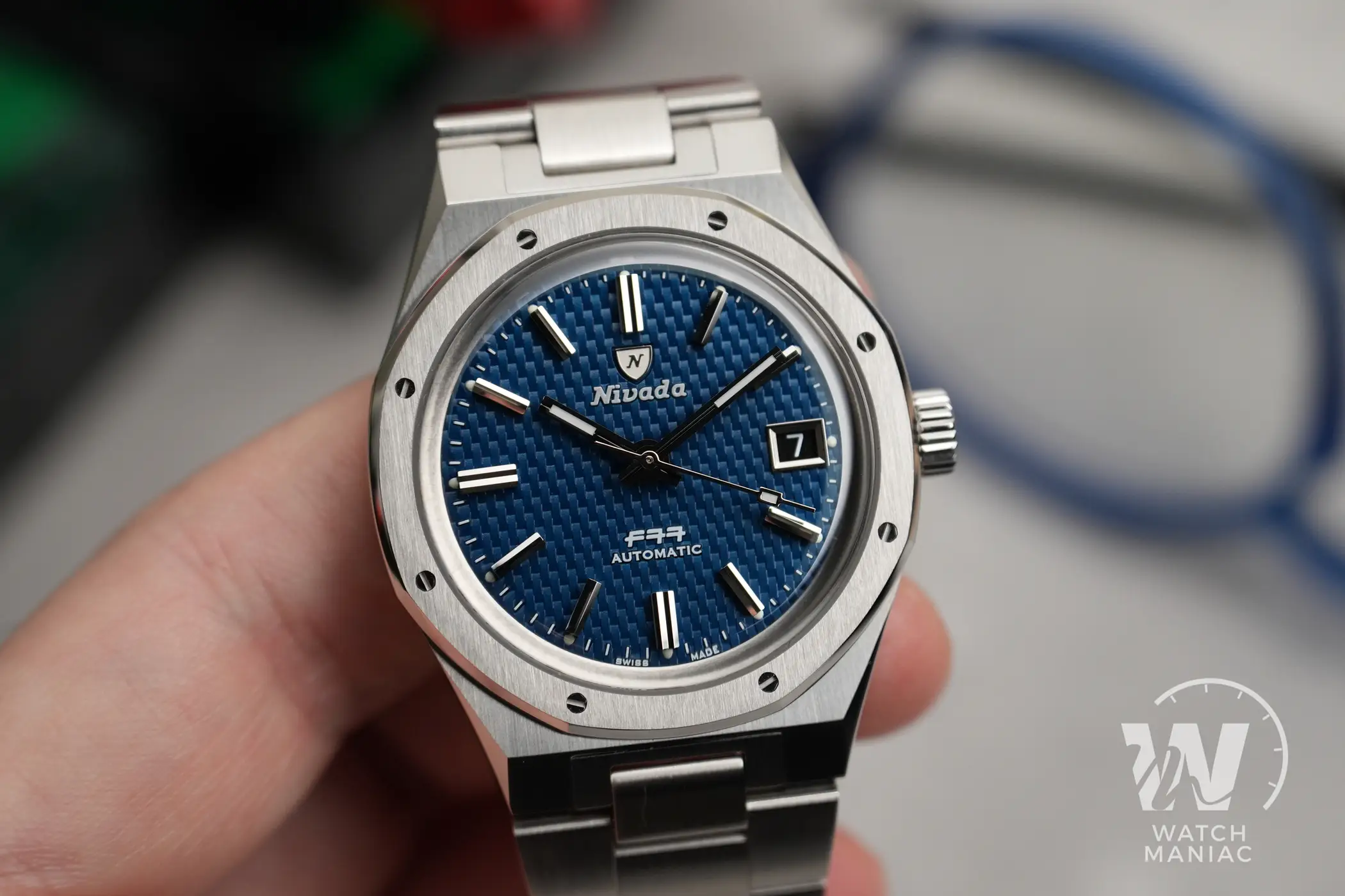La moda degli sportivi anni ’70 con bracciale integrato ha influenzato le scelte di moltissimi marchi, praticamente in ogni fascia di prezzo. Alcuni non hanno potuto fare a meno di creare dei modelli partendo da zero, dato che in passato o non esistevano ancora o non avevano mai inserito a catalogo modelli di questo genere. Altri però hanno puntato sulla riedizione di loro referenze vintage, ridando vita a dei design ormai archiviati da tempo. Nivada Grenchen, che dal rilancio ha costruito gran parte della sua attuale fortuna sulla riedizione di referenze storiche, a inizio 2023 ha ridato vita al suo F77. L’approccio nel riproporre questo design in chiave moderna è stato molto conservativo, dato che persino il diametro è rimasto lo stesso dell’orologio presentato nel 1977.