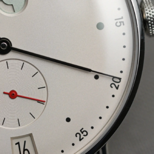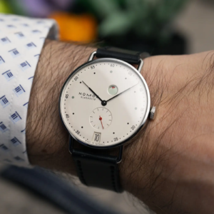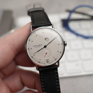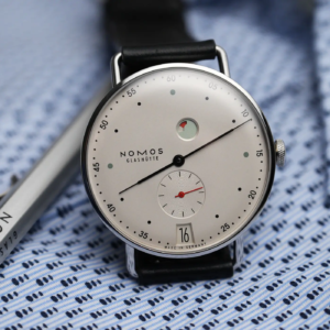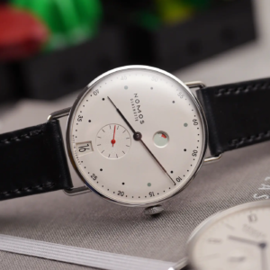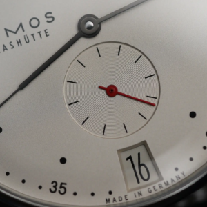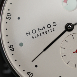 Il Metro è stato presentato nel 2014 come reinterpretazione in chiave moderna dello stile classico di Glashütte. Il primo modello all’interno di questa linea è stato proprio l’1101, nato dalla mente del designer berlinese Mark Braun e grazie al quale Nomos ha ottenuto vari premi e riconoscimenti. Il quadrante, nella classica colorazione argento/champagne molto frequente nel catalogo del produttore tedesco, presenta una grafica molto diversa rispetto a quella del Tangente, la più nota del marchio. Gli amanti della simmetria dovranno certamente guardare altrove, ma uno degli elementi più caratteristici di questo modello è proprio la posizione inusuale in cui sono posizionati il logo, a ore 9, e l’indicatore della riserva di carica in alto. Si tratta di un sistema decisamente ingegnoso di rappresentare lo stato di carica del movimento. In pratica il rosso diventa sempre più evidente man mano che l’autonomia residua si riduce. A carica completa, invece, il rosso dell’indicatore è completamente nascoso.