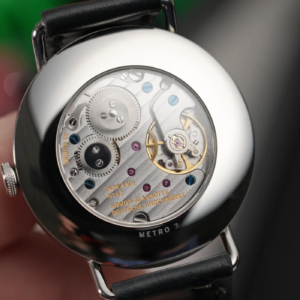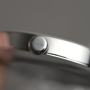 La corona a ore 3 è a pressione, ha il marchio inciso al laser e presenta una lavorazione antiscivolo che si ispira a quella presente sui cacciaviti da orologiaio. Girando l’orologio, come su ogni Nomos dotato di fondello a vista, è possibile ammirare il movimento all’interno. Sull’anello in acciaio all’esterno sono riportati solo il nome e il numero dell’esemplare. Il Metro è impermeabile solo fino a 3atm di pressione, un dato che certamente richiederà un occhio di riguardo quando si avrà a che fare con l’acqua, ma che comunque è in linea con la tipologia di orologio.