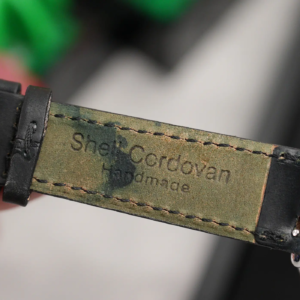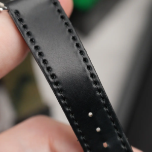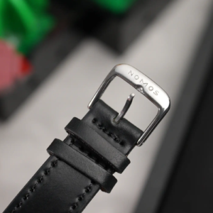 Sul Nomos Metro 1101 il cinturino di serie è quello classico in cordovan nero semilucido con cuciture in tinta. La qualità è sempre altissima, anche perché oltre ad essere un materiale molto flessibile, è anche decisamente resistente. La fibbia è di tipo tradizionale ad ardiglione, con finitura lucida e marchio inciso.
