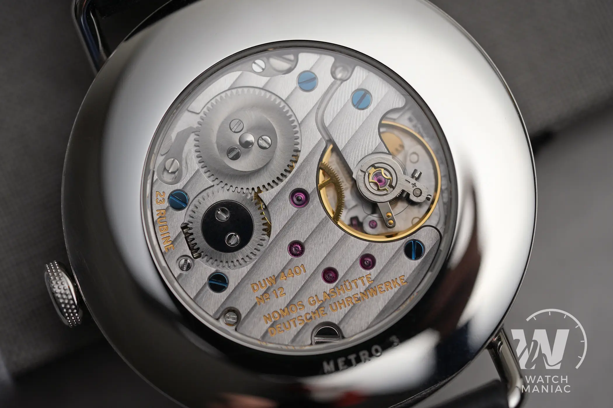 Il calibro all’interno del Metro 1101 è il DUW 4401, il primo in cui è stato installato il Nomos Swing System, lo scappamento proprietario del marchio di Glashütte. Oltre alla presenza dell’indicatore di riserva di carica, decisamente unico, e del disco della data con numeri di dimensioni generose, è splendidamente rifinito con perlage, costolatura, un accenno di anglage sui ponti e viti blu trattate termicamente. Per la regolazione della data non è presente il meccanismo di selezione rapida, ma è necessario ruotare le sfere. La frequenza è di 21.600a/h, la riserva di carica è di 42 ore ed è presente il fermo macchina.