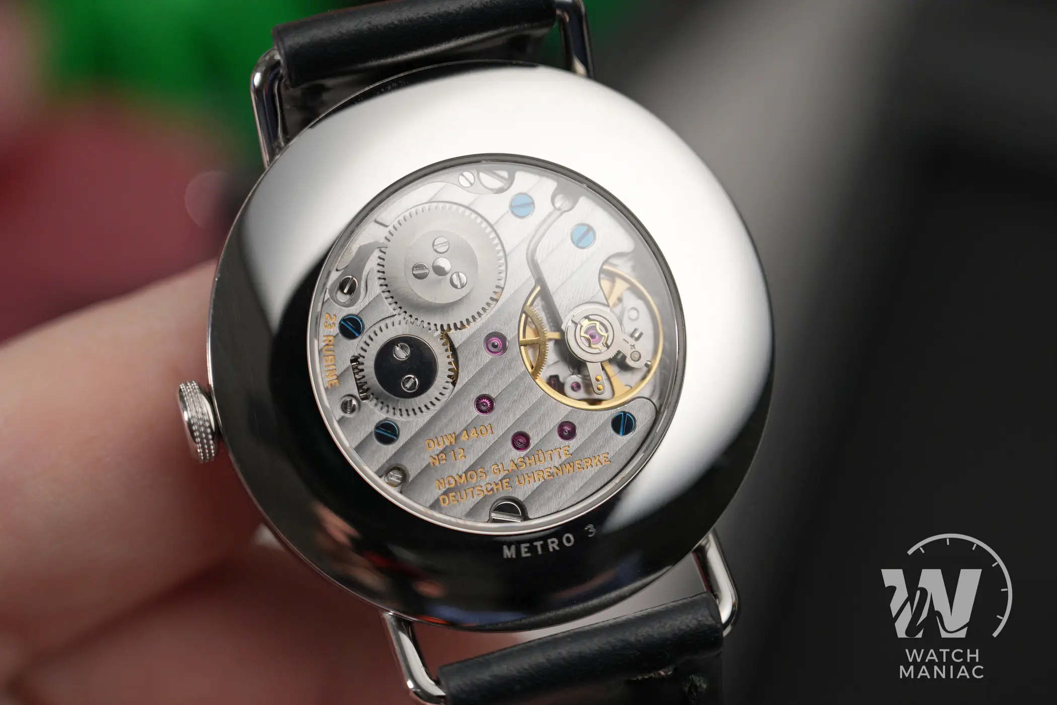 La corona a ore 3 è a pressione, ha il marchio inciso al laser e presenta una lavorazione antiscivolo che si ispira a quella presente sui cacciaviti da orologiaio. Girando l’orologio, come su ogni Nomos dotato di fondello a vista, è possibile ammirare il movimento all’interno. Sull’anello in acciaio all’esterno sono riportati solo il nome e il numero dell’esemplare. Il Metro è impermeabile solo fino a 3atm di pressione, un dato che certamente richiederà un occhio di riguardo quando si avrà a che fare con l’acqua, ma che comunque è in linea con la tipologia di orologio.