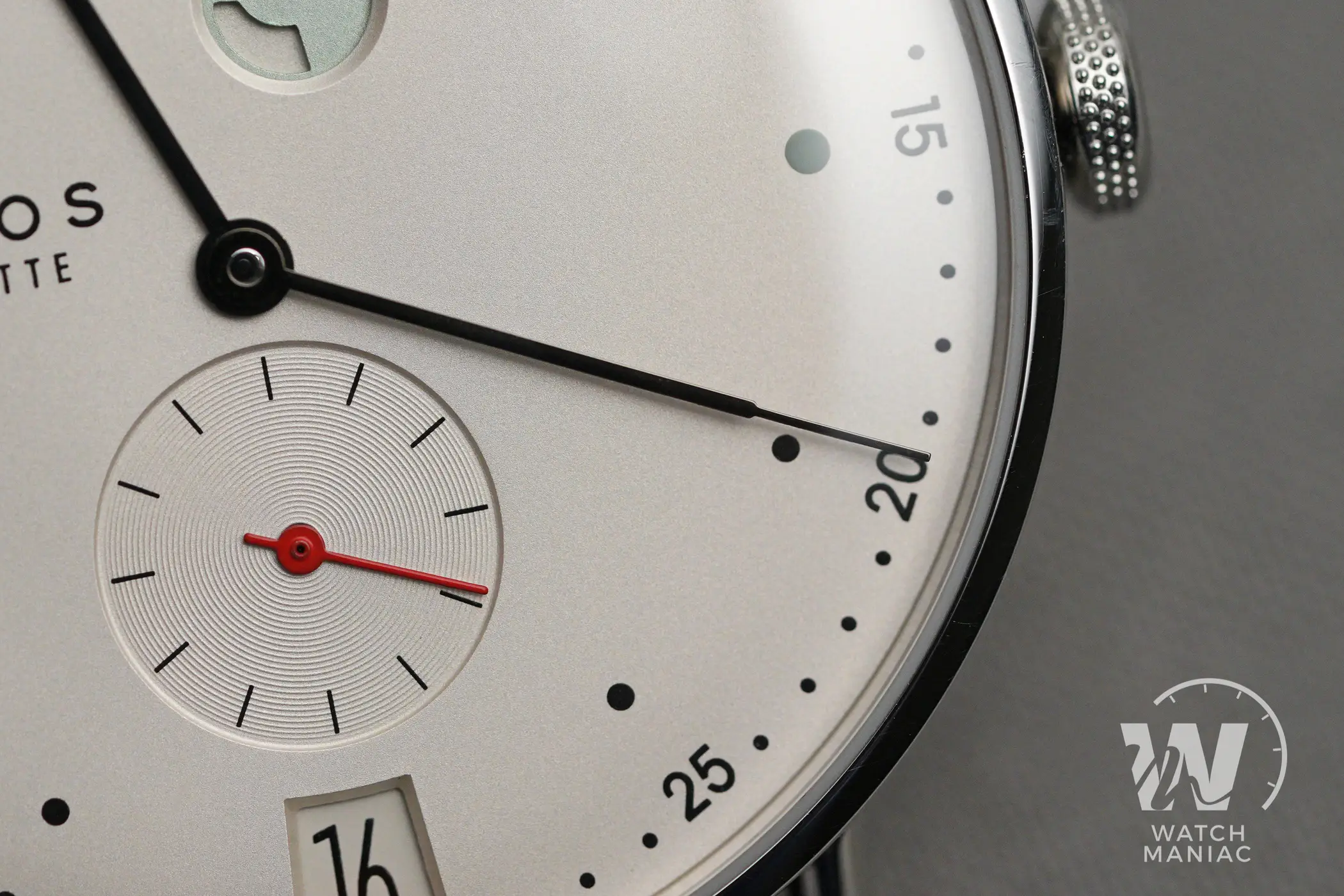 In basso a ore 6 c’è la finestra della data, posizionata nella parte più esterna del quadrante. In questo modo il disco è di dimensioni più grandi e in questo modo anche i numeri risultano essere molto più leggibili rispetto a quanto accade su molti altri movimenti più diffusi. Subito sopra c’è poi la secondina, su un livello lievemente inferiore rispetto a quello principale e con una lavorazione a cerchi concentrici. Qui la piccola lancetta rossa da un tocco di vivacità in più e richiama lo stesso colore presente nell’indicatore della riserva di carica. Gli indici sono realizzati con dei semplici puntini e quelli a ore 3, 9 e 12 sono un po’ più grandi e in colorazione verde. Le sfere sono molto esili e si restringono nella parte terminale, con un design ispirato all’Empire State Building di New York. Nonostante lo spessore decisamente molto limitato, la colorazione nera lucida garantisce una leggibilità perfetta e immediata.