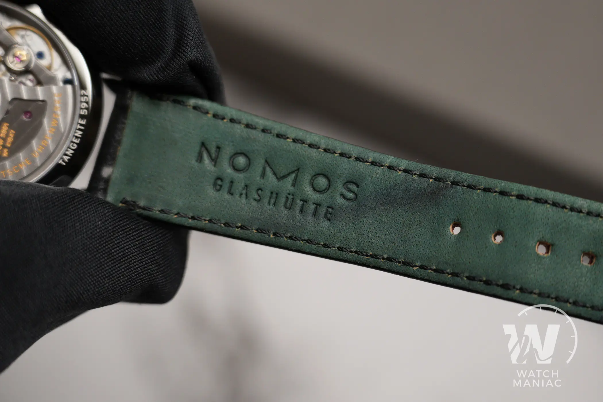 Il cinturino di serie è quello tipico per Nomos, in cuoio nero semilucido. Si sposa bene con l’indole particolarmente elegante di questo Tangente ma, se si vuole cercare di stemperare un po’ il look formale dell’orologio, è possibile optare per altri cinturini, sia tra quelli del catalogo di Nomos che tra quelli di terze parti. La fibbia ad ardiglione in acciaio ha il marchio di Nomos inciso al laser.