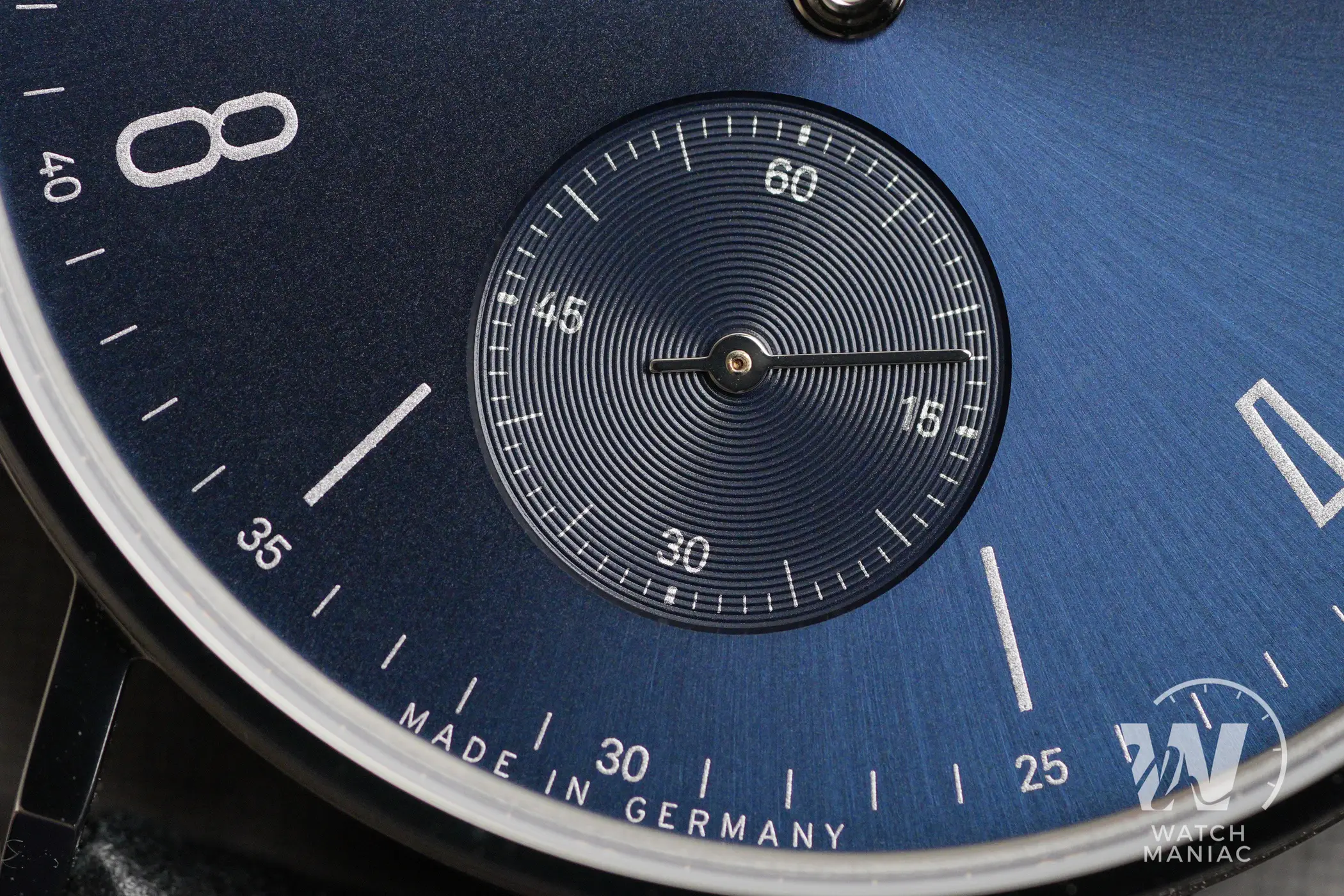 Come di consueto la secondina a ore 6 è leggermente incavata rispetto al livello principale del quadrante e presenta la lavorazione a cerchi concentrici. Gli indici sono stampati in chiaro con la tipica grafica adottata su tanti altri modelli di Nomos. Le sfere, sottili e allungate, hanno una finitura rodiata lucida molto riflettente e in alcune situazioni sembrano quasi sparire, ma è sufficiente cambiare leggermente angolazione per vederle brillare. In quel modo la leggibilità dell’ora rimane comunque ottimale. Come da tradizione per la linea Tangente, anche in questo caso non ci sono dettagli luminescenti al buio, e questa scelta è coerente con la tipologia dell’orologio.