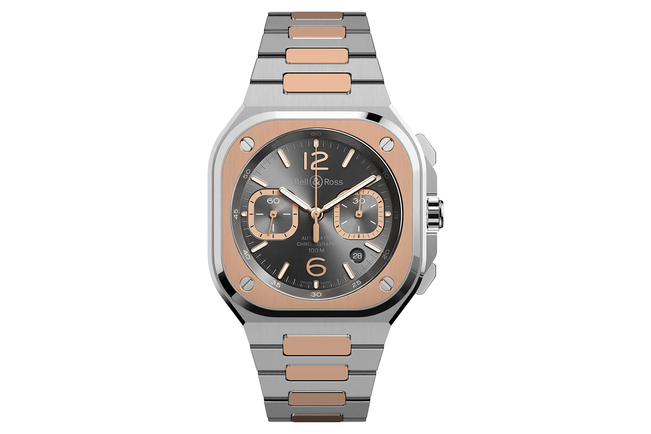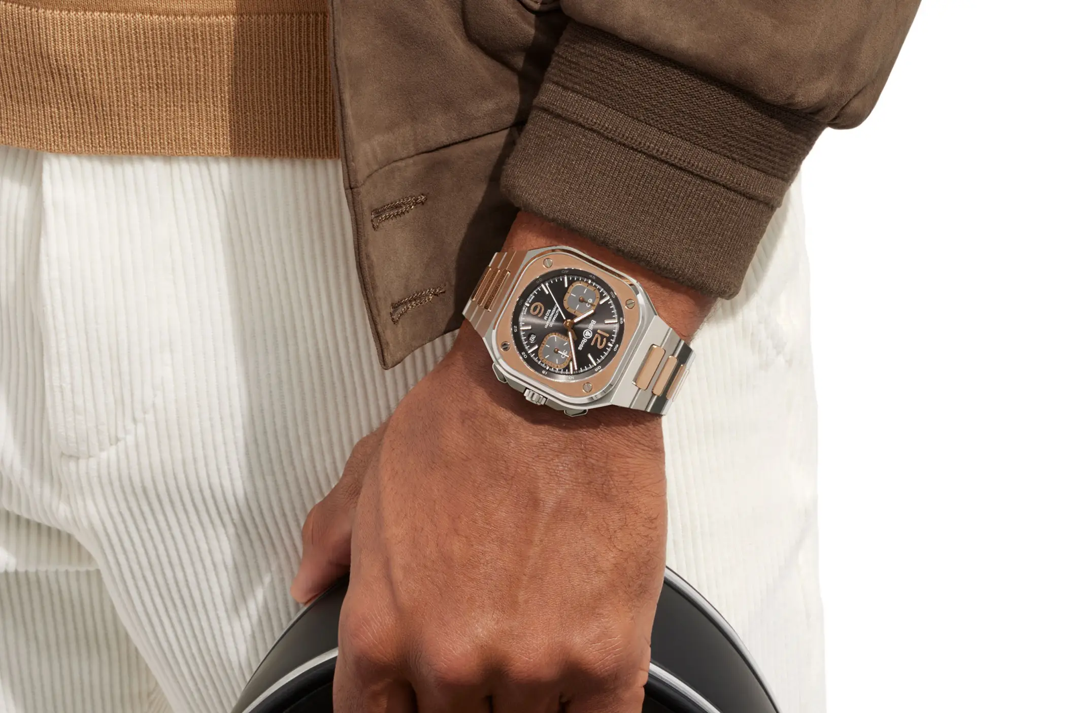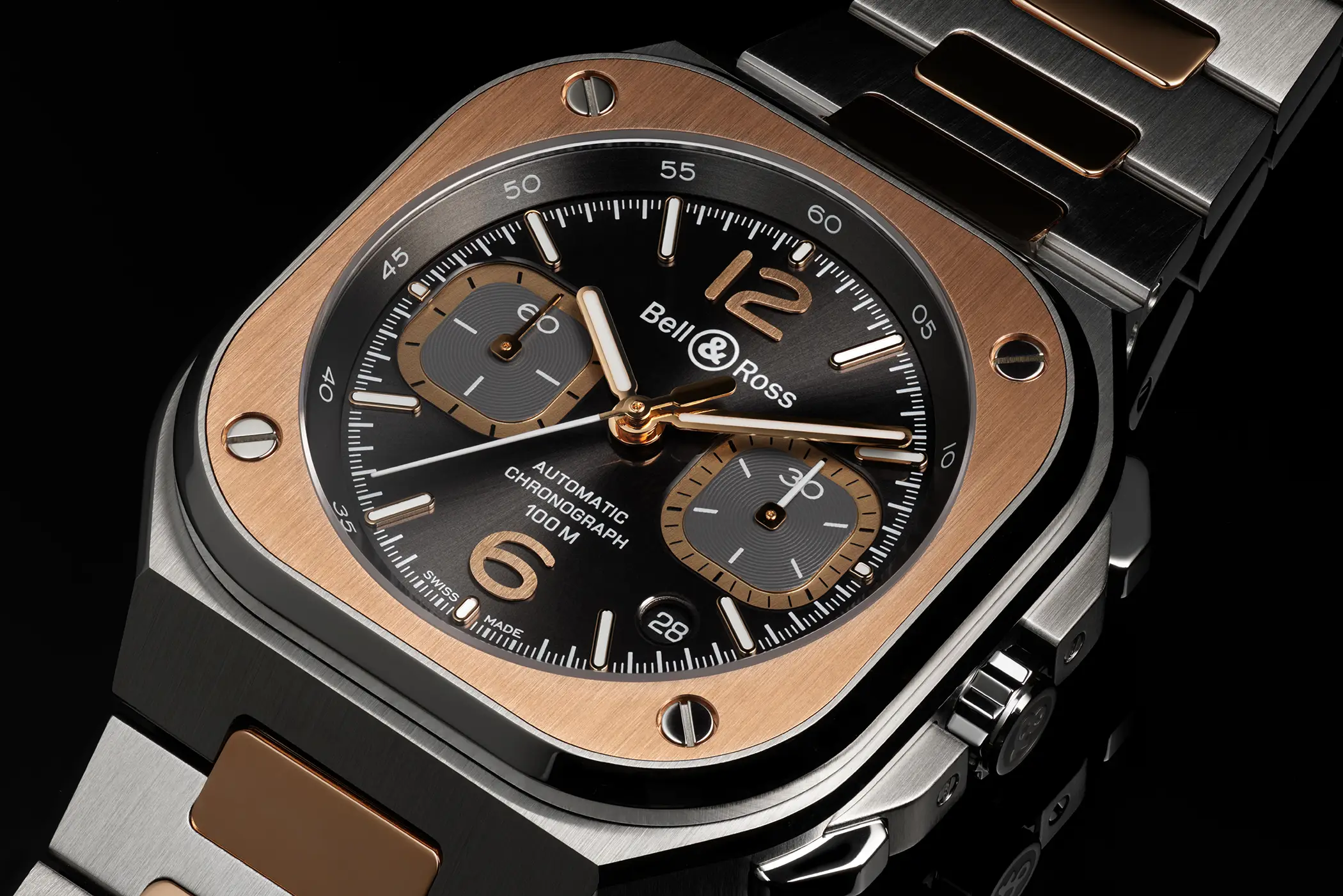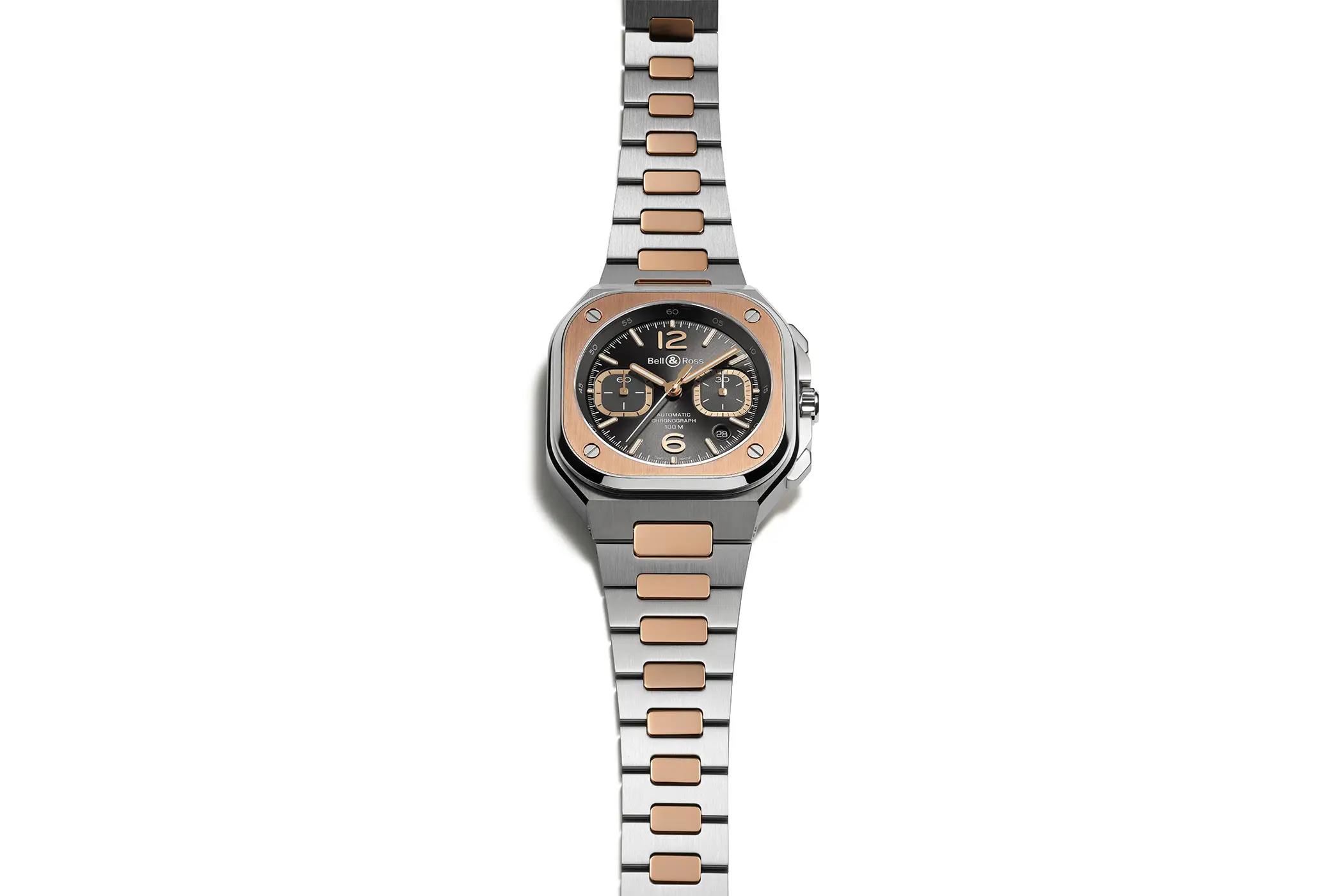 Sempre all’interno della linea BR-05 si inserisce il nuovo Chrono Grey Steel & Gold. Come può essere intuito facilmente dal suo nome, questa referenza è realizzata in acciaio con dettagli in oro rosa 18 carati. Il metallo prezioso viene utilizzato per la lunetta che circonda il vetro, per gli elementi centrali di raccordo del bracciale, ma anche per le sfere. Queste contrastano in modo perfetto con il colore grigio del quadrante in rutenio, reso ancora più vivace dalla finitura soleil.