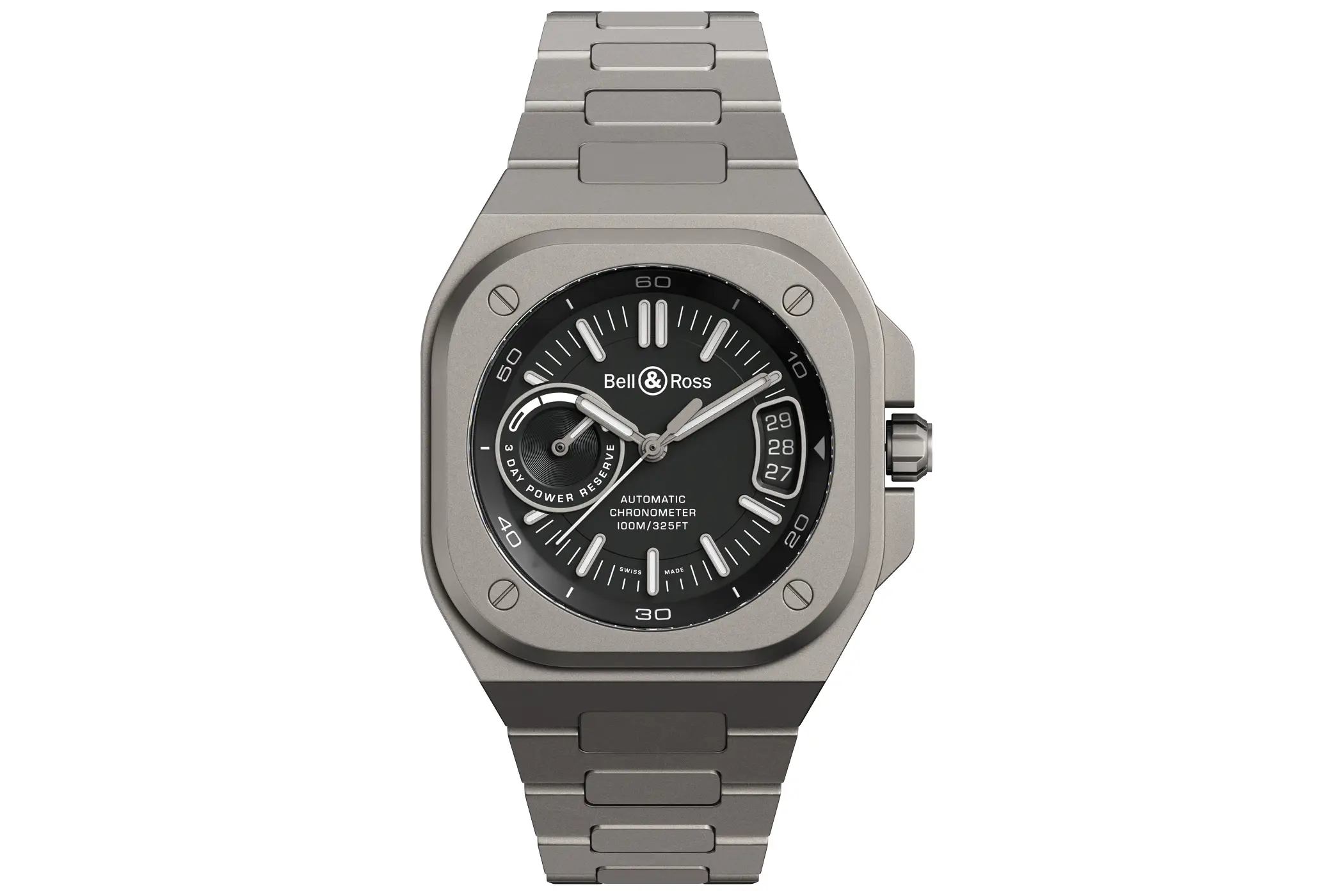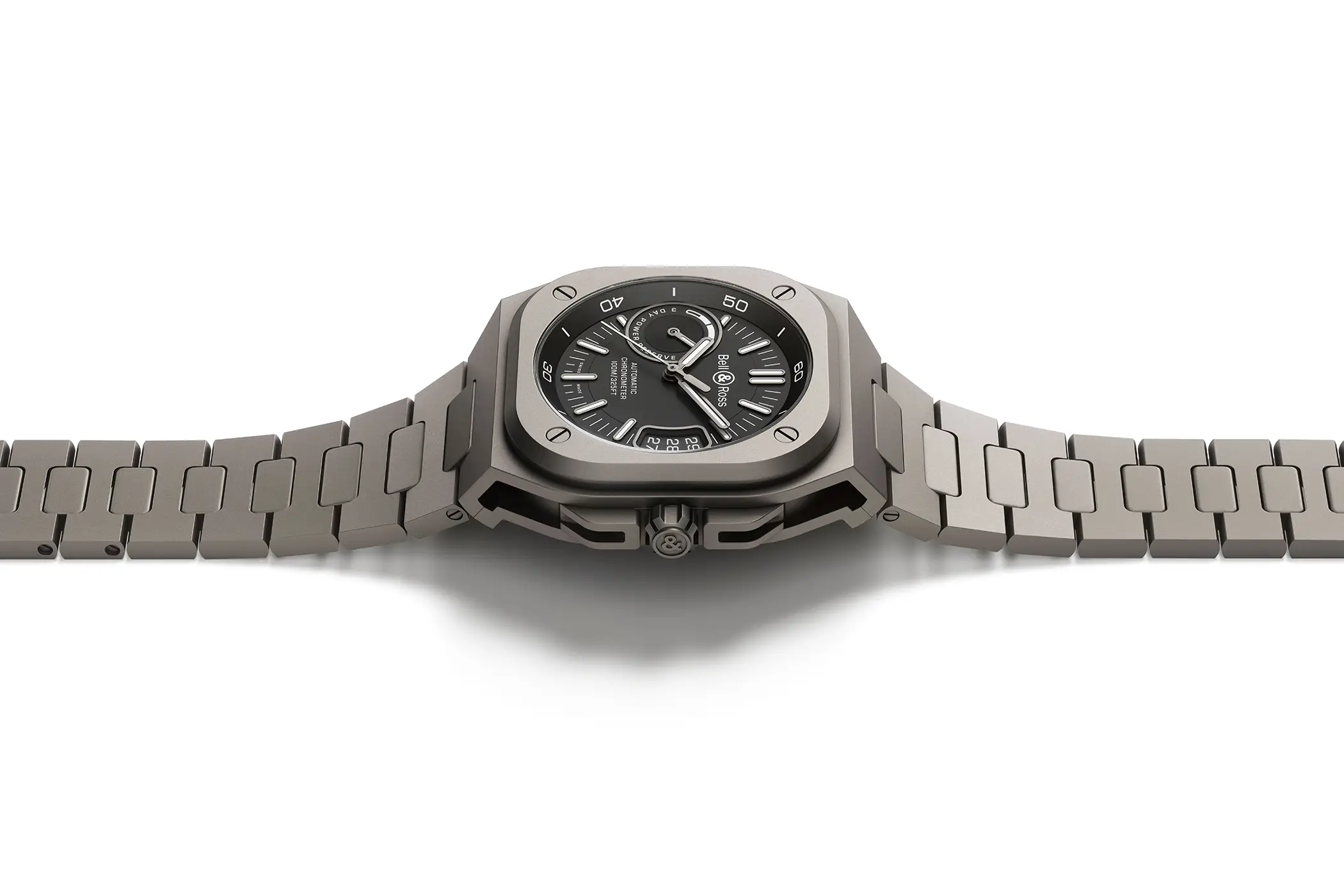 Dulcis in fundo arriva una nuova reinterpretazione del design moderno introdotto con il BR-X5 Carbon Orange. Questa volta però il materiale è differente, visto che per questo modello Bell & Ross ha deciso di utilizzare il titanio di grado 2. La finitura micropallinata fa assumere al metallo una colorazione piuttosto scura, sia sulla cassa che sul bracciale, e nell’insieme sembra quasi richiamare il look dei caccia stealth. La cassa da 41mm di larghezza del BR-X5 Black Titanium ha una costruzione multicomponente, con un nucleo più interno che garantisce l’impermeabilità fino 100m.