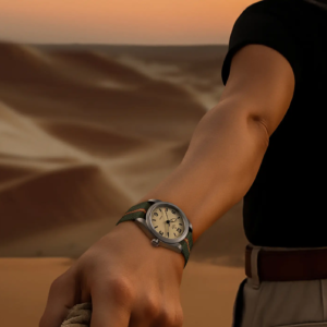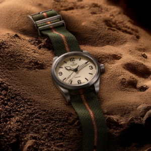 Gli indici, con numeri arabi ad ore 3, 6, 9 e12, sono dipinti e il colore nero crea un efficace contrasto con il quadrante beige. La leggibilità notturna è garantita da punti di pasta luminescenti posizionati nella parte più esterna del quadrante in corrispondenza degli indici delle ore. La sfera delle ore, a forma di freccia con profilo arrotondato, e quella dei minuti, a forma di spada, sono un tratto distintivo dell’estetica Ranger. Anche per questi dettagli il colore scelto è il beige con profilo nero a contrasto per favorire la leggibilità.
