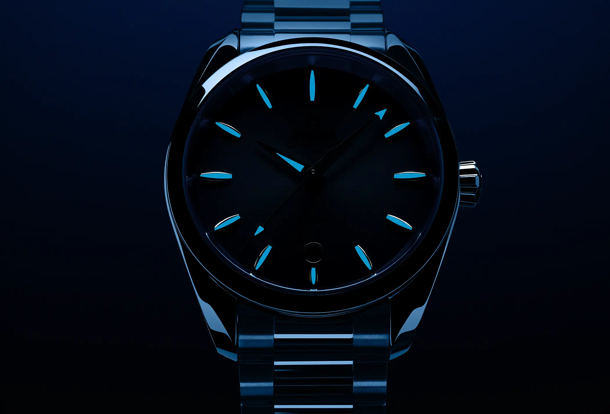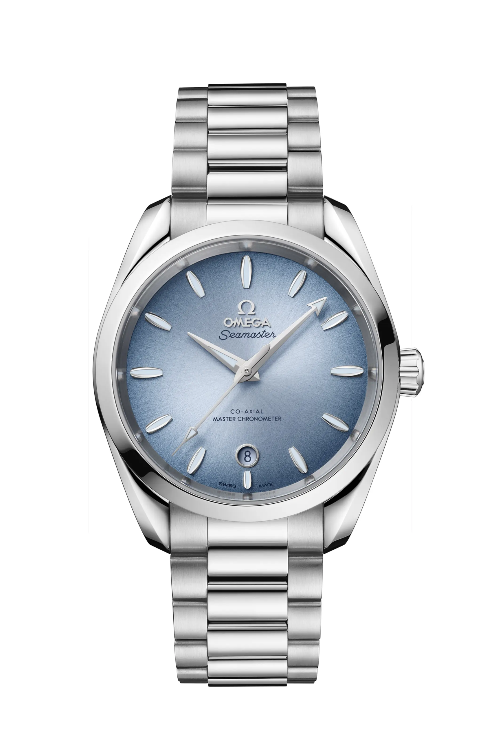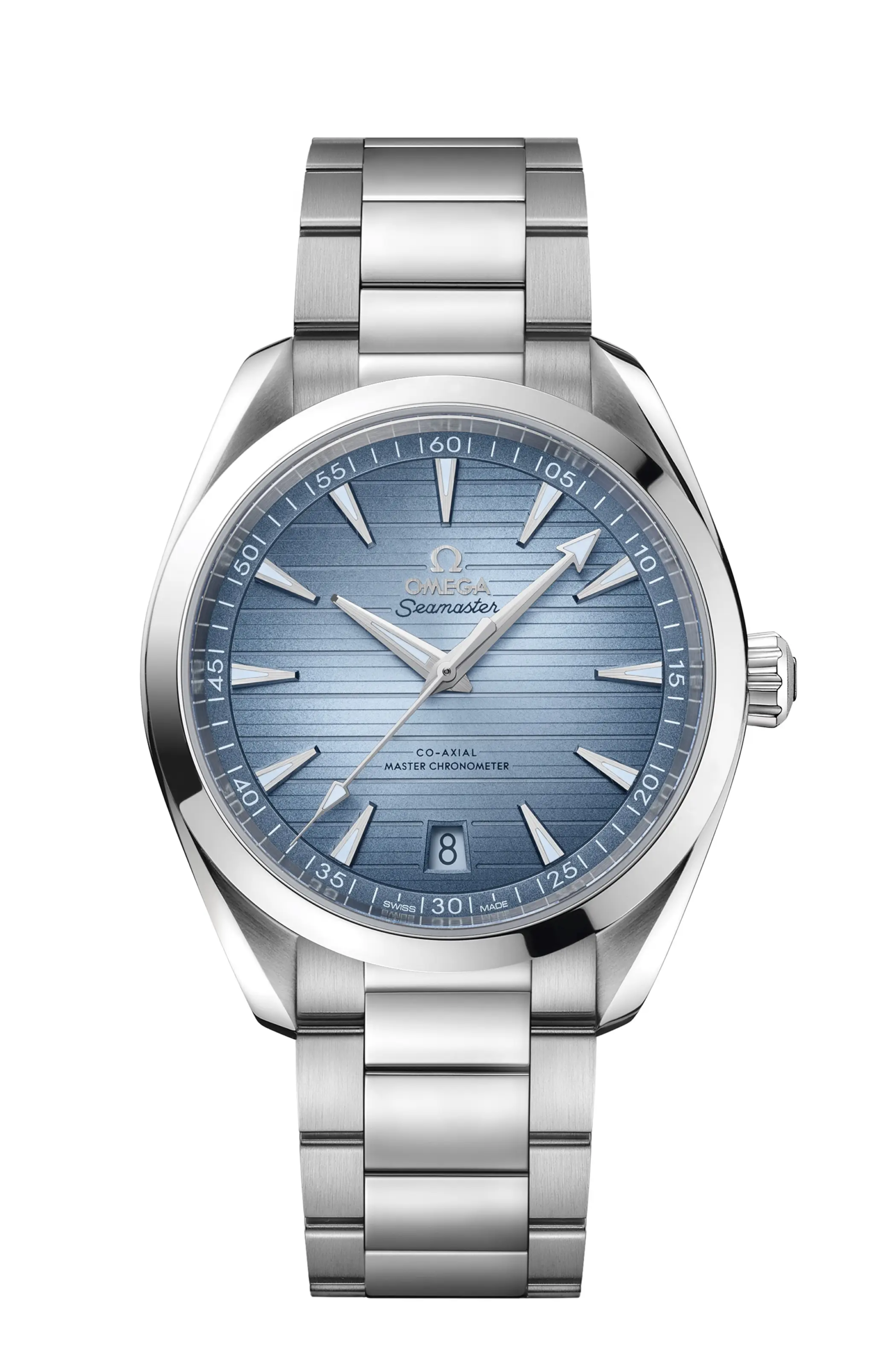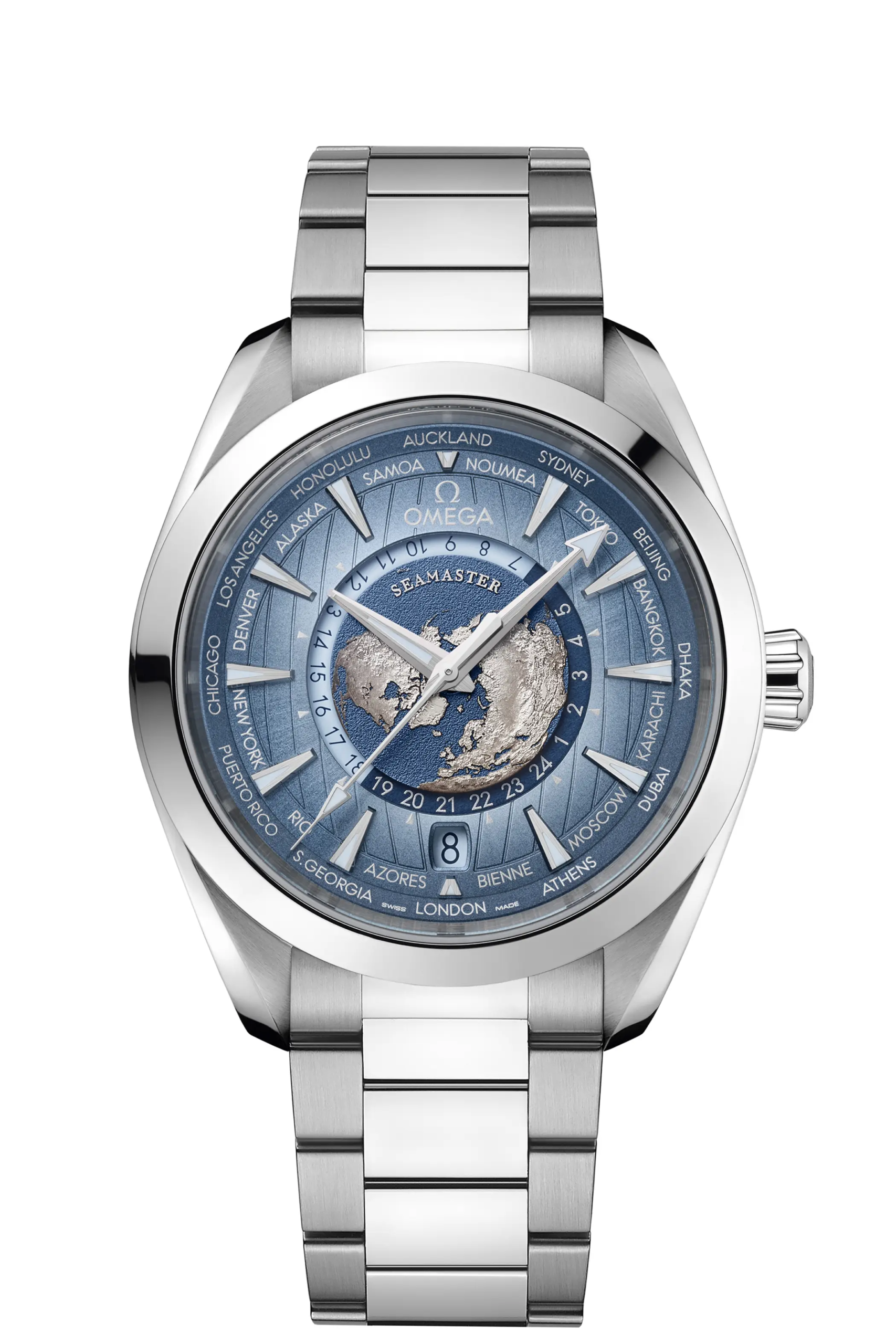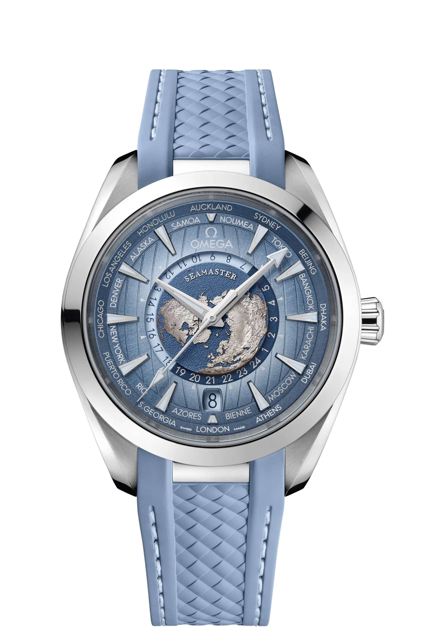 Nell’Aqua Terra Worldtimer “Summer blue”, proprio grazie alle sfumature del quadrante, la raffigurazione del nostro pianeta risalta ancora di più. Il movimento che anima la complicazione delle ore del mondo è il Co-Axial Master Chronometer 8938 e l’impermeabilità è quella tipica per la linea Aqua Terra: 150m.