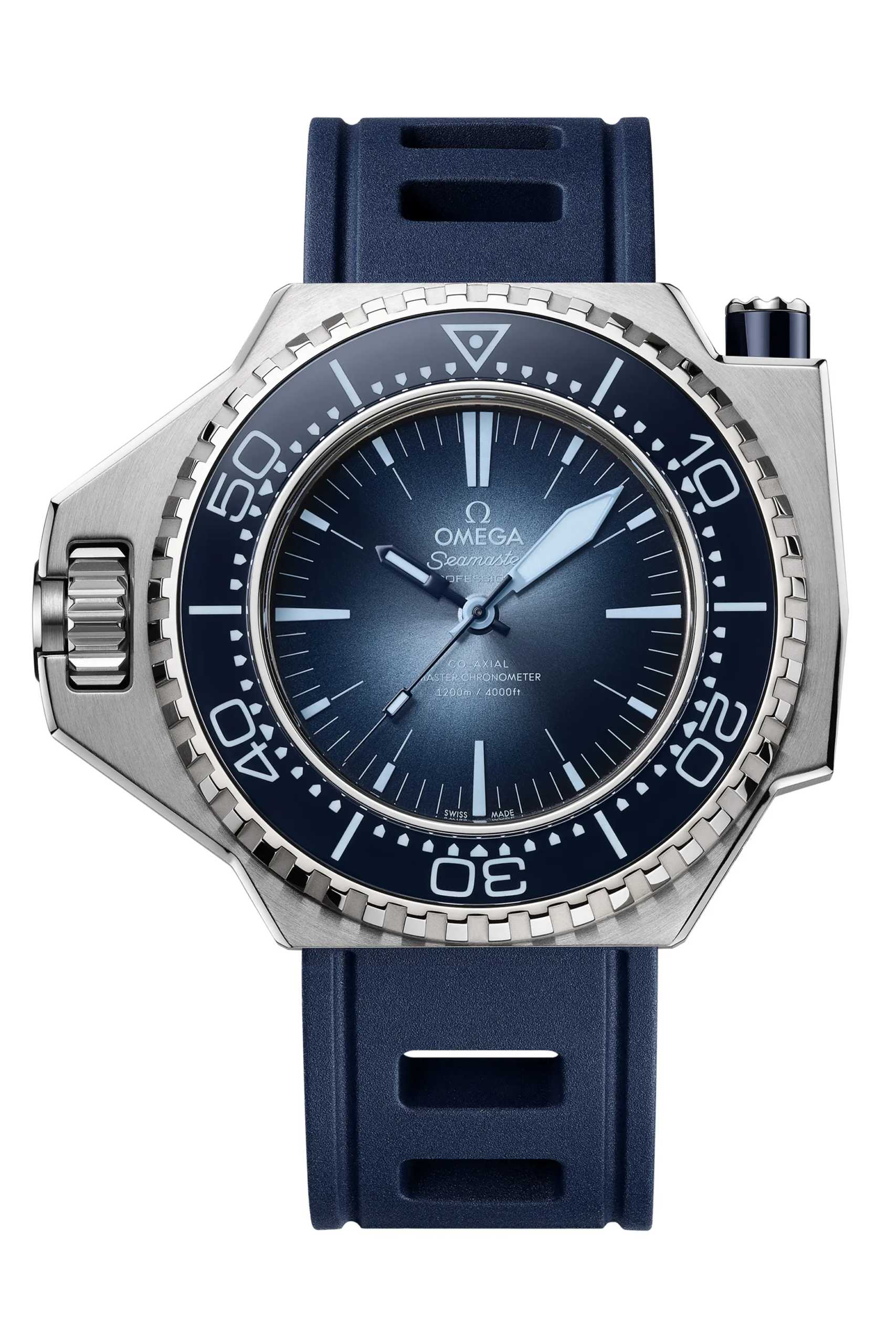 E la cosa si fa terribilmente interessante! Soprattutto perché, oltre ad utilizzare la lega O-megasteel introdotta con l’Ultra Deep (più resistente ai graffi e più brillante rispetto al normale acciaio), ritorna la cassa monoblocco. Questa soluzione tecnica era stata abbandonata per i Ploprof più moderni, sui quali era stato utilizzato inizialmente un tradizionale fondello a vite in acciaio, successivamente sostituito da uno con finestra in vetro zaffiro. A questo succoso dettaglio, aggiungiamo anche la presenza di un cinturino in gomma in stile Isofrane e l’inserto della ghiera in vetro zaffiro che lascia affiorare la Superluminova applicata sullo strato inferiore. Il calibro all’interno è il Co-Axial Master Chronometer 8912.