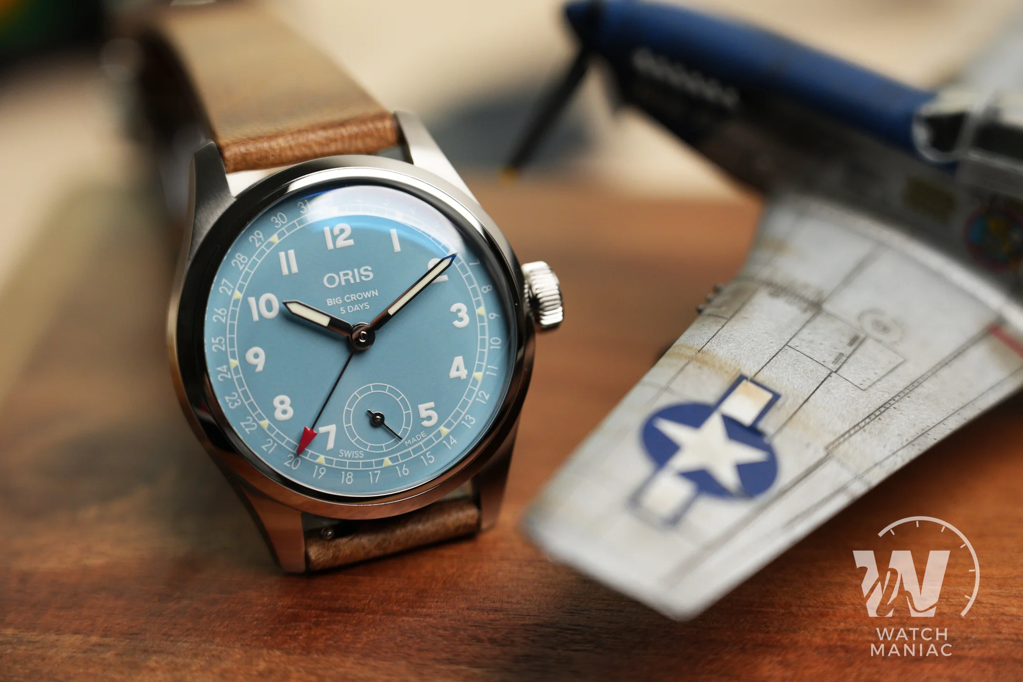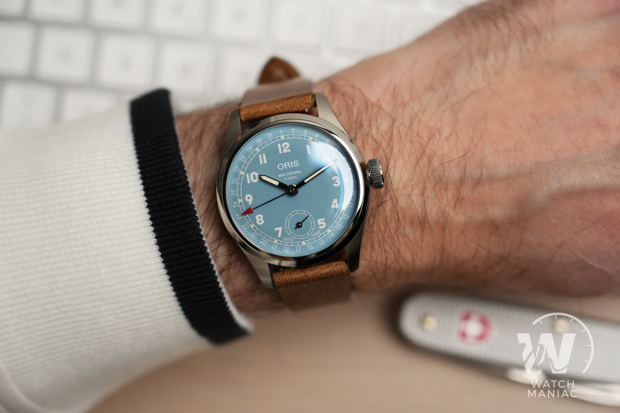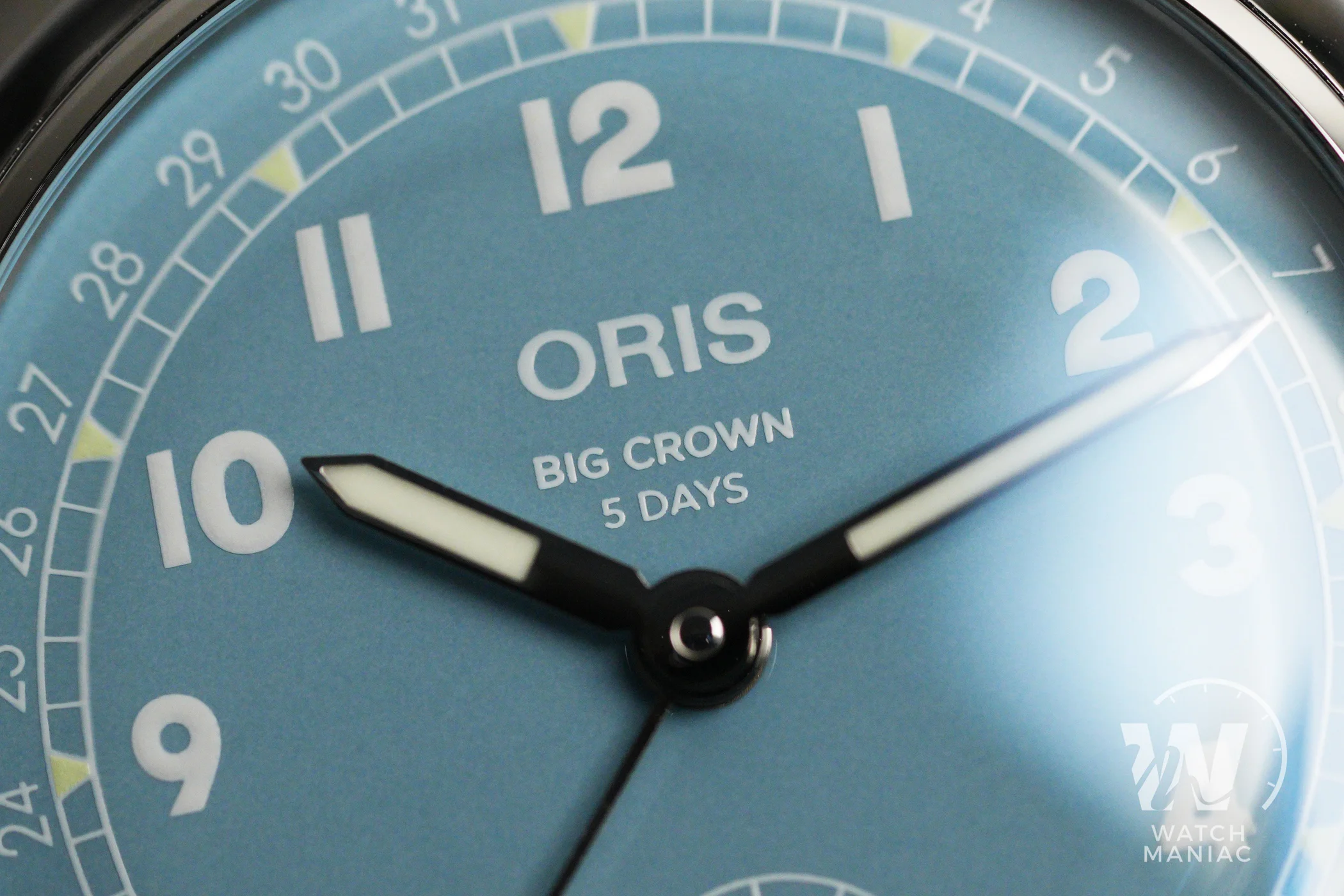 Per il momento l’Oris Big Crown Pointerdate con calibro 473 è stato proposto in un’unica colorazione di quadrante. Si tratta di una tonalità molto particolare che, a seconda della luce, può andare dall’azzurrino al verde acqua. La finitura superficiale è lucida e nella parte alta ci sono stampati il marchio, il nome del modello e il dato sulla riserva di carica di 5 giorni. L’unica altra scritta presente è la dicitura Swiss Made ai lati della secondina. Questa è piuttosto piccola, com’è del resto anche sugli altri modelli con calibro 401 o 403: è un po’ la sua caratteristica estetica. Gli indici con numeri arabi, di chiara ispirazione militare e aeronautica, rendono omaggio proprio alle origini dell’Oris Big Crown e sono stampati. Tutto intorno al quadrante ci sono i riferimenti per la lettura della data.