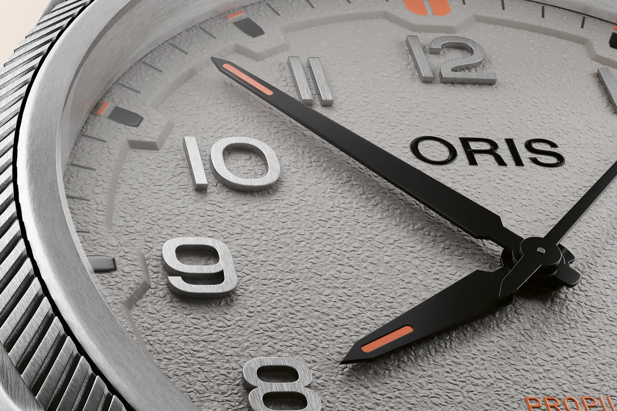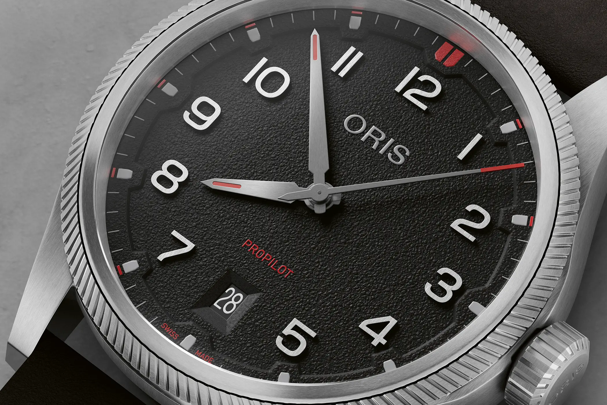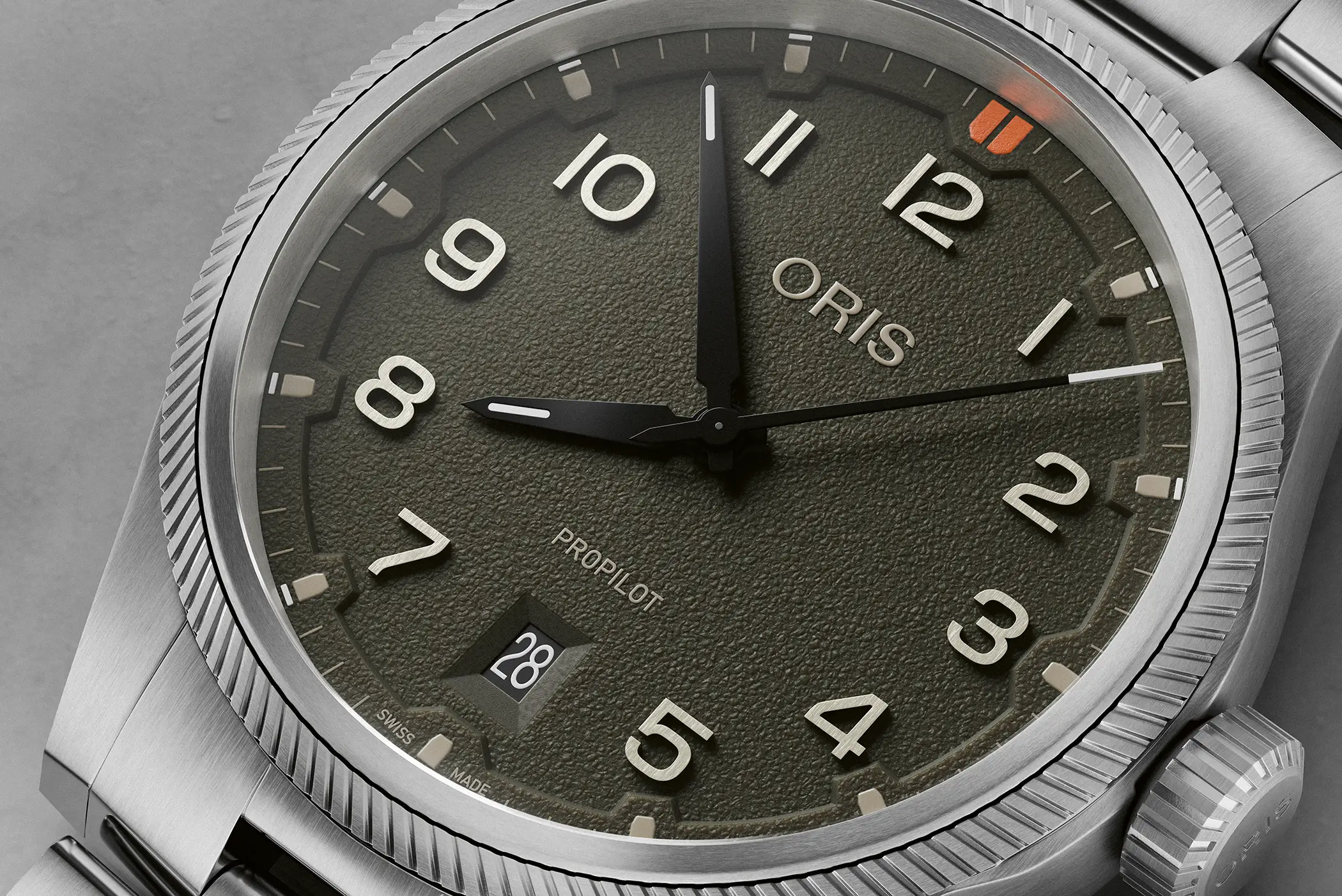 Il cambiamento più evidente del nuovo ProPilot Date riguarda il quadrante. La nuova texture ruvida gli conferisce un carattere tecnico, aggiunge profondità visiva e soprattutto migliora la leggibilità in ogni condizione, riducendo i riflessi fastidiosi. Il quadrante è disponibile in tre colorazioni: nero, grigio e verde.