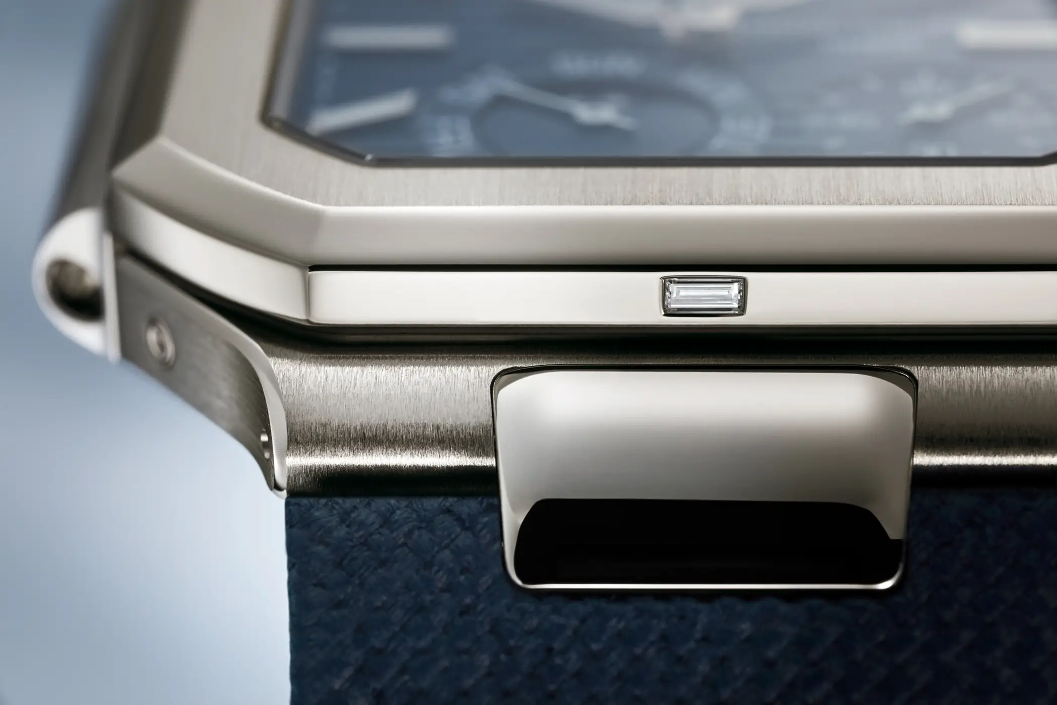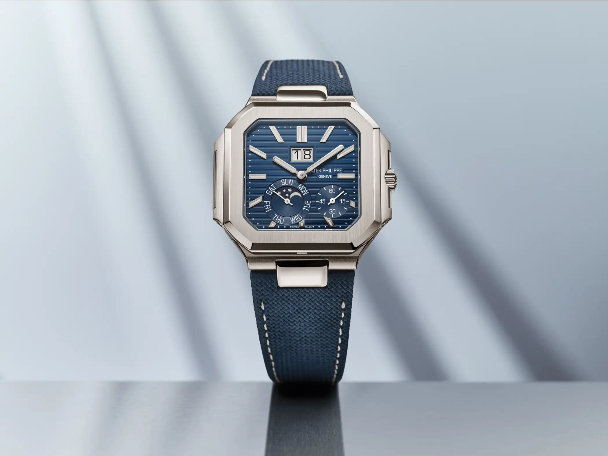 Nel quadrante blu soleil, all’interno della doppia finestra nella parte alta, è presente la gran data con due dischi posizionati esattamente sullo stesso piano. A ore 7 c’è l’indicatore coassiale del giorno della settimana e delle fasi lunari, mentre a ore 4:30 c’è il contatore dei secondi. Così come sugli altri modelli di Patek in platino, anche in questo caso sulla lunetta a ore 6 è incastonato un diamante (che per la prima volta è tagliato a baguette). Il prezzo di listino del Patek Philippe Cubitus 5822P-001 è di 89.100€.