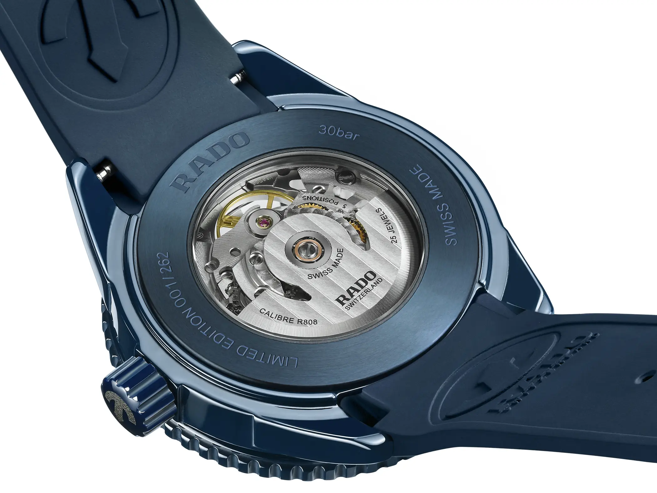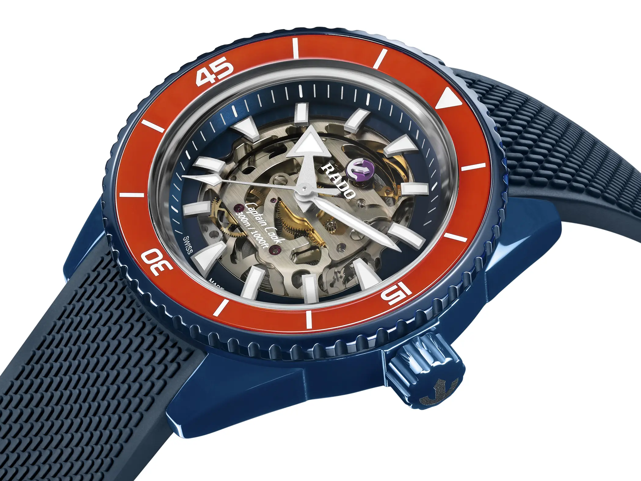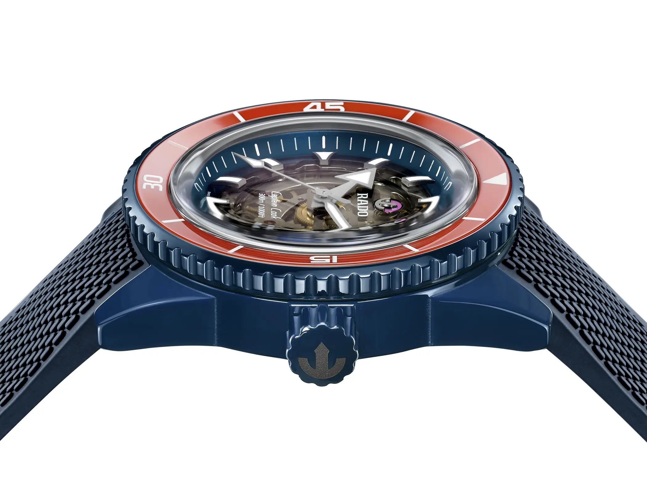 Attraverso il quadrante in vetro zaffiro dei nuovi Rado Captain Cook High-Tech Ceramic Skeleton è possibile vedere il movimento. Si tratta del Calibro R808 con una scheletratura parziale, una meccanica automatica che può vantare ben 80 ore di riserva di carica e che grazie alla spirale in Nivachron dimostra una buona resistenza ai campi magnetici. Entrambe le referenze sono a tutti gli effetti dei diver, con corona a vite (anch’essa realizzata in ceramica blu) e impermeabilità fino a 30atm. La cassa da 43mm di diametro è abbinata ad un cinturino in caucciù blu navy opaco con una lavorazione superficiale che riprende un po’ l’aspetto tipico dei bracciali mesh.