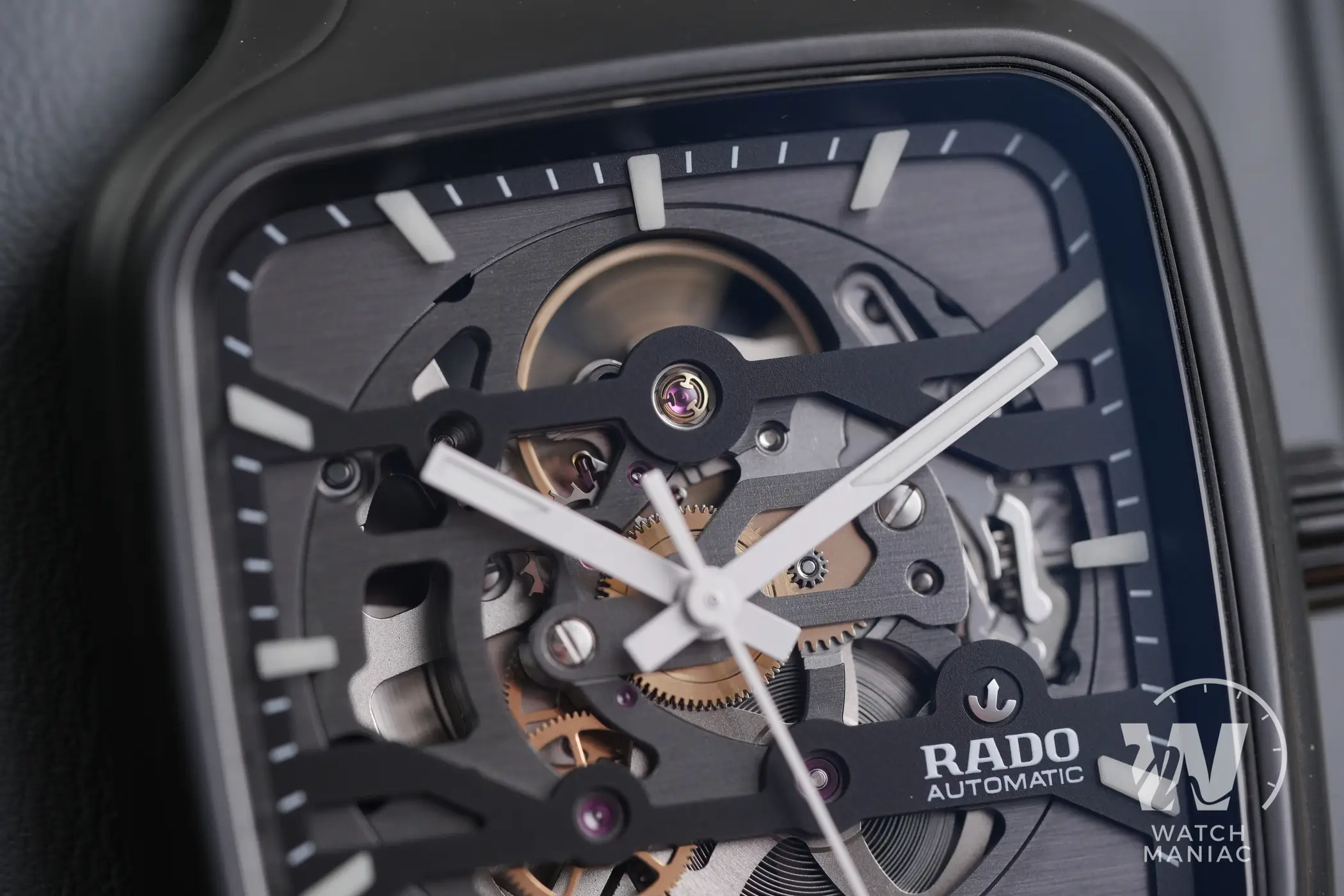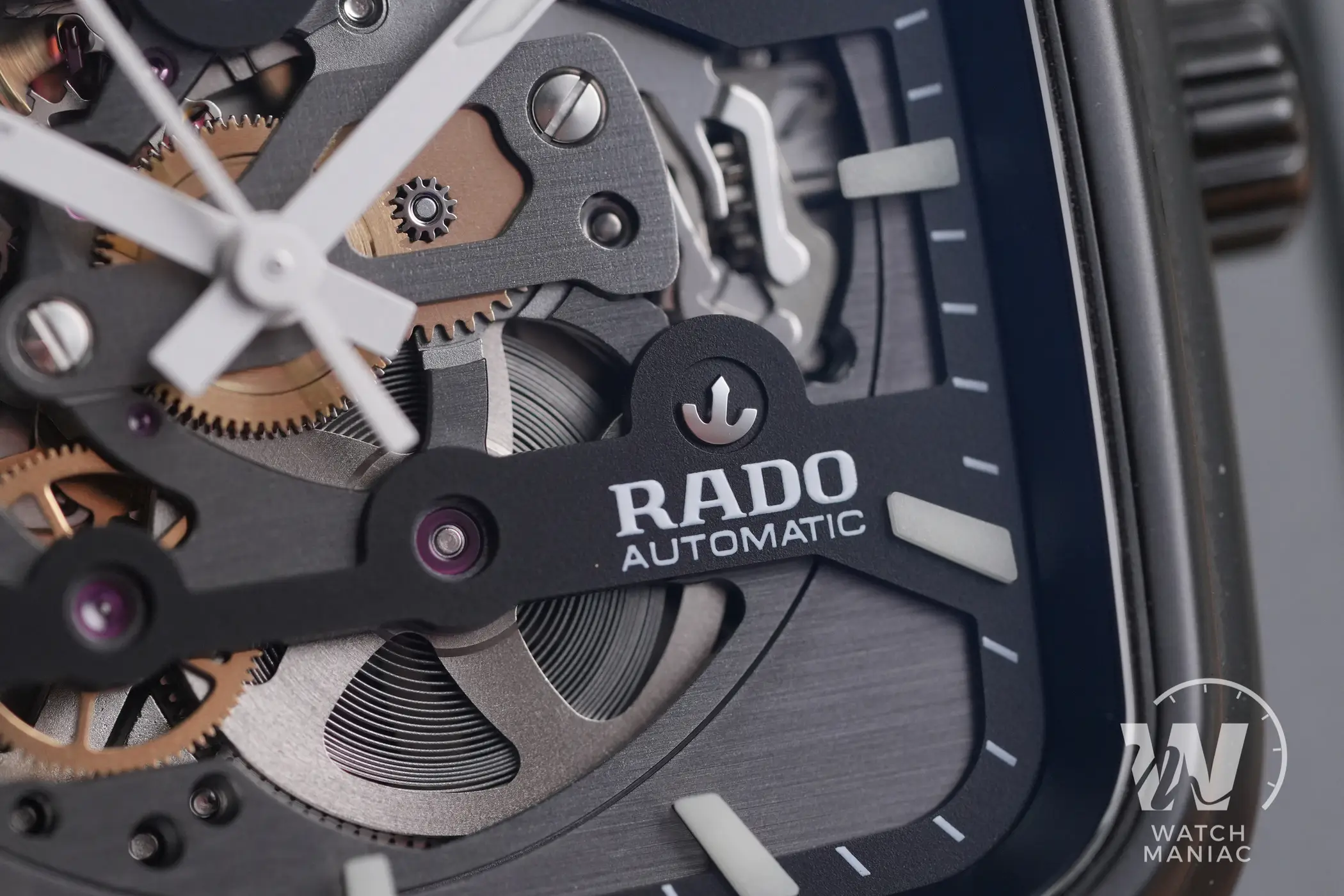 Al centro, attraverso la finestra in vetro zaffiro, si può osservare il movimento installato all’interno. Si tratta del calibro R808, una meccanica basata sull’architettura dell’ETA 2824 ma con personalizzazioni specifiche per Rado (così come avviene per tutti gli altri marchi di Gruppo Swatch). La frequenza è a 21.600a/h, la riserva di carica è di ben 80 ore, è possibile la ricarica manuale ed è presente il fermo macchina. Il livello di decorazione è gradevole, con Côtes de Genève sulla massa oscillante e perlage sul ponte superiore. La particolarità principale è data dalla scheletratura, che consente di osservare anche dal lato del quadrante molti dei componenti interni, inclusa l’ancora dello scappamento e le spire della molla di carica nel bariletto.