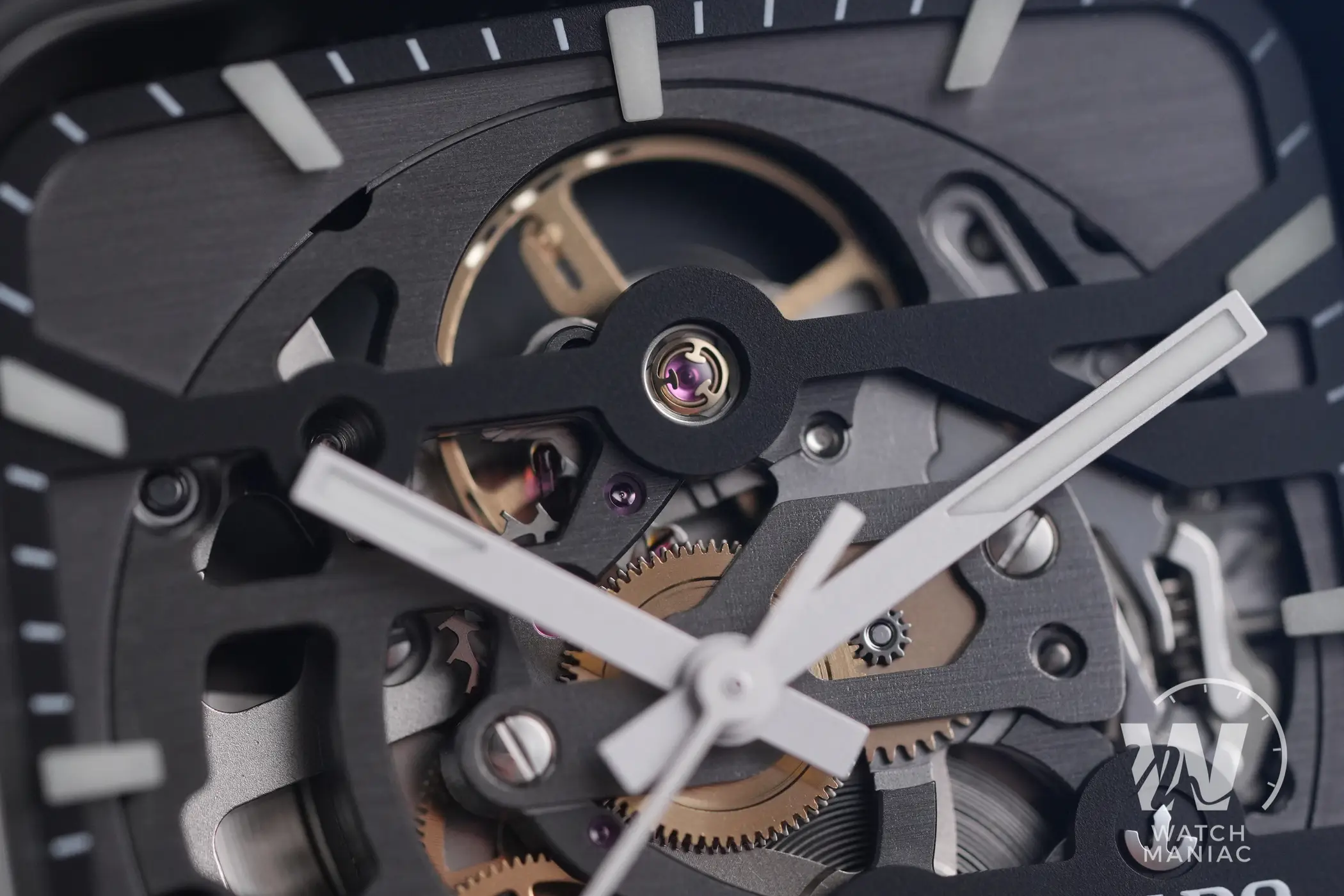 La ceramica dà grandi libertà per quanto riguarda le colorazioni e infatti il Rado True Square Skeleton può essere scelto sia in tonalità sgargianti che in alcune versioni più sobrie. Il quadrante è sostanzialmente ridotto al minimo: ci sono solo due ponti trasversali che seguono l’architettura del movimento sottostante e sono uniti alla cornice più esterna con la minuteria. Questa struttura ha una colorazione che cambia a seconda della variante scelta e, anche nel modello con cassa nera, fanno contrasto con le parti a vista della meccanica. Il gioco che si crea al variare dell’inclinazione della luce è molto interessante e fa risaltare di più o di meno i due ponti orizzontali. Il marchio è in posizione decentrata ed è accompagnato dalla classica ancoretta di Rado.