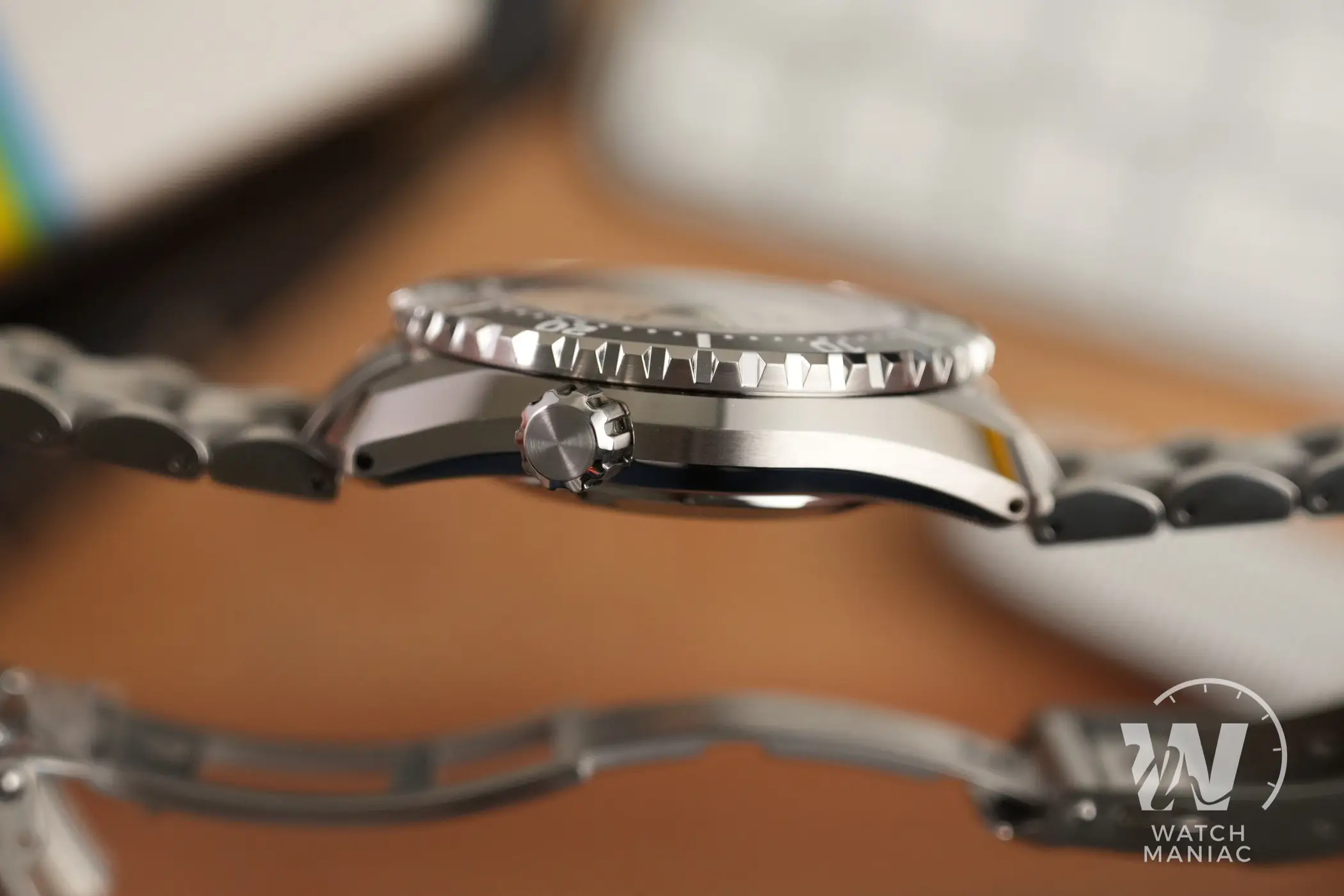 Nonostante la finitura lucida molto ben realizzata e i numeri incisi nello spessore, l’inserto non è in ceramica ma è realizzato in acciaio. Questo è un po’ un peccato, anche perché nel catalogo di Seiko ci sono vari modelli più economici che utilizzano la ceramica. In ogni caso da vedere è davvero bella e si abbina alla perfezione al bianco del quadrante. La superficie antiscivolo laterale ha una dentatura molto più aggressiva ed evidente se confrontata con quello dei vecchi Marinemaster monoblocco ed è dà un tocco di modernità in più. La rotazione è morbida e fluida con 120 scatti precisi e senza giochi eccessivi.