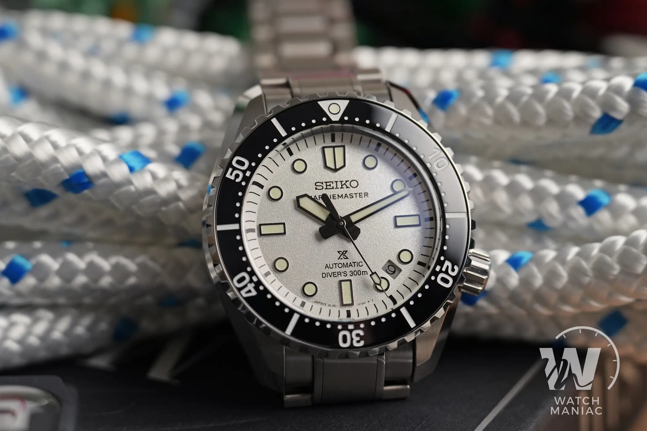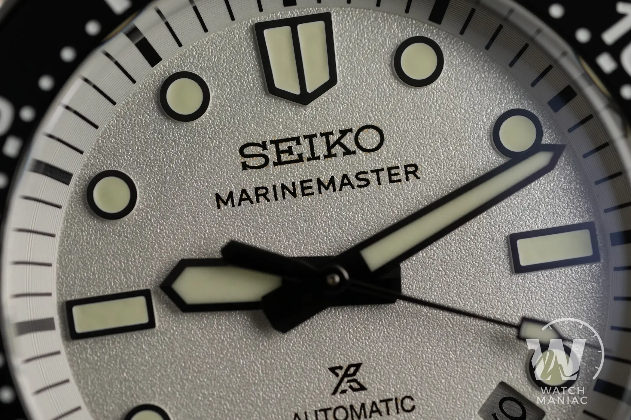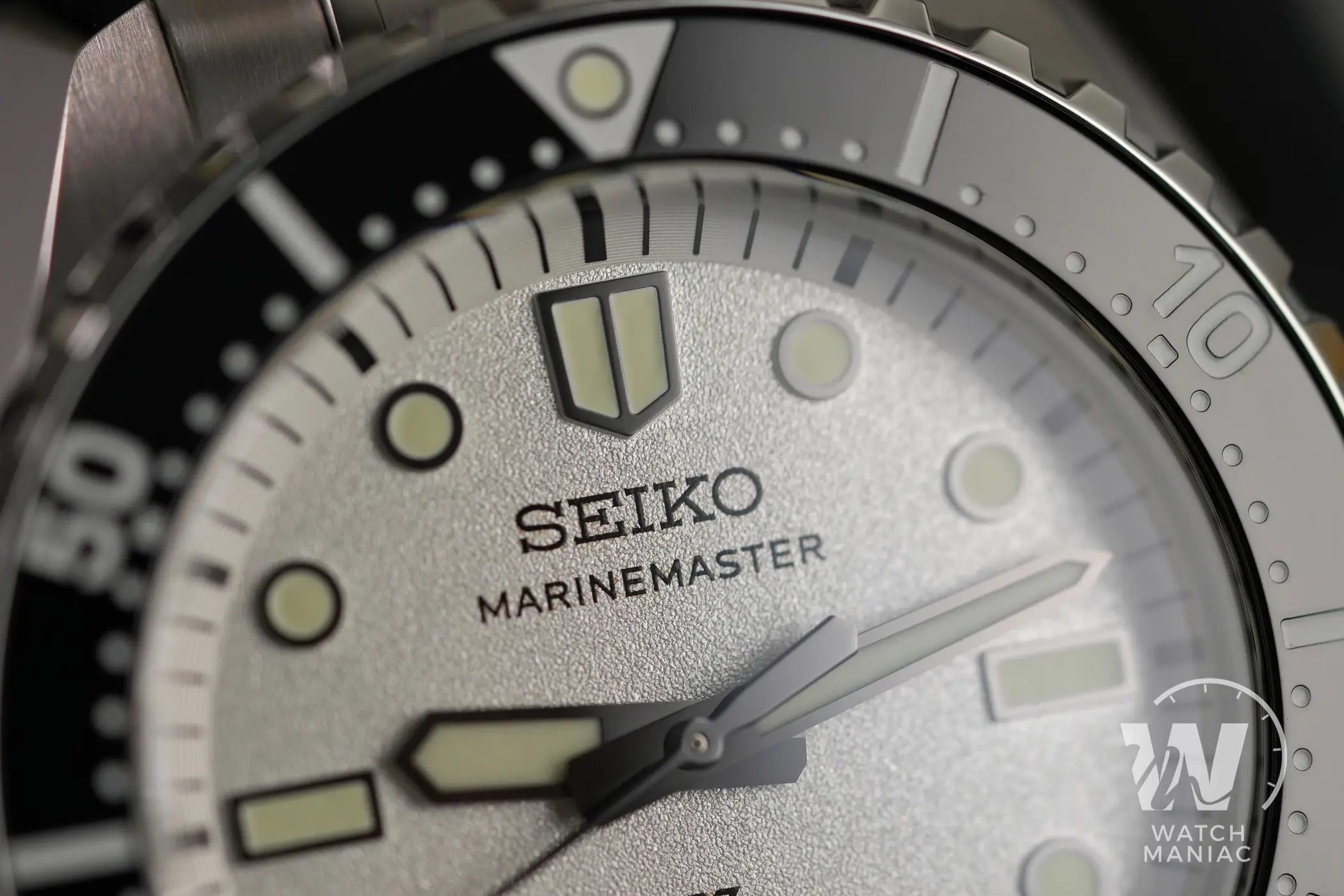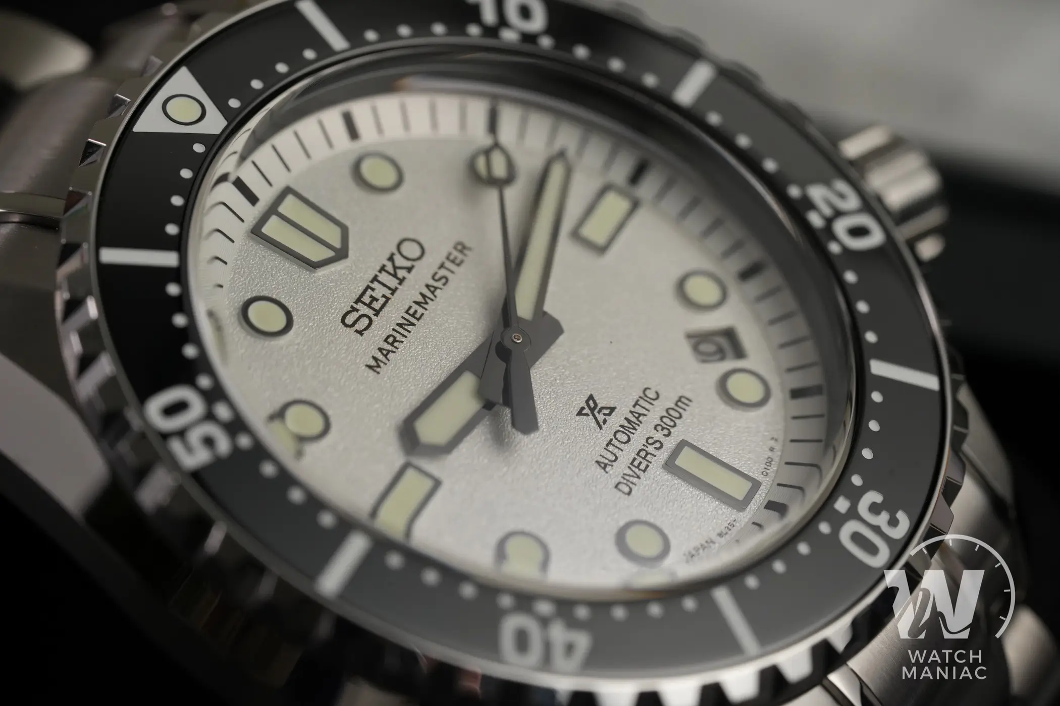 I nuovi Marinemaster sono disponibili in colorazione nera o bianca e quest’ultima è quella che si discosta maggiormente da quanto visto finora con i diver monoblocco di Seiko. Il quadrante ha una finitura superficiale finemente granulosa che, unita al bianco, crea quasi un effetto perlato particolarmente gradevole. Il nuovo carattere utilizzato per la scritta sotto il marchio è molto diverso rispetto a quello precedente e quindi i fan storici dovranno farci un po’ l’occhio. In basso, oltre al logo prospex e alla scritta automatic, è riportato il dato sull’impermeabilità fino a 300m. Così come su tanti altri diver certificati recenti di Seiko, anche in questo caso la data è stata posizionata a metà tra gli indici a ore 4 e ore 5 e il disco ha sfondo argentato.