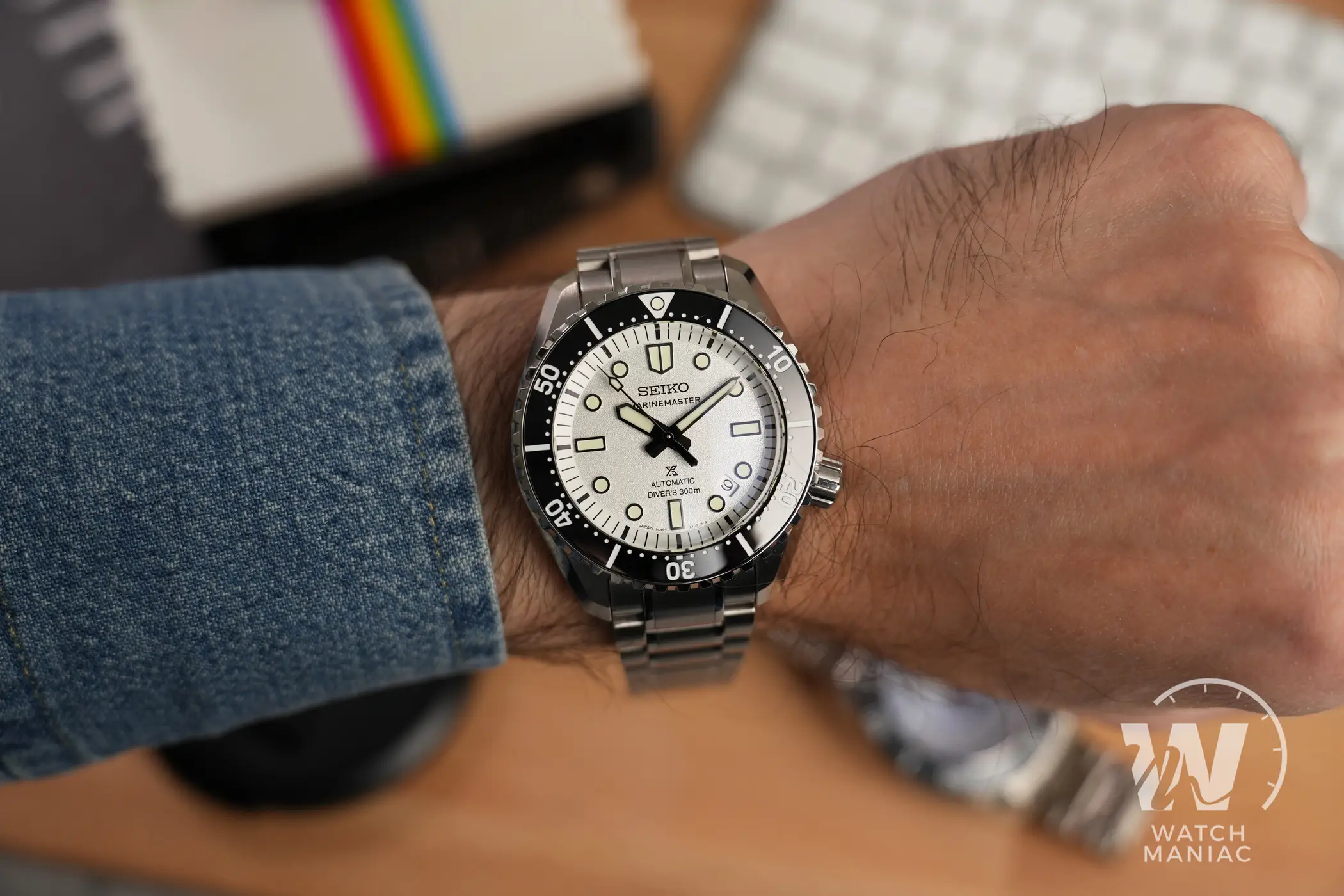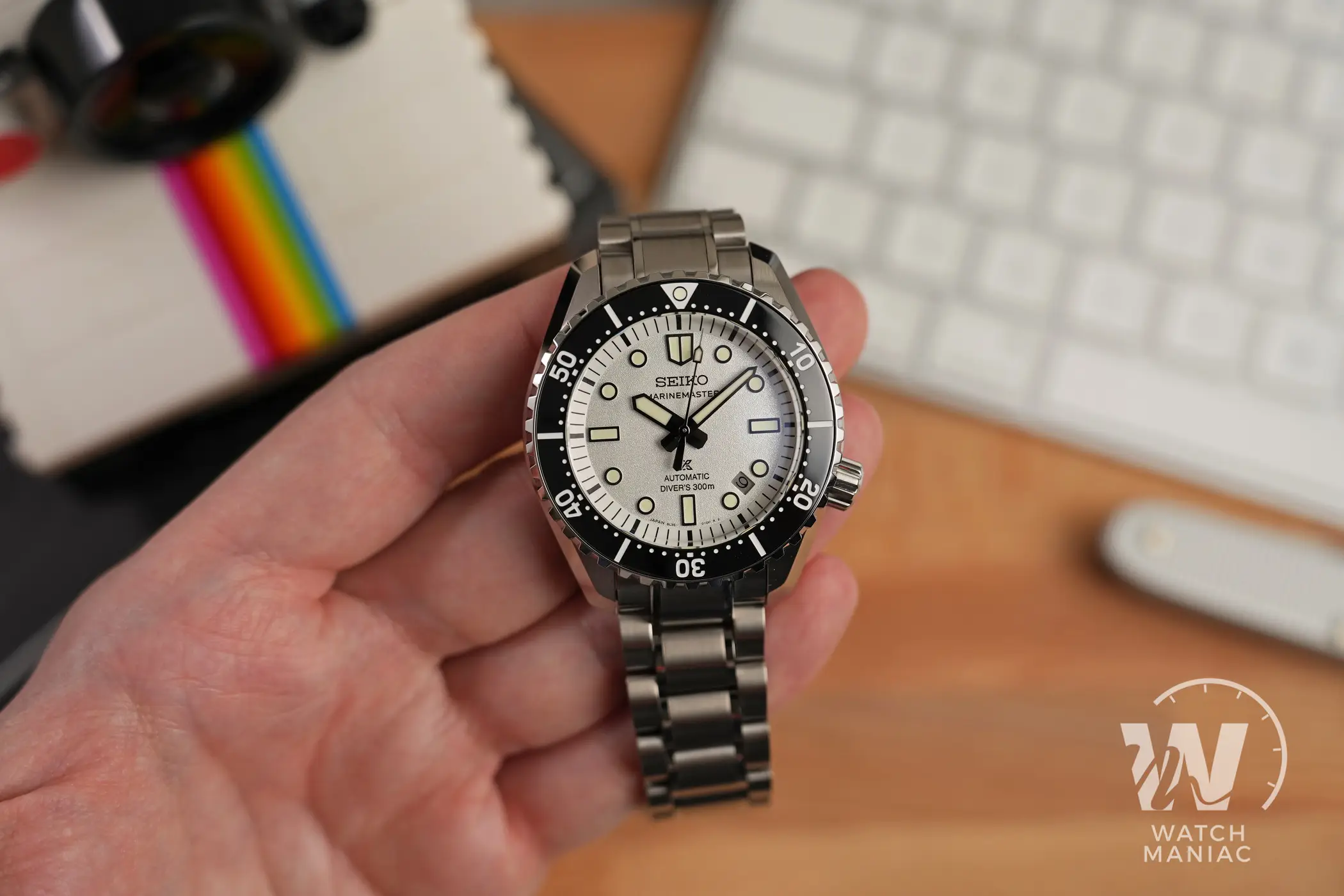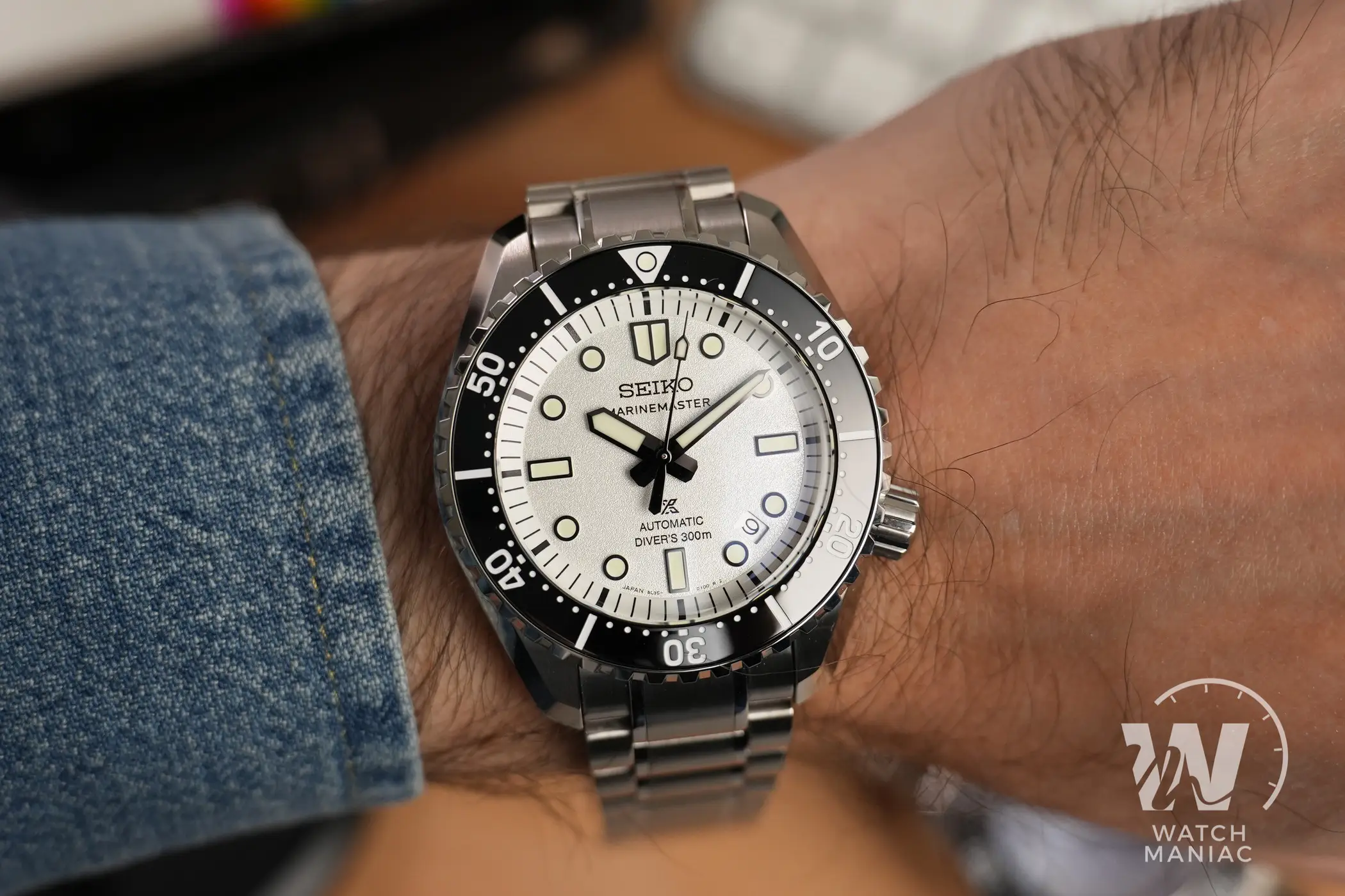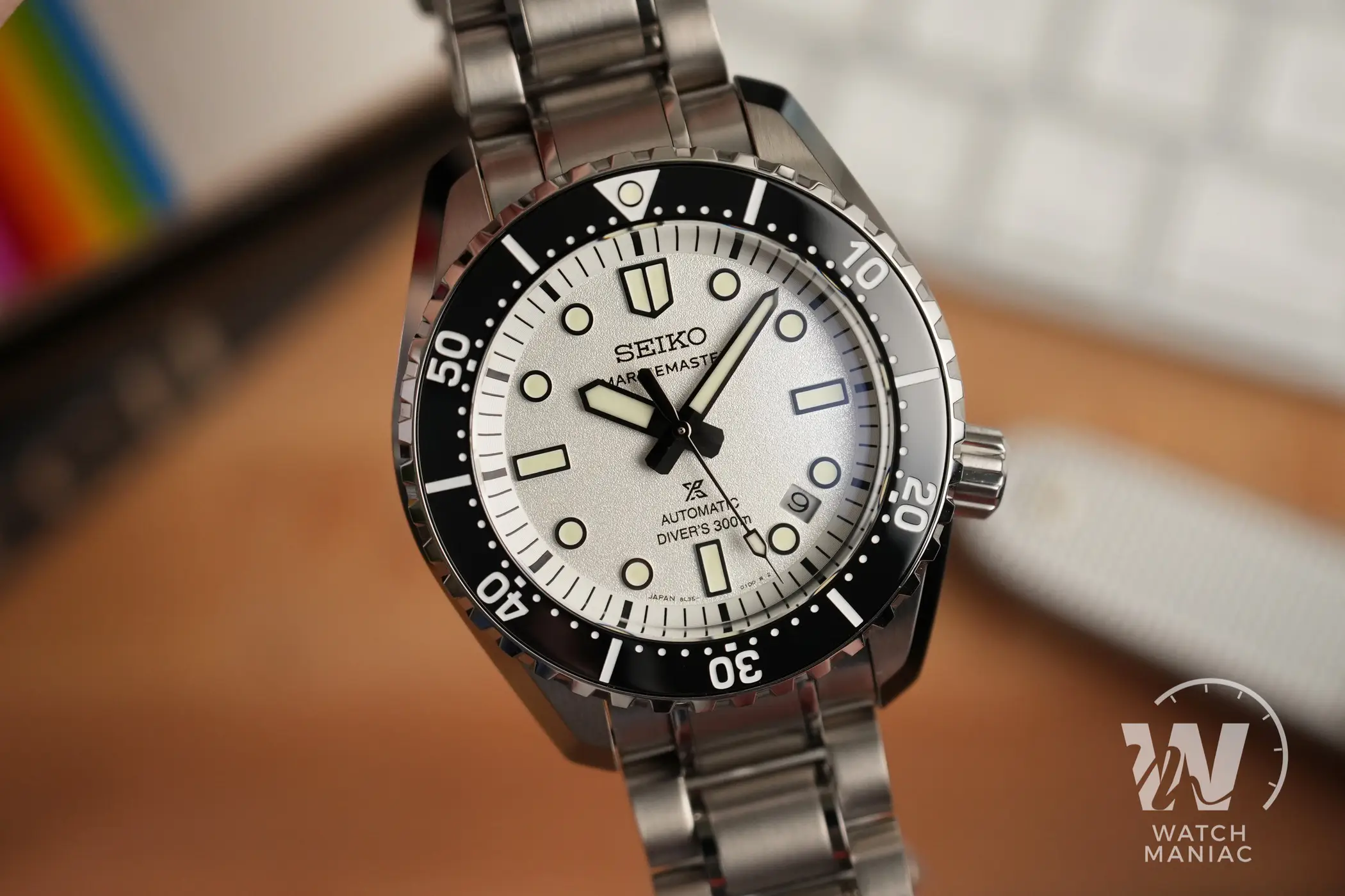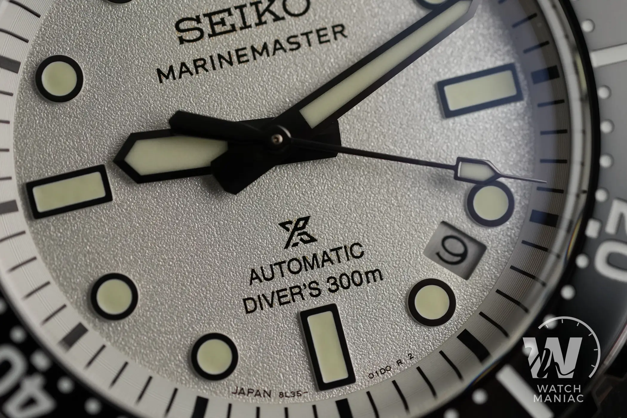 I nuovi Marinemaster sono disponibili in colorazione nera o bianca e quest’ultima è quella che si discosta maggiormente da quanto visto finora con i diver monoblocco di Seiko. Il quadrante ha una finitura superficiale finemente granulosa che, unita al bianco, crea quasi un effetto perlato particolarmente gradevole. Il nuovo carattere utilizzato per la scritta sotto il marchio è molto diverso rispetto a quello precedente e quindi i fan storici dovranno farci un po’ l’occhio. In basso, oltre al logo prospex e alla scritta automatic, è riportato il dato sull’impermeabilità fino a 300m. Così come su tanti altri diver certificati recenti di Seiko, anche in questo caso la data è stata posizionata a metà tra gli indici a ore 4 e ore 5 e il disco ha sfondo argentato.