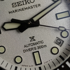 I nuovi Marinemaster sono disponibili in colorazione nera o bianca e quest’ultima è quella che si discosta maggiormente da quanto visto finora con i diver monoblocco di Seiko. Il quadrante ha una finitura superficiale finemente granulosa che, unita al bianco, crea quasi un effetto perlato particolarmente gradevole. Il nuovo carattere utilizzato per la scritta sotto il marchio è molto diverso rispetto a quello precedente e quindi i fan storici dovranno farci un po’ l’occhio. In basso, oltre al logo prospex e alla scritta automatic, è riportato il dato sull’impermeabilità fino a 300m. Così come su tanti altri diver certificati recenti di Seiko, anche in questo caso la data è stata posizionata a metà tra gli indici a ore 4 e ore 5 e il disco ha sfondo argentato.