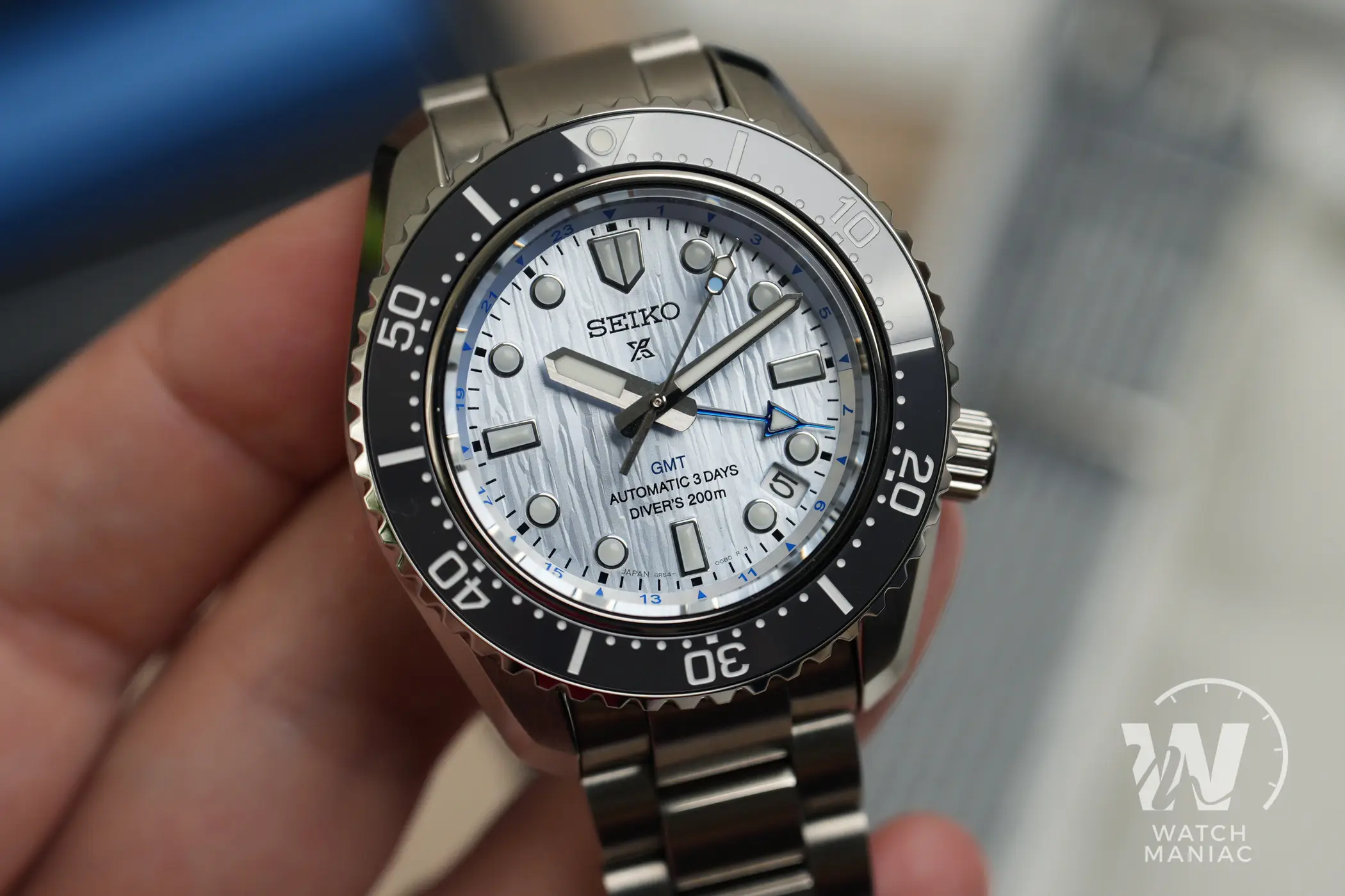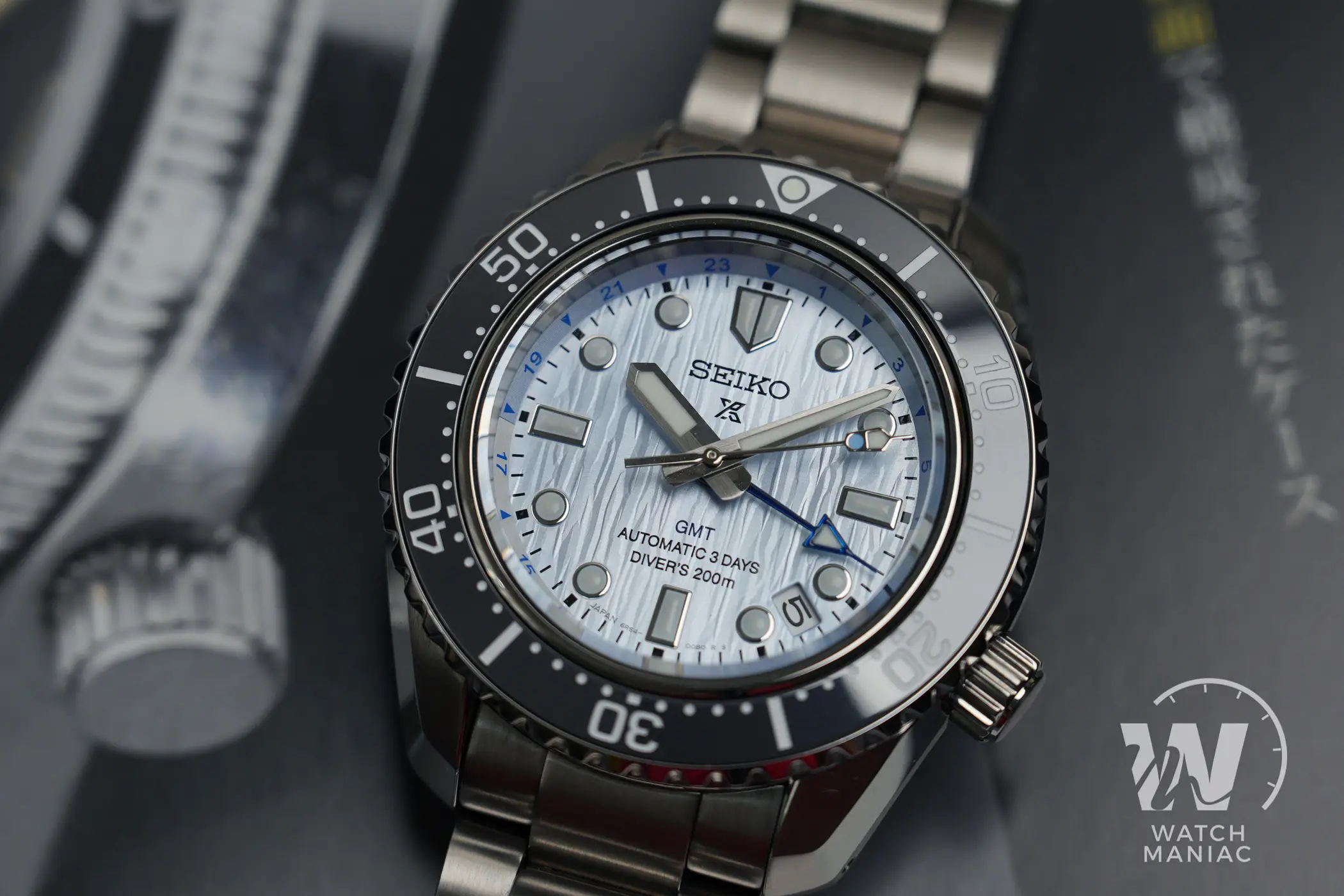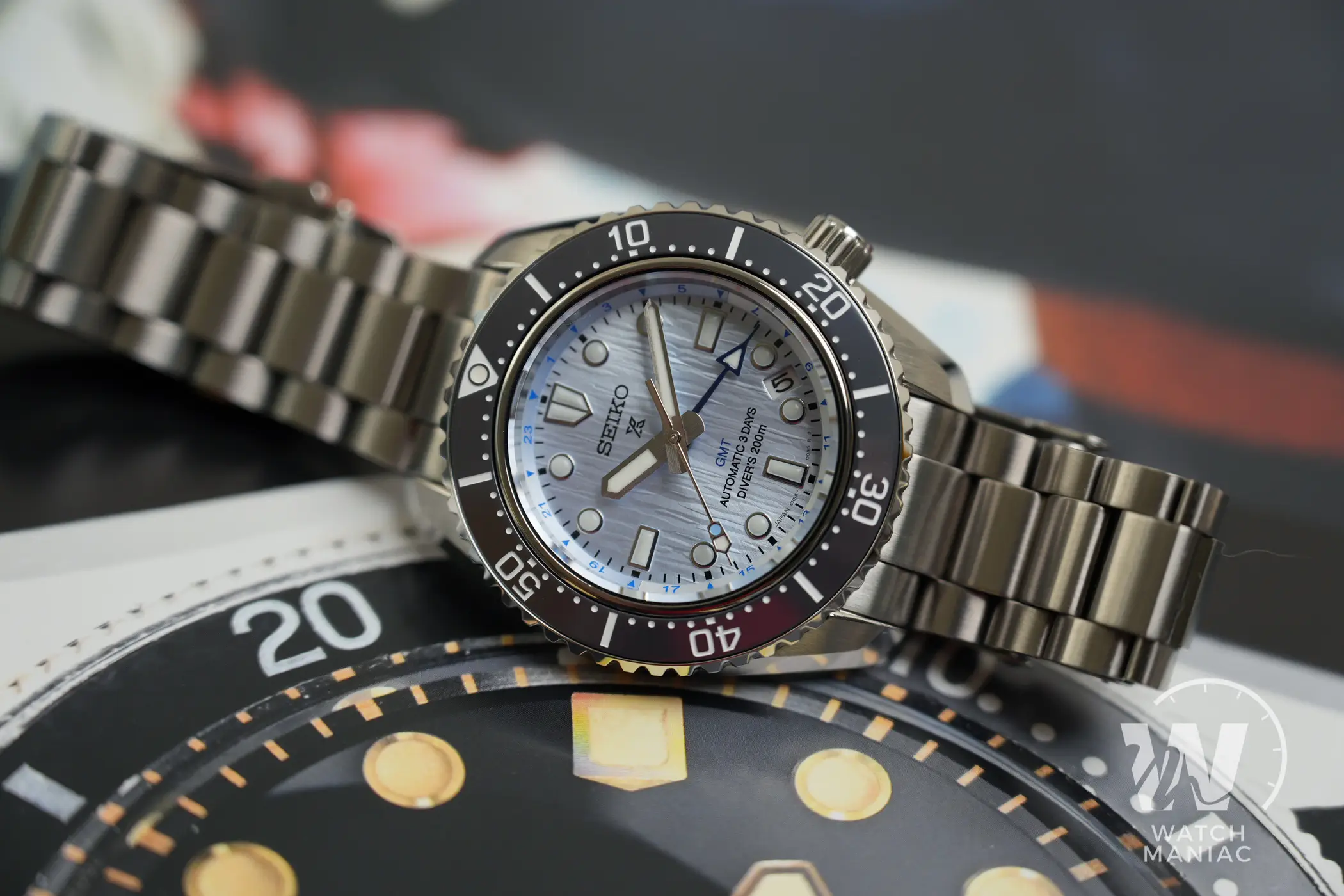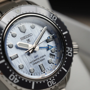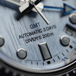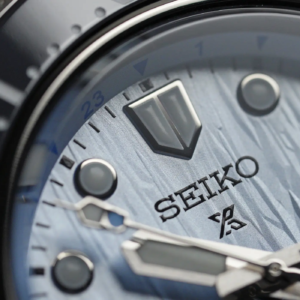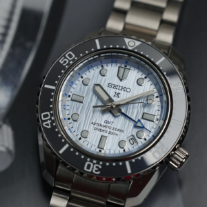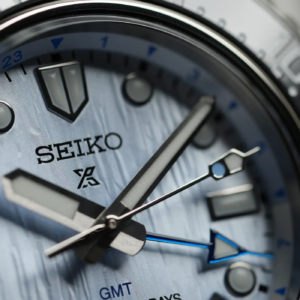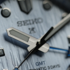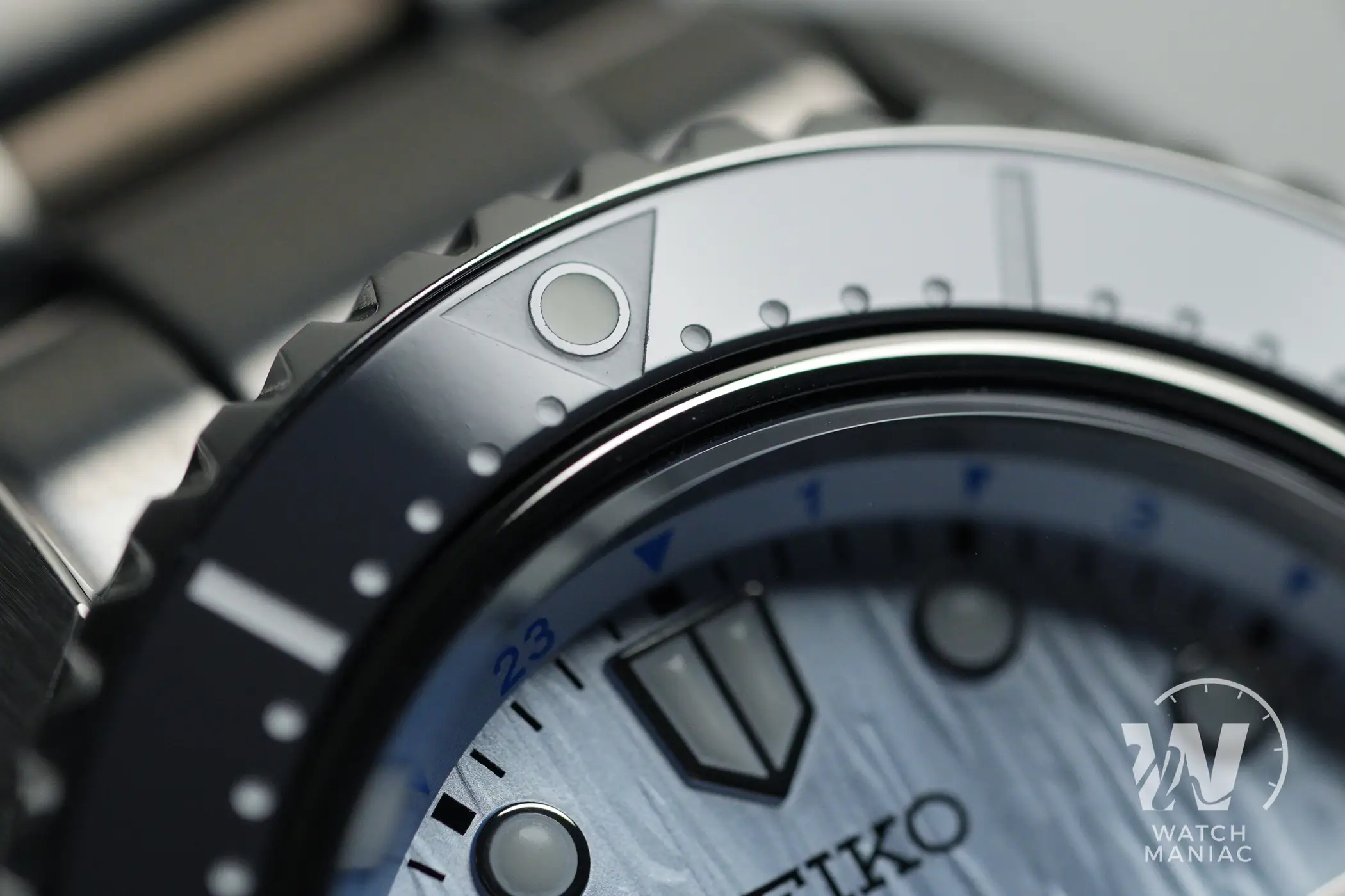 Unire in un unico orologio le caratteristiche di un diver con la complicazione GMT non porta sempre a risultati eccellenti. Spesso si deve scendere a compromessi, o sull’immediata leggibilità delle informazioni o sulla tipica funzionalità della ghiera dei tempi. Seiko ha saputo inserire l’indicazione del secondo fuso orario con grande maestria, lasciando ovviamente inalterata la ghiera girevole (altrimenti addio alla certificazione ISO!) e inserendo i riferimenti delle ore sul rehaut all’interno. Questo è diviso in due sezioni, diurna e notturna, da una lieve differenza cromatica. La sfera GMT è in colorazione blu elettrica e, nonostante Seiko continui ad optare per questo tipo di finitura verniciata anziché un più prestigioso trattamento termico, è comunque davvero gradevole da vedere.