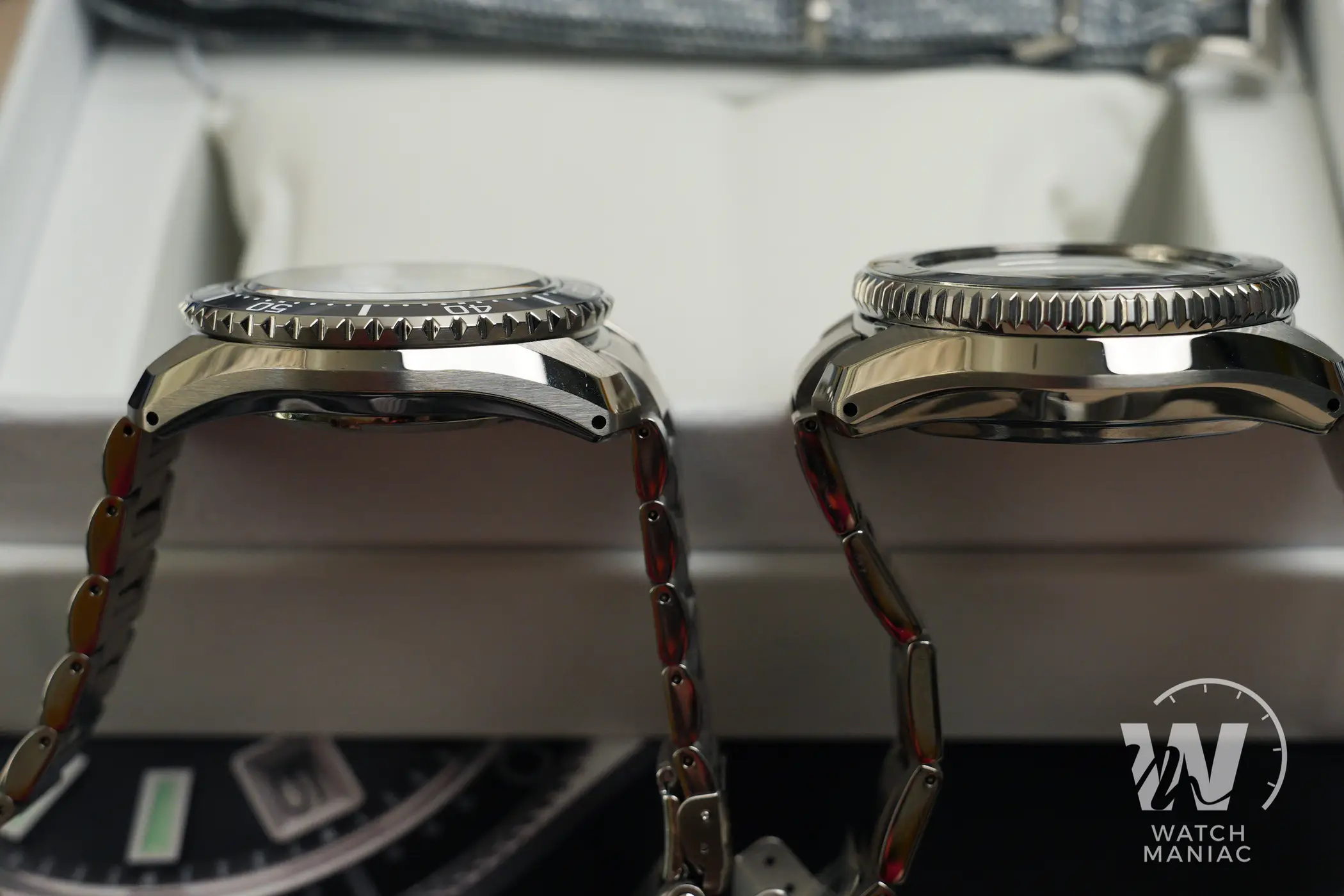 Il design della cassa è una meraviglia. Se si mette da parte per qualche istante il soprannome “Baby MarineMaster” e si prende in considerazione il modo in cui Seiko ha deciso di chiamare questi modelli, diventa chiara l’origine dello stile di questi nuovi diver. 1968 Modern Diver’s Re-interpretation fa riferimento al 6159, che non è stato il primo diver del produttore giapponese con cassa monoblocco (primato che spetta al 6215-7000) ma è stato sicuramente il più famoso e diffuso. Infatti è proprio a quella referenza lanciata nel 1968 che si ispira il MarineMaster 300m. Da amante di quelle linee, è praticamente impossibile non apprezzare questa cassa. Seiko ha fatto un lavoro eccellente per cercare di rendere più contemporaneo quel design così caratteristico, concentrandosi soprattutto su ergonomia e comodità rispetto ai fratelli maggiori con cassa monoblocco. Persino in questo caso che abbiamo a che fare con un GMT lo spessore complessivo è davvero molto contenuto, e il confronto con l’SBDX012 parla chiaro.