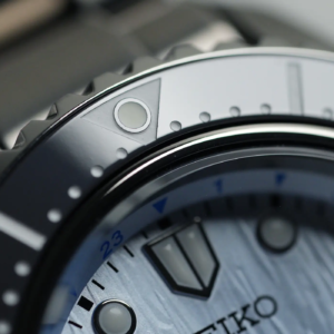 La ghiera è in acciaio con un inserto in ceramica. Anche questo, per i miei gusti, è più bello rispetto a quello del MarineMaster 300m. La finitura lucida è di buon livello e la colorazione grigia scura si abbina davvero bene all’azzurro del quadrante. La superficie antiscivolo merita poi di essere osservata alla lente macro e rivela una lavorazione certosina di classe superiore. Il meccanismo è in linea con quello di tanti altri diver di fascia media di Seiko, anche se su questo esemplare è forse fin troppo morbida e rischia di essere ruotata inavvertitamente.