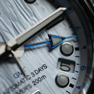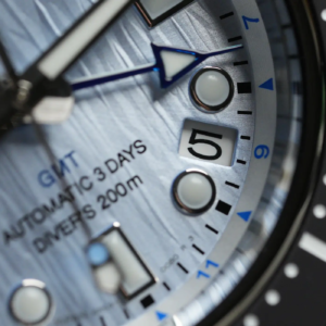 Al momento I baby MarineMaster GMT sono disponibili in 3 diverse configurazioni: SPB383J1 in nero, SPB381J1 in verde e poi appunto nell’allestimento Save the Ocean protagonista della recensione. Questo mi ha colpito proprio per la sua colorazione tenue sui toni dell’azzurro, che mancava nella mia collezione e che si discosta parecchio dall’immagine del classico MarineMaster 300m. La lavorazione superficiale è in linea con quella già utilizzata per altri diver del marchio in edizione Save the Ocean (SPB297J1, SPB299J1, SPB301J1 e SPB333J1). Questa aggiunge profondità al quadrante e gli dà una marcia in più. Chiaramente il rovescio della medaglia è che alla lunga possa stancare. Quindi è un’ottima scelta per variare un po’ se si hanno già altri diver da alternare al polso, mentre in caso contrario sarebbe meglio puntare sul nero o sul verde.