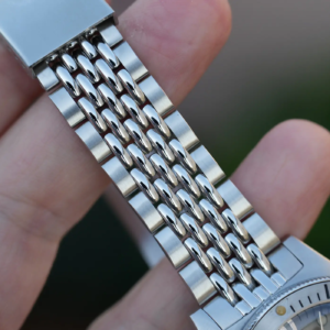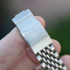 Il Super Squale può essere scelto in abbinamento con il cinturino in pelle in tinta con il quadrante o con il bracciale in acciaio. e in questo caso si tratta di un bel chicchi di riso con terminali specifici per la cassa. È senza dubbio un design molto diffuso anche per altri diver ispirati a modelli vintage, da Doxa ad Aquastar, da Nivada alle reinterpretazioni più moderne di Baltic. Con linee di questo genere è praticamente impossibile che non si adatti bene stilisticamente a una tipica cassa da skin diver. La qualità del bracciale montato da Squale è piuttosto buona, con maglie solide e allo stesso tempo flessibili le une sulle altre (tra l’altro con perni a vite). La chiusura di tipo standard, con il logo inciso all’esterno sulla scatoletta e 4 fori per la microregolazione, integra al suo interno anche l’estensione per la muta.