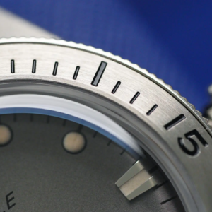 La ghiera ha un inserto in acciaio spazzolato con numeri incisi nello spessore e riempiti di smalto nero. Pur essendo perfettamente in linea con l’anima vintage del Super Squale, il dot a a ore 12 ha una colorazione anche fin troppo scura se confrontata a quella di indici e sfere. La zigrinatura antiscivolo è abbastanza efficace e la presa è facilitata dalla lieve sporgenza rispetto alla carrure. La rotazione è fluida e i 120 scatti sono molto precisi.