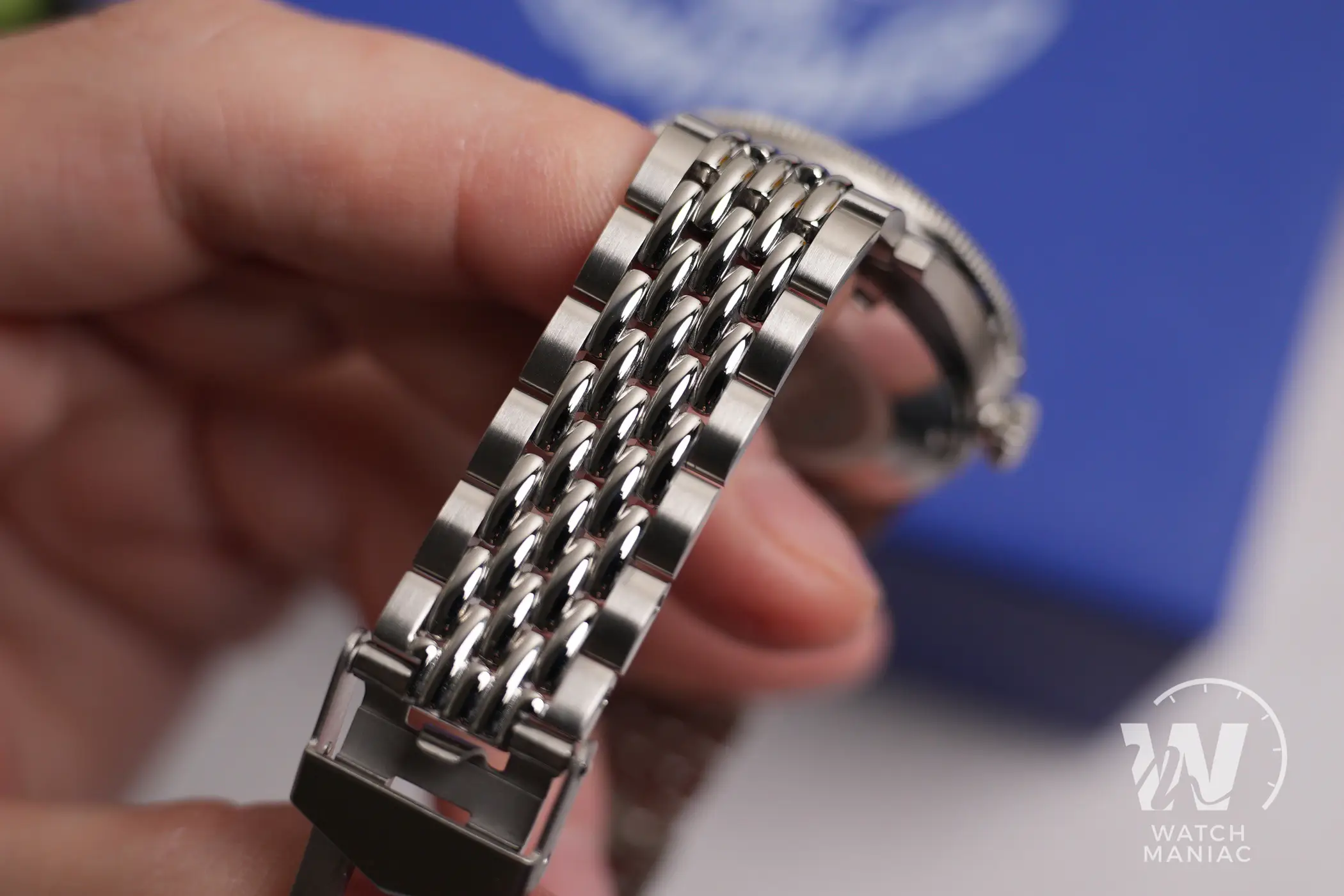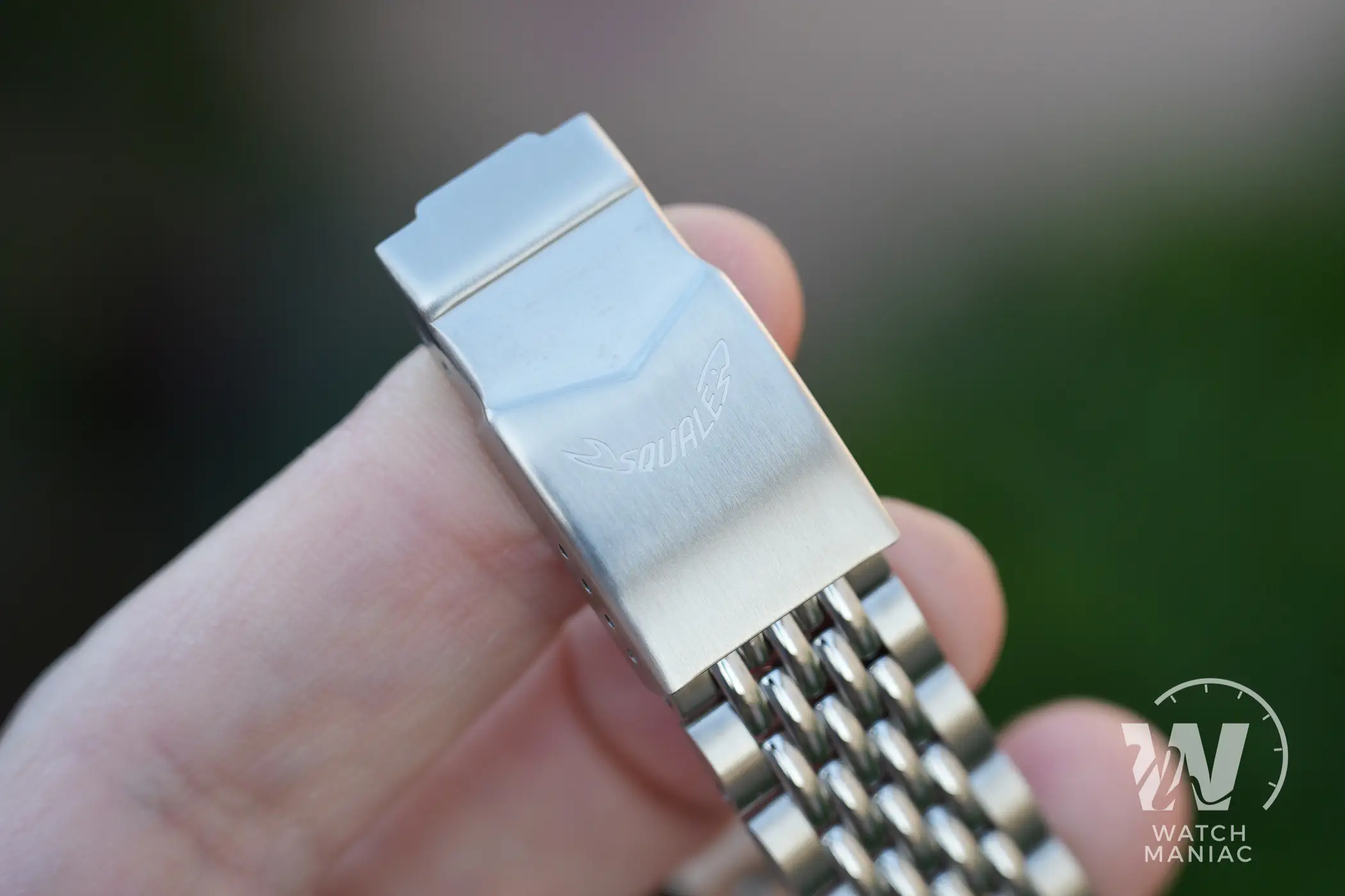Il Super Squale può essere scelto in abbinamento con il cinturino in pelle in tinta con il quadrante o con il bracciale in acciaio. e in questo caso si tratta di un bel chicchi di riso con terminali specifici per la cassa. È senza dubbio un design molto diffuso anche per altri diver ispirati a modelli vintage, da Doxa ad Aquastar, da Nivada alle reinterpretazioni più moderne di Baltic. Con linee di questo genere è praticamente impossibile che non si adatti bene stilisticamente a una tipica cassa da skin diver. La qualità del bracciale montato da Squale è piuttosto buona, con maglie solide e allo stesso tempo flessibili le une sulle altre (tra l’altro con perni a vite). La chiusura di tipo standard, con il logo inciso all’esterno sulla scatoletta e 4 fori per la microregolazione, integra al suo interno anche l’estensione per la muta.
