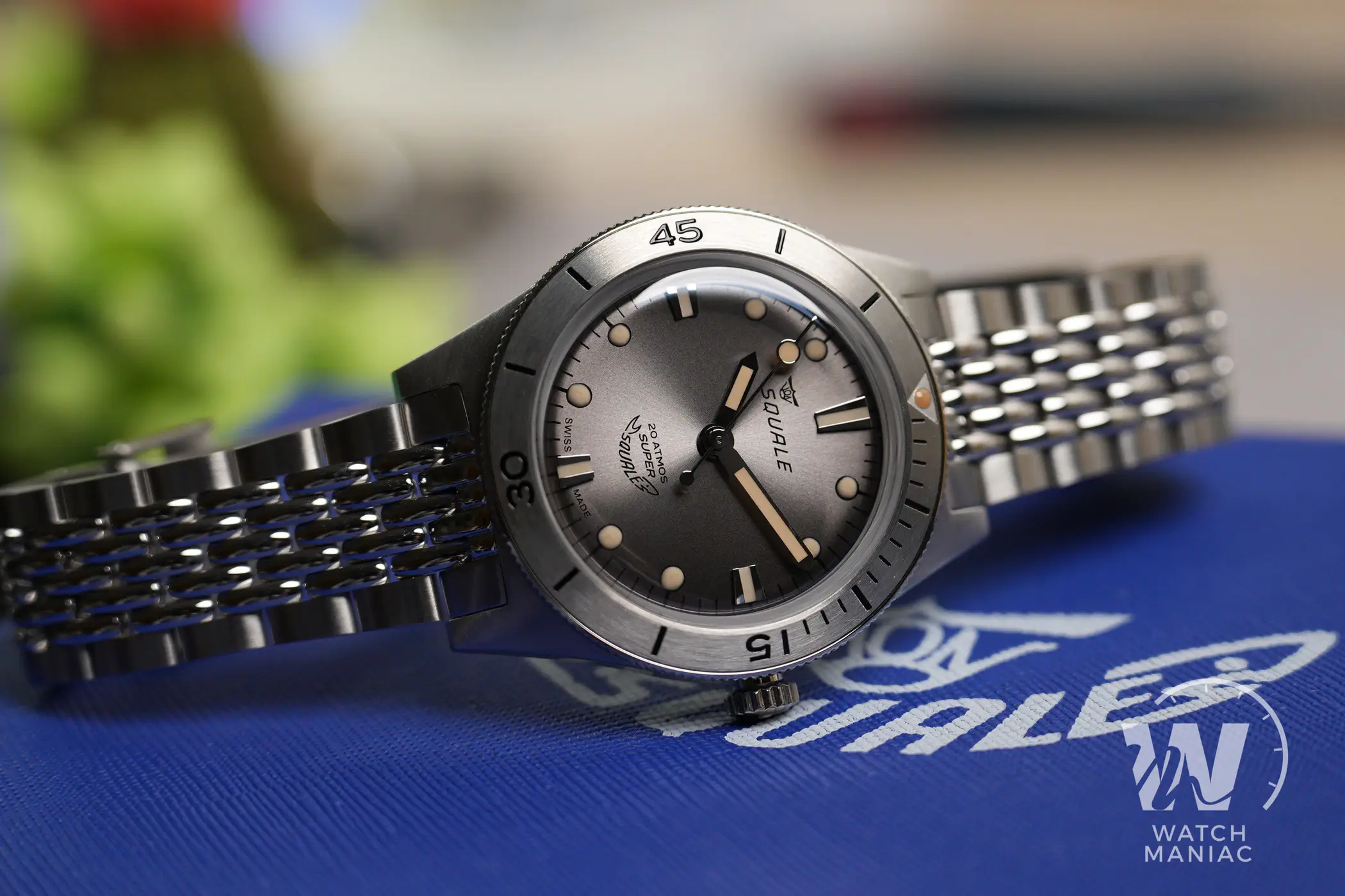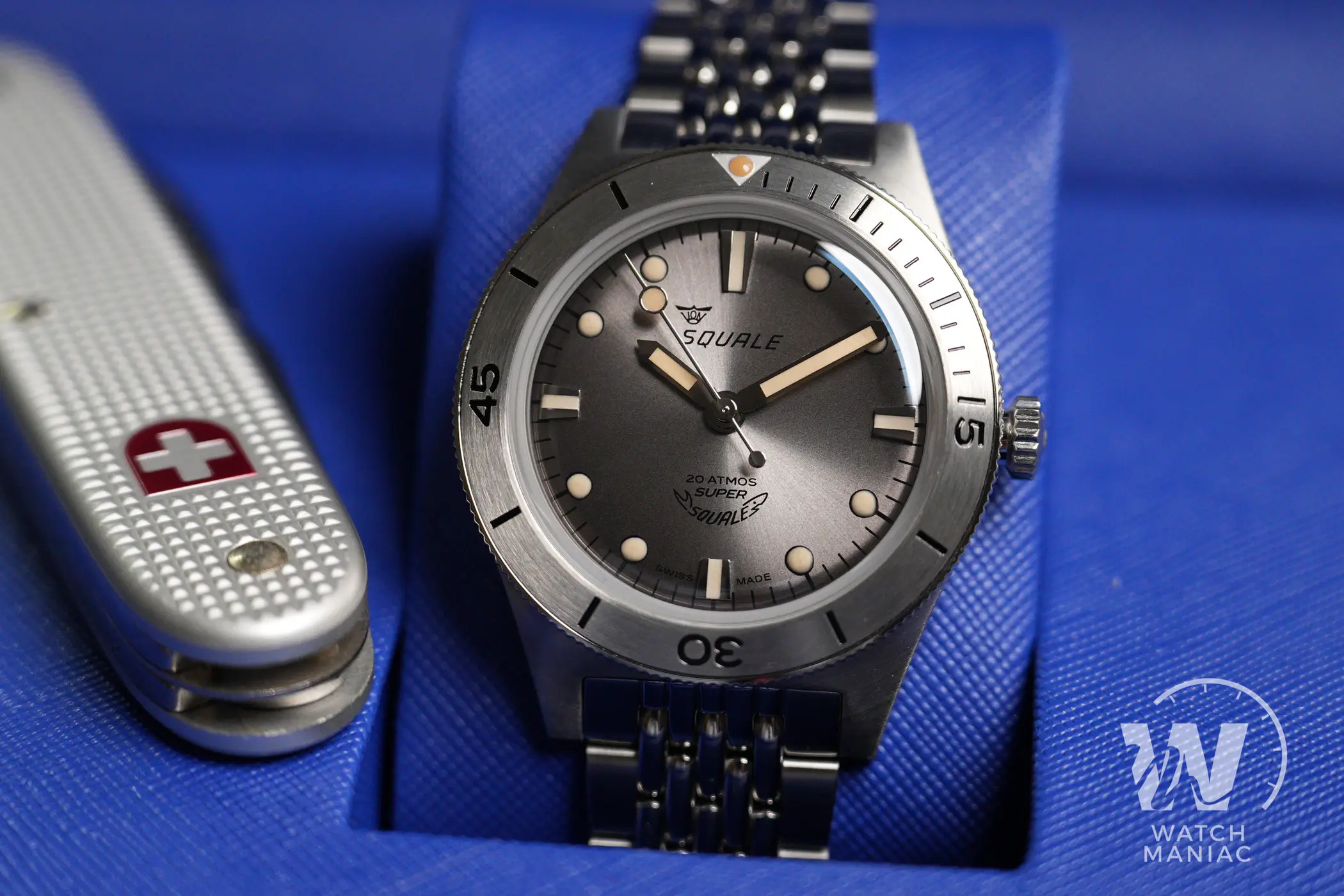 Il corredo è quello che accompagna tutte le altre referenze più recenti di Squale, con il cofanetto rivestito in simil pelle con effetto saffiano in colorazione blu elettrica. All’interno troviamo un mini-manuale di istruzioni e la card della garanzia. Al momento sono presenti a catalogo 5 varianti diverse del Super Squale, disponibili a loro volta con bracciale in acciaio o con cinturino in pelle, per un totale di 10 possibili configurazioni. Le più ispirate ai modelli vintage sono senza dubbio quelle con quadrante marrone e quadrante grigio, ed è proprio quest’ultimo il protagonista della recensione.