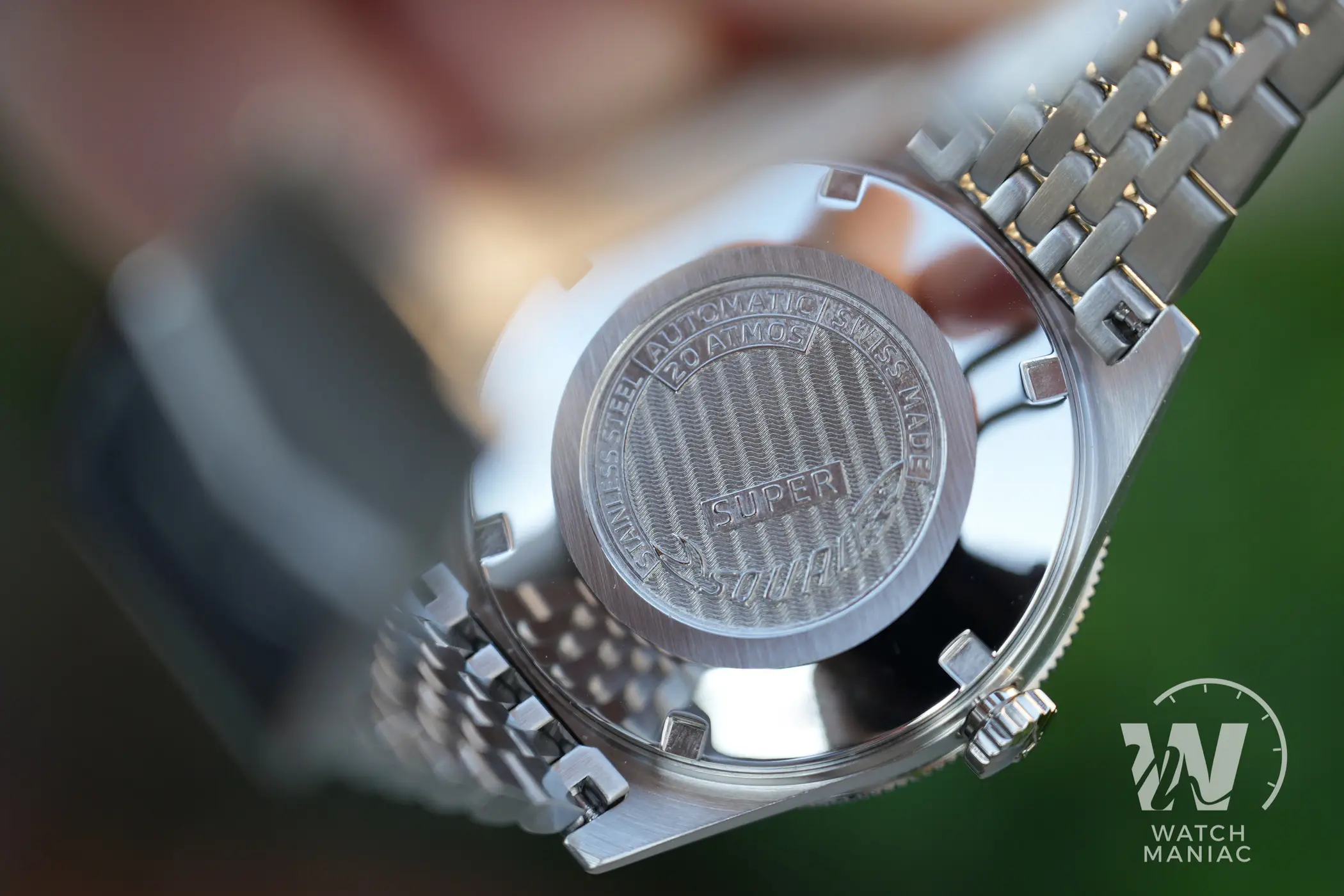 La cassa si inserisce alla perfezione nel filone stilistico tipico degli skin diver anni ’60, sia per quanto riguarda il design che per quanto riguarda le sue proporzioni compatte. Le anse sono squadrate nella parte terminale e sono leggermente curvate verso il basso. La carrure è sottile e visto di profilo il Super Squale spicca per il suo spessore limitato nonostanti resti comunque un diver resistente fino a 200m di profondità. La finitura è interamente satinata, sia sulla parte superiore delle anse che sui fianchi, con un livello qualitativo che non delude neppure se osservato con la lente macro.