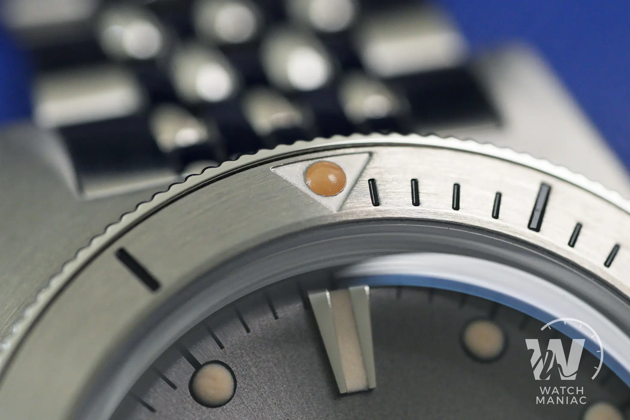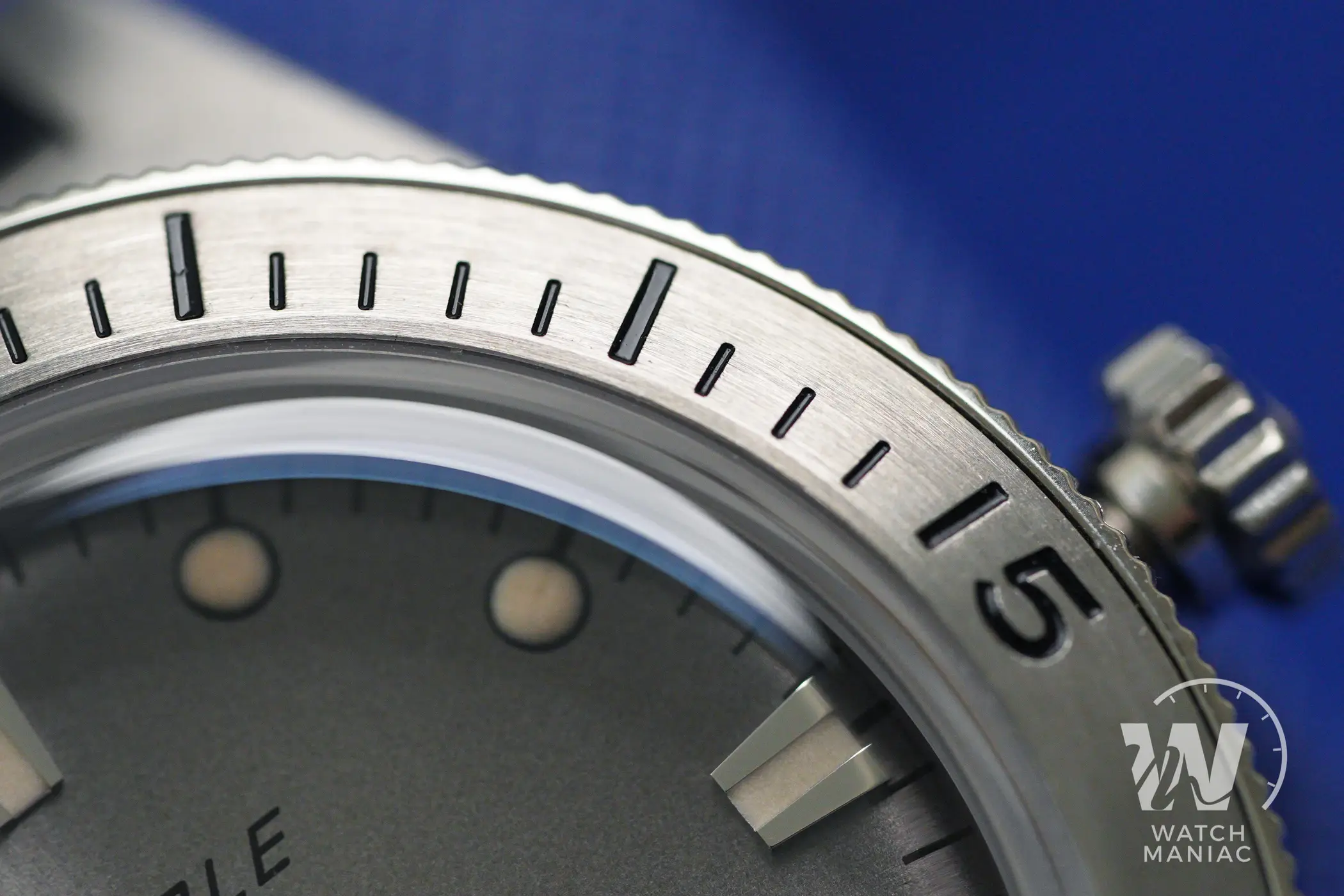 La ghiera ha un inserto in acciaio spazzolato con numeri incisi nello spessore e riempiti di smalto nero. Pur essendo perfettamente in linea con l’anima vintage del Super Squale, il dot a a ore 12 ha una colorazione anche fin troppo scura se confrontata a quella di indici e sfere. La zigrinatura antiscivolo è abbastanza efficace e la presa è facilitata dalla lieve sporgenza rispetto alla carrure. La rotazione è fluida e i 120 scatti sono molto precisi.